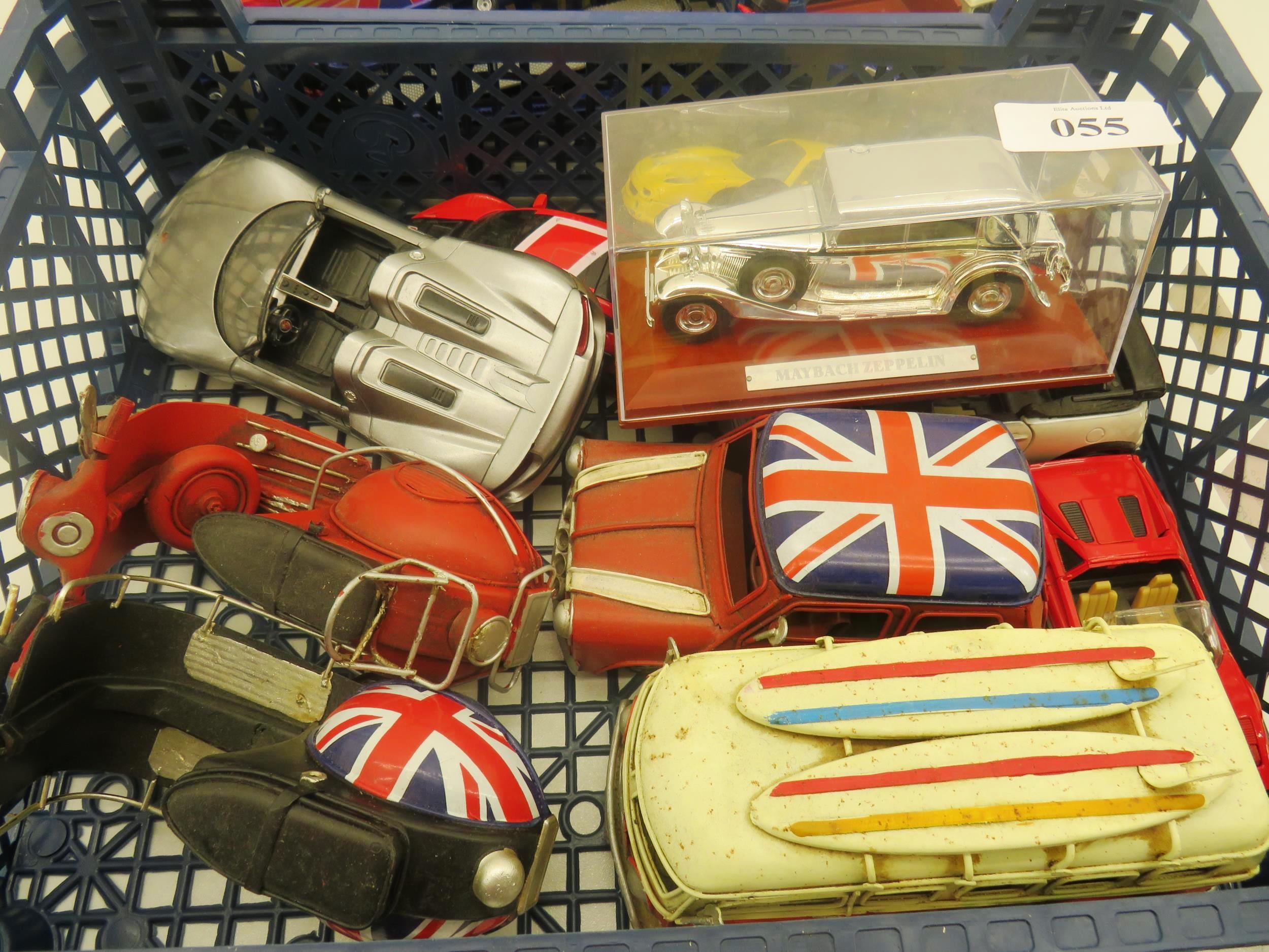 TRAY OF CARS, BIKES TWO VESPA, MAYBACH SEPPLELIN, MINI, AUDI SPORT, FERRARI, VW CAMPER, PORCHE SPIDER