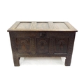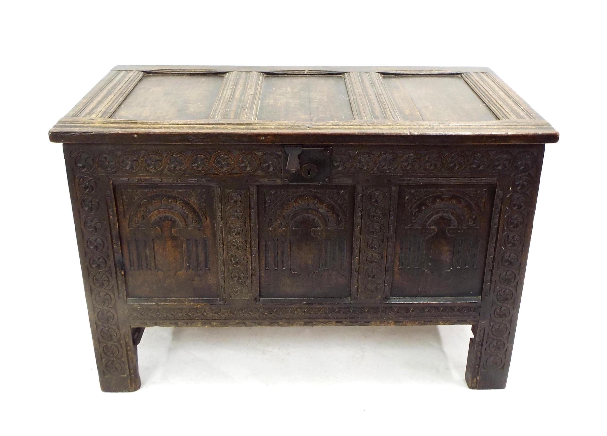 Small 17th century oak coffer, with a triple panelled arcade...