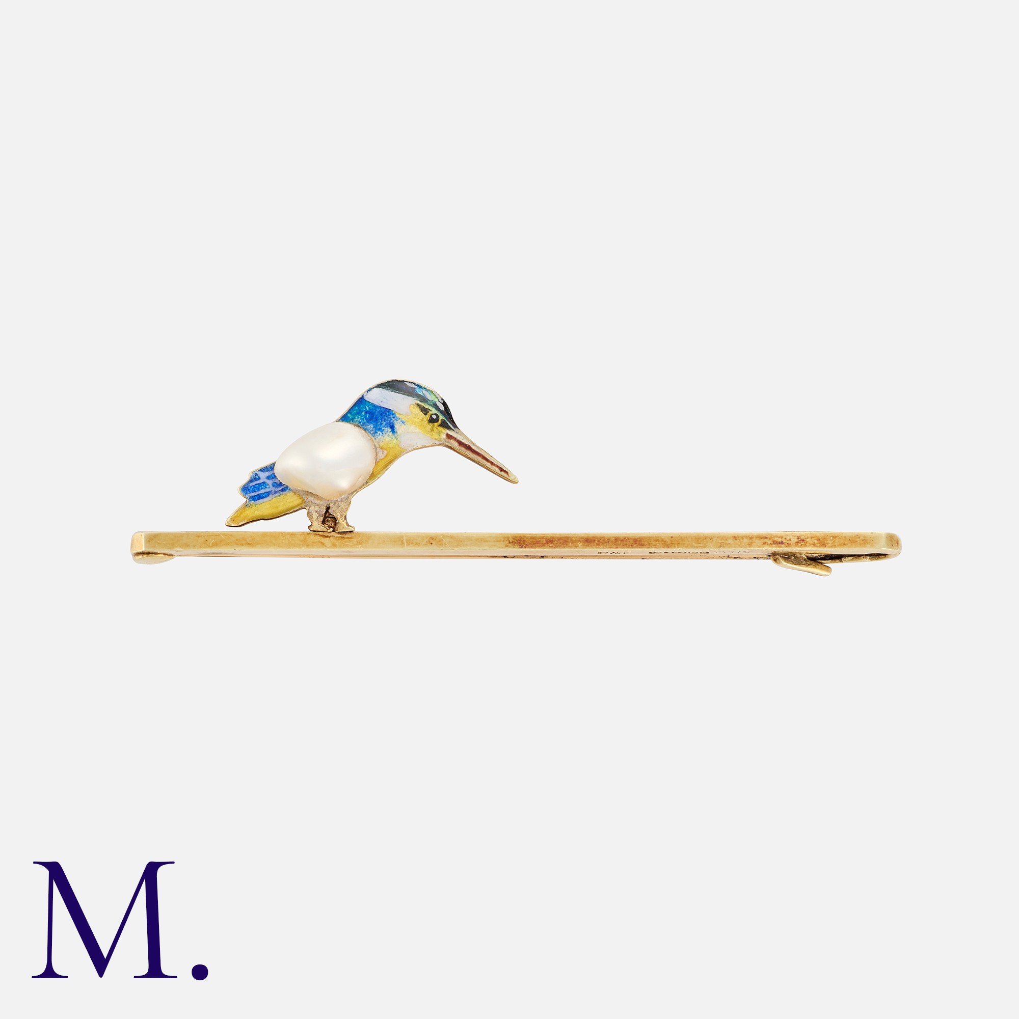 An Enamel and Pearl Kingfisher Brooch in 14k yellow gold, designed as a bar set with a kingfisher, set with a pearl to the body, with coloured enamel decoration. Stamped 14, 585.