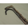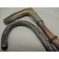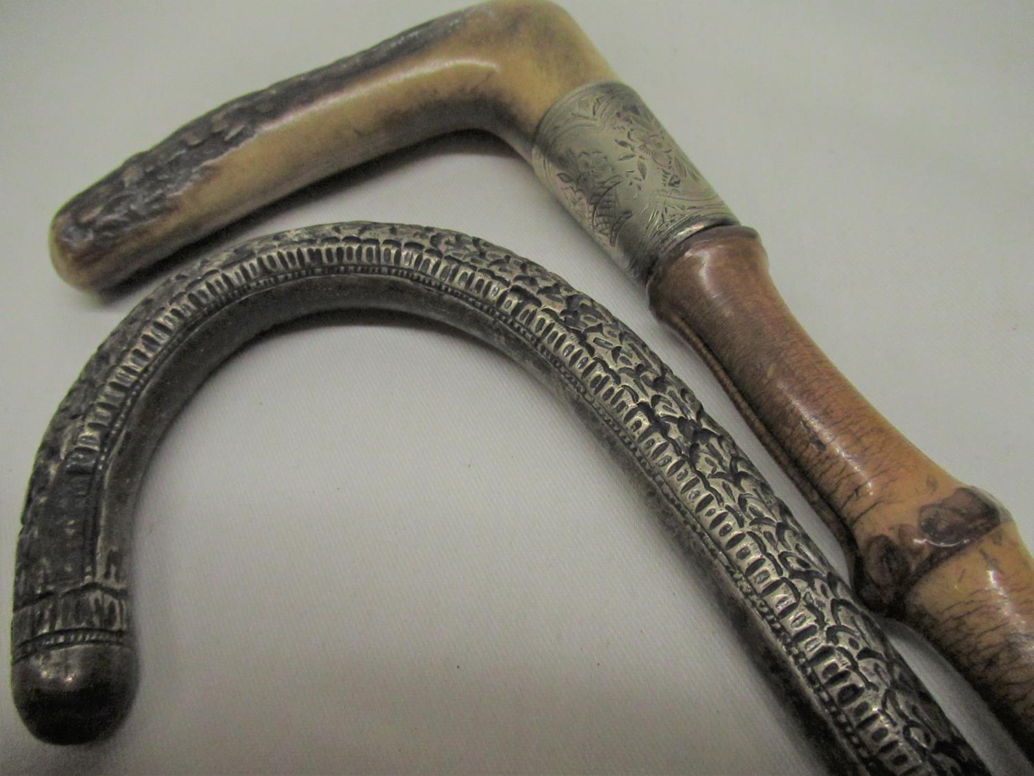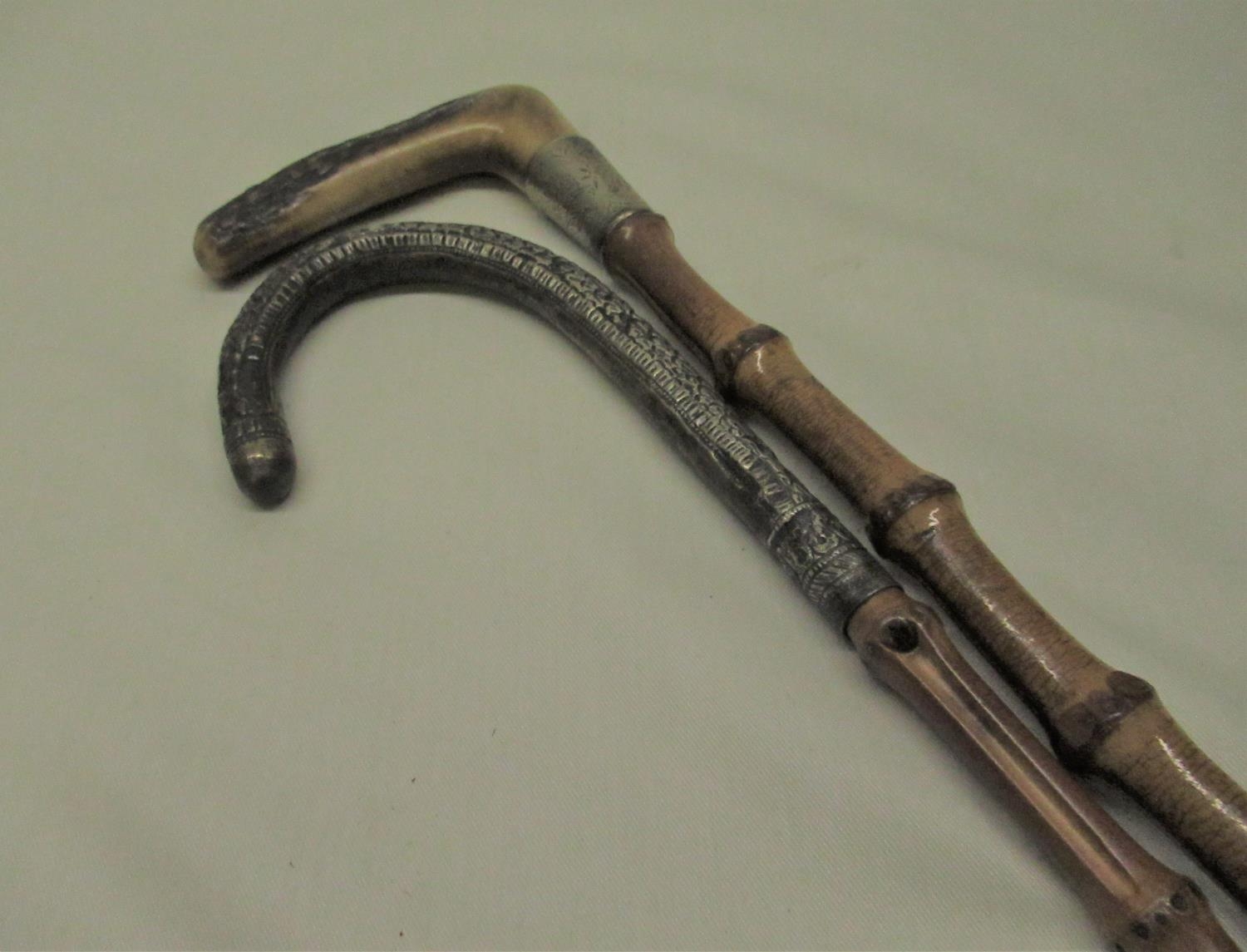 C20th bamboo walking cane with white metal handle and metal ferrule L86cm another similar with horn handle and EPNS collar, L85cm (2)