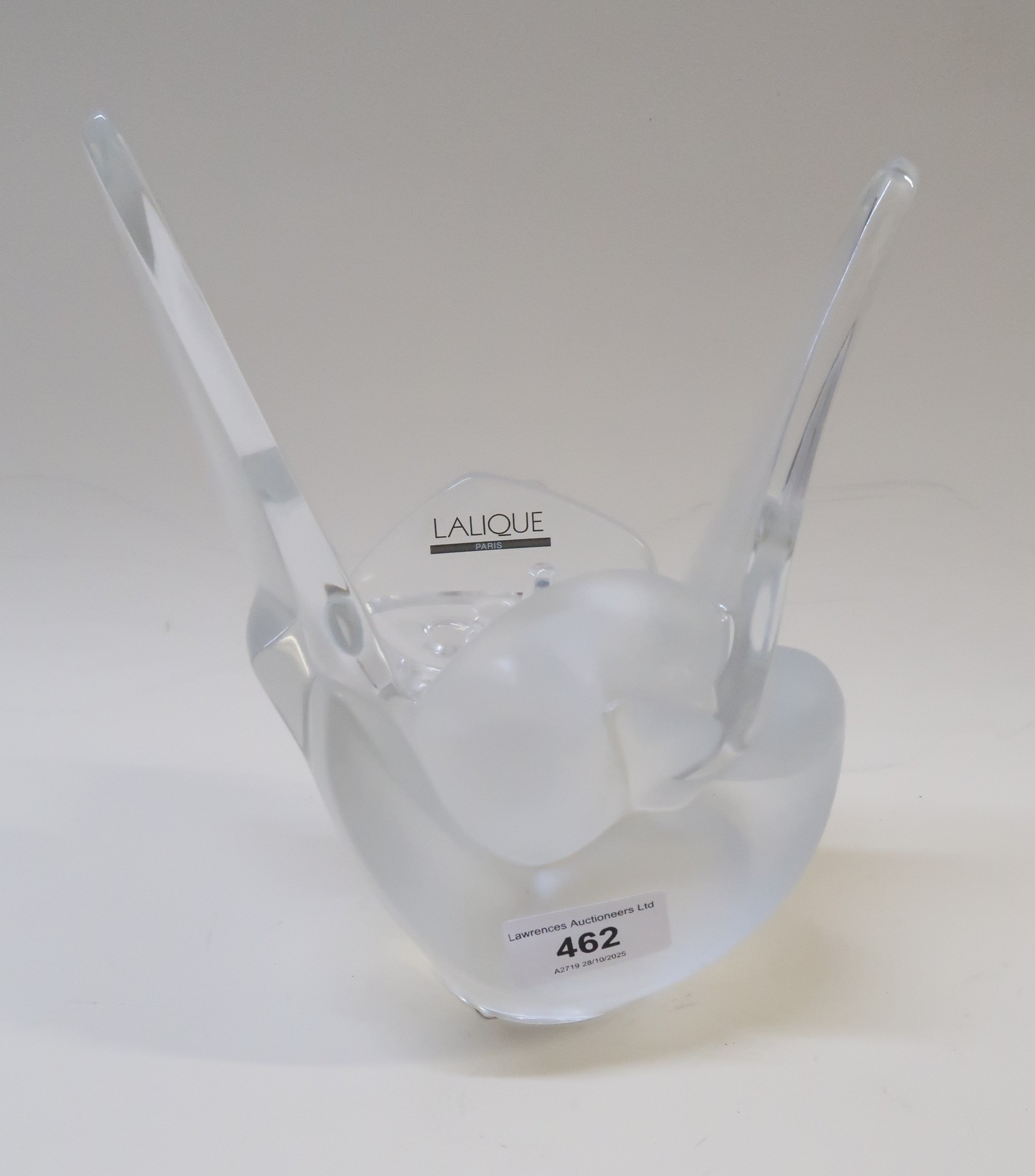 Lalique Sylvie frosted glass vase in the form of two birds with flower holder, etched mark to the base, 22cm high, with original presentation box