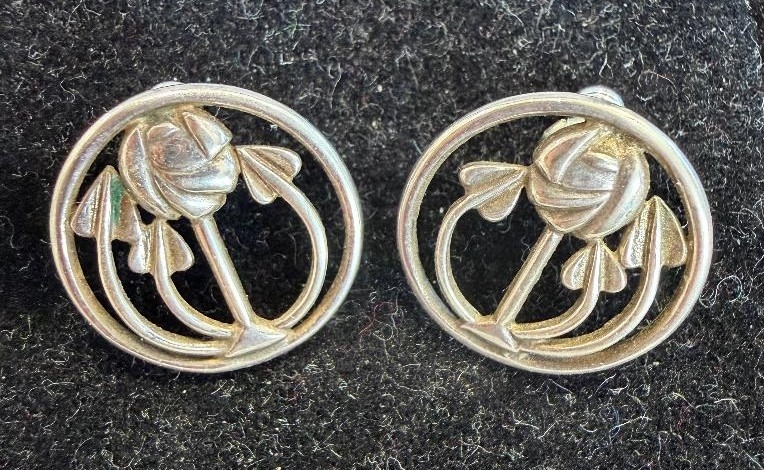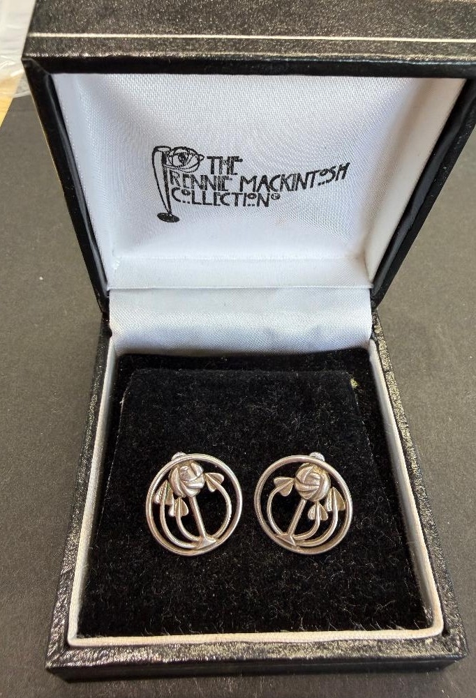 Jewellery : Rennie Mackintosh silver earrings in contemporary box, classic Scottish design hall marked CJL