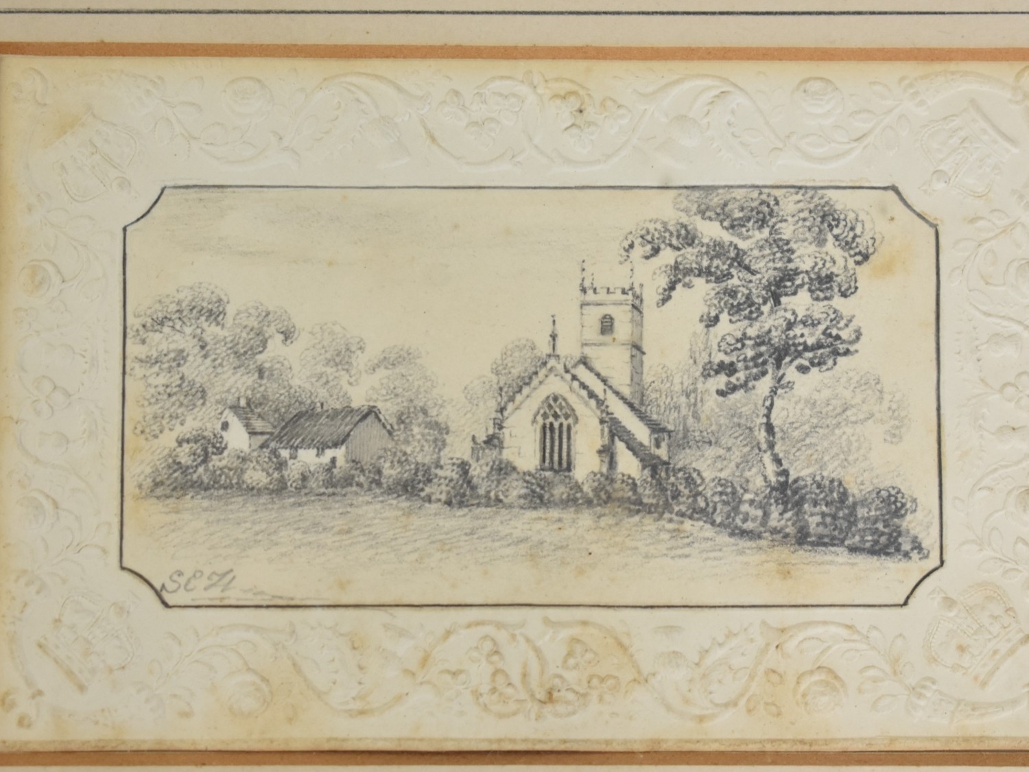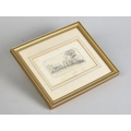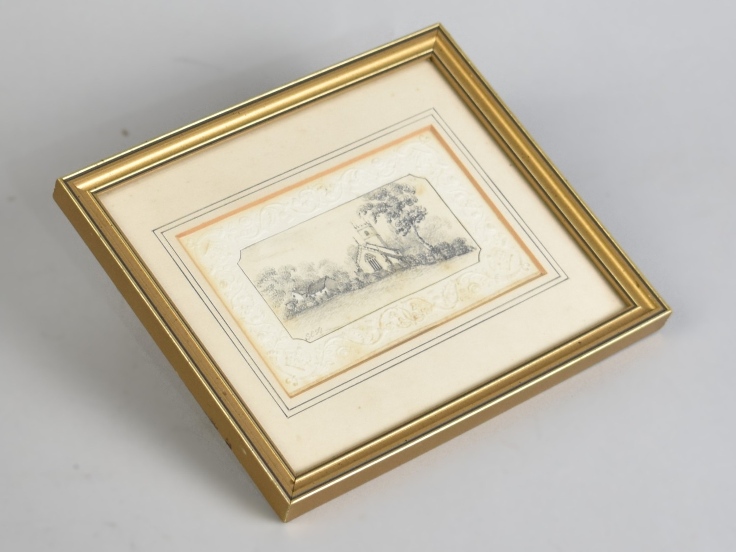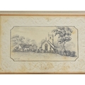 A Framed Pencil Drawing of a Church, 13x9cms