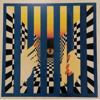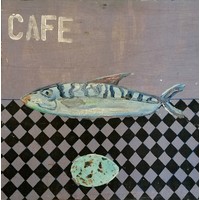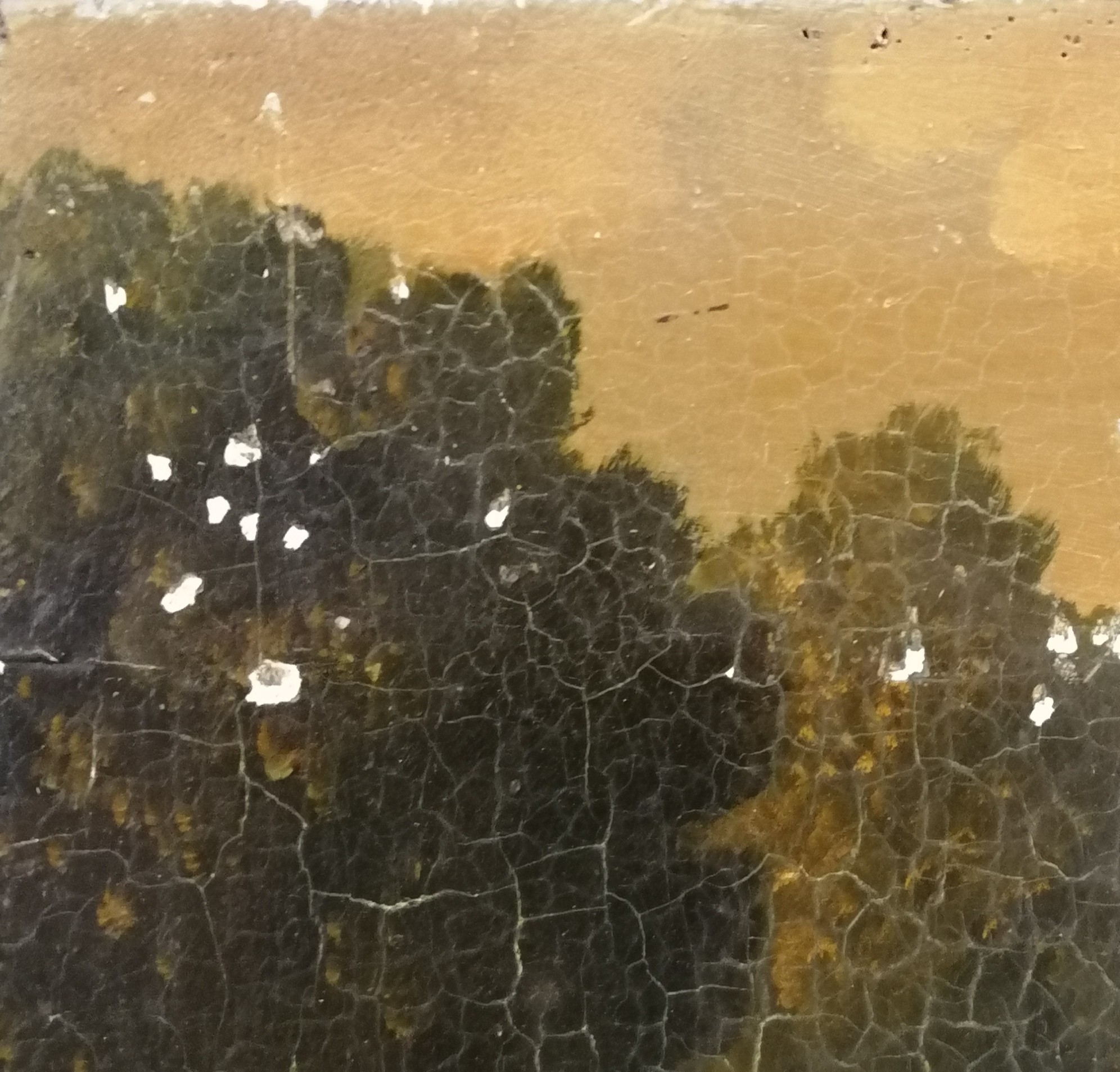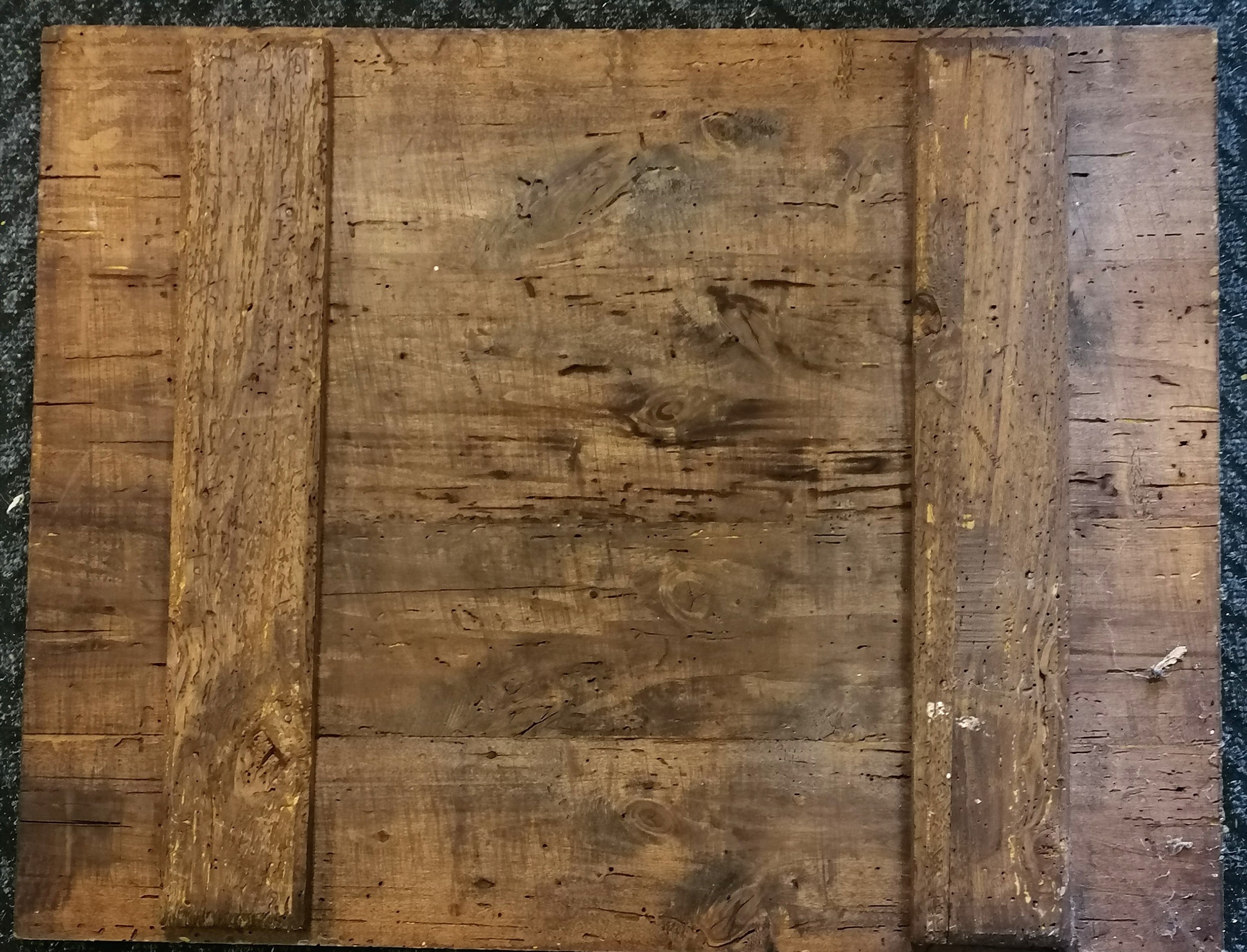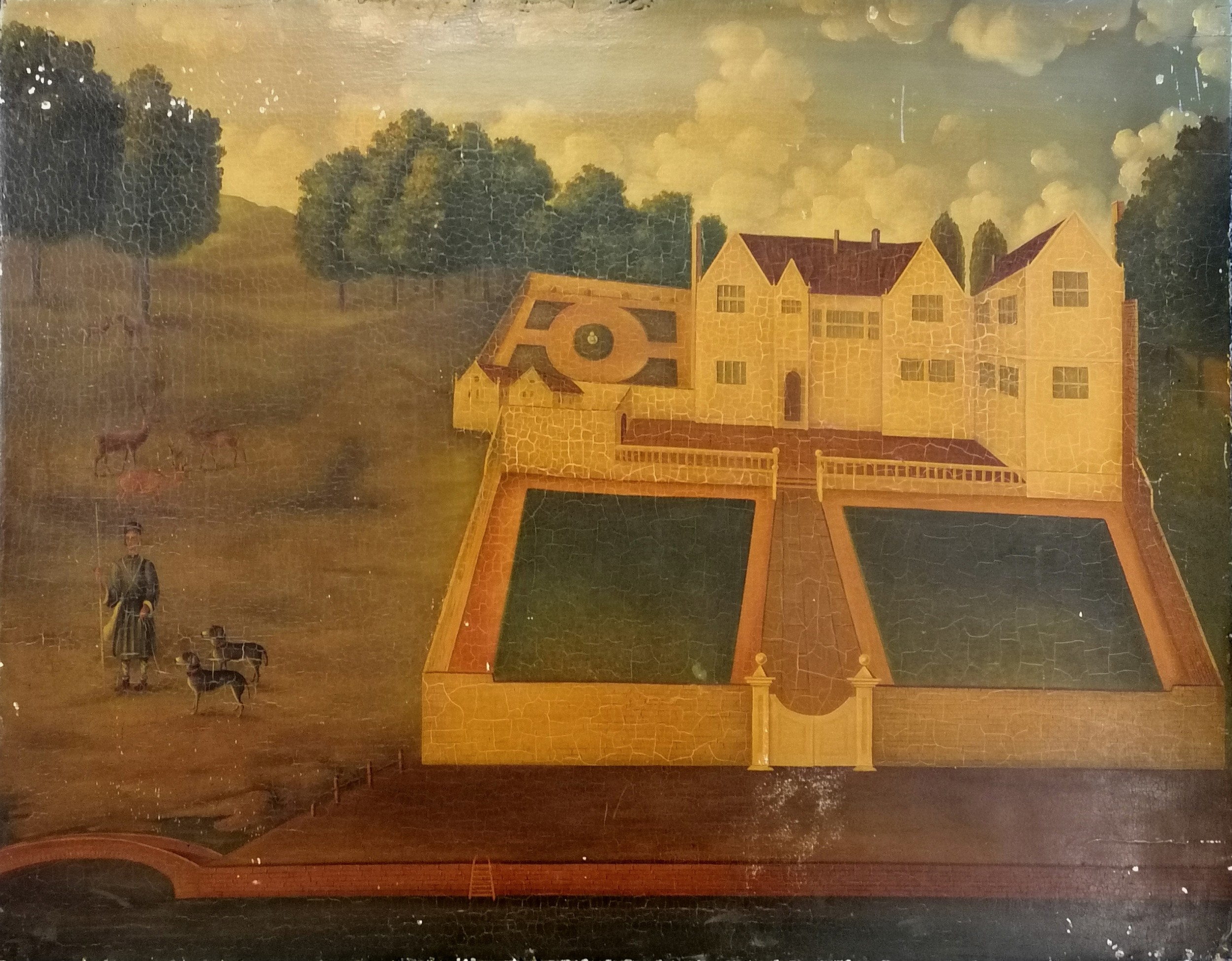Italian naive painting of a mansion with figural & animal detail on an old wooden panel - 62.5cm x 80cm ~ slight losses to painting