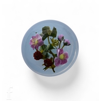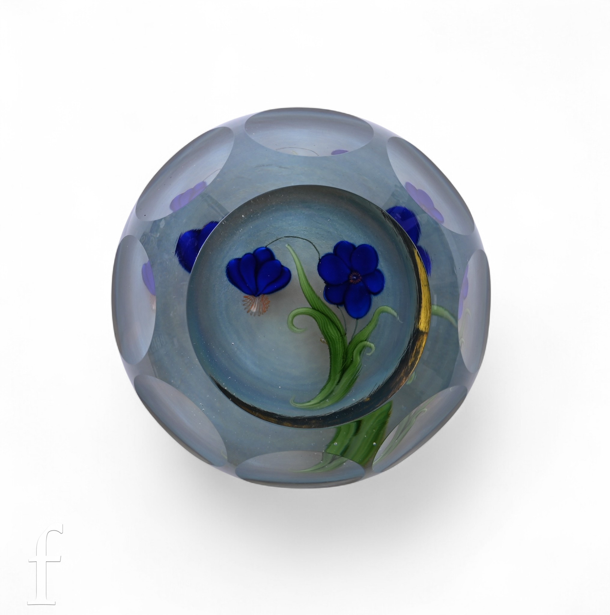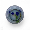 A 20th Century Lundberg Studios large glass paperweight, internally decorated with two stylised lamp work blue flowers on green stems suspended above a pale blue mottled ground, all cased in clear crystal, with a row of facet cuts before a face cut top, scratch signed, dated 1987, artists proof, diameter 9cm.
