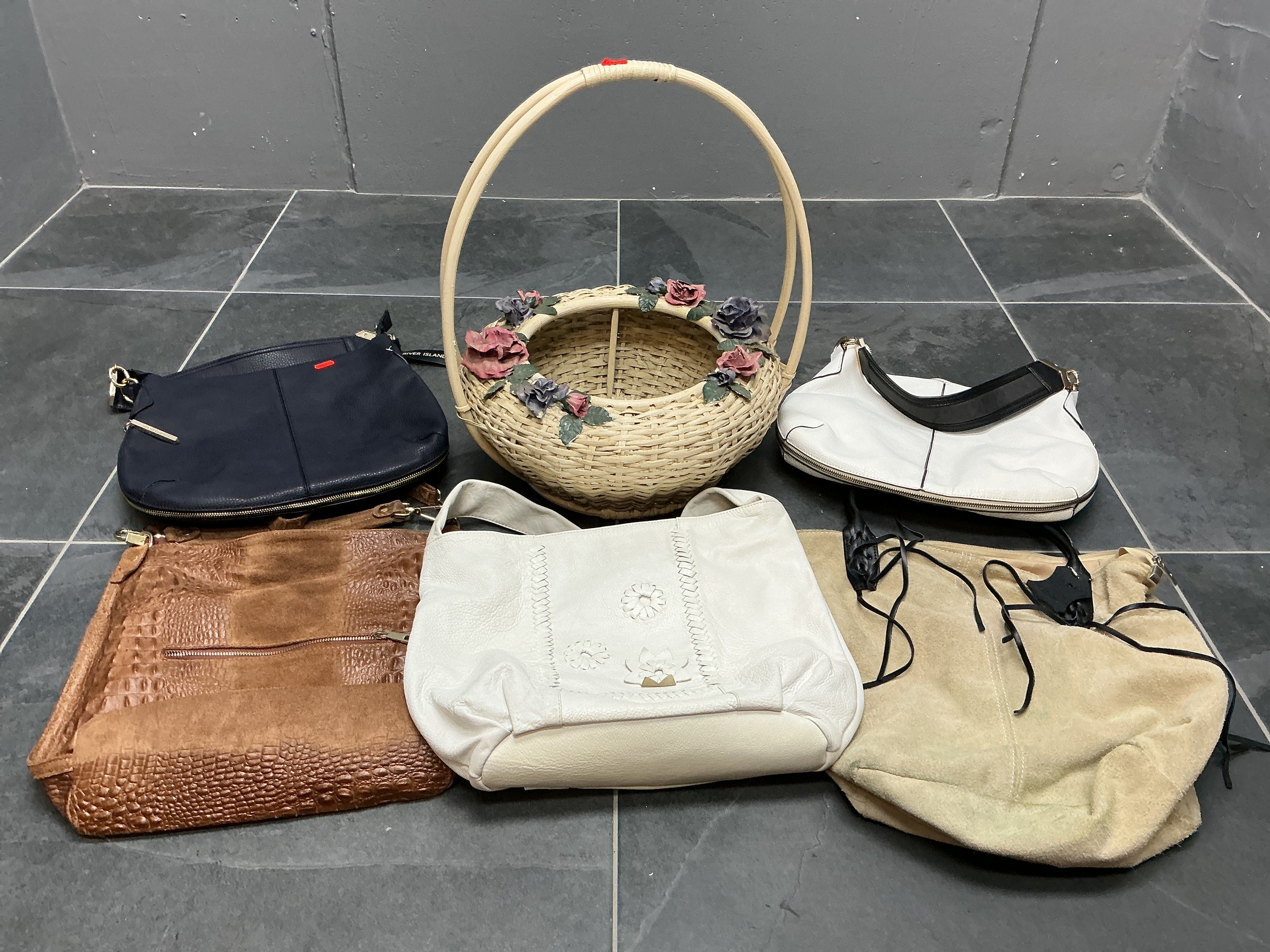 Five Modern Ladies Designer Bags, With Floral Wicker Basket - Includes River Island, Leather Crocodile Skin Style, Vimoda, And More
