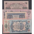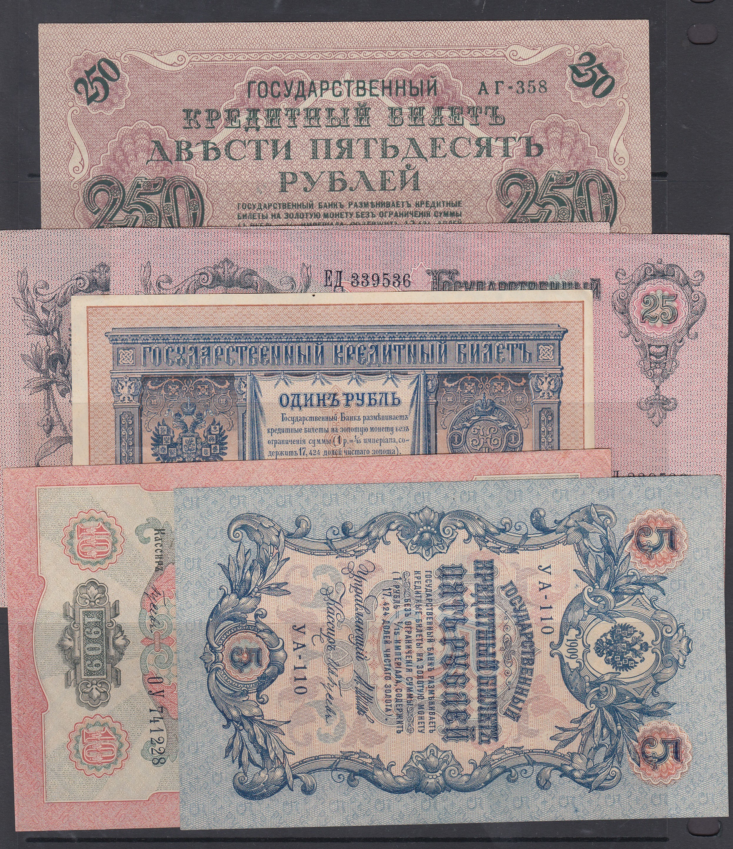 A group of six Russian banknotes, including 1898 1 Ruble, 1909 5/10/25 Rubles and 1917 250 Rubles all in good condition