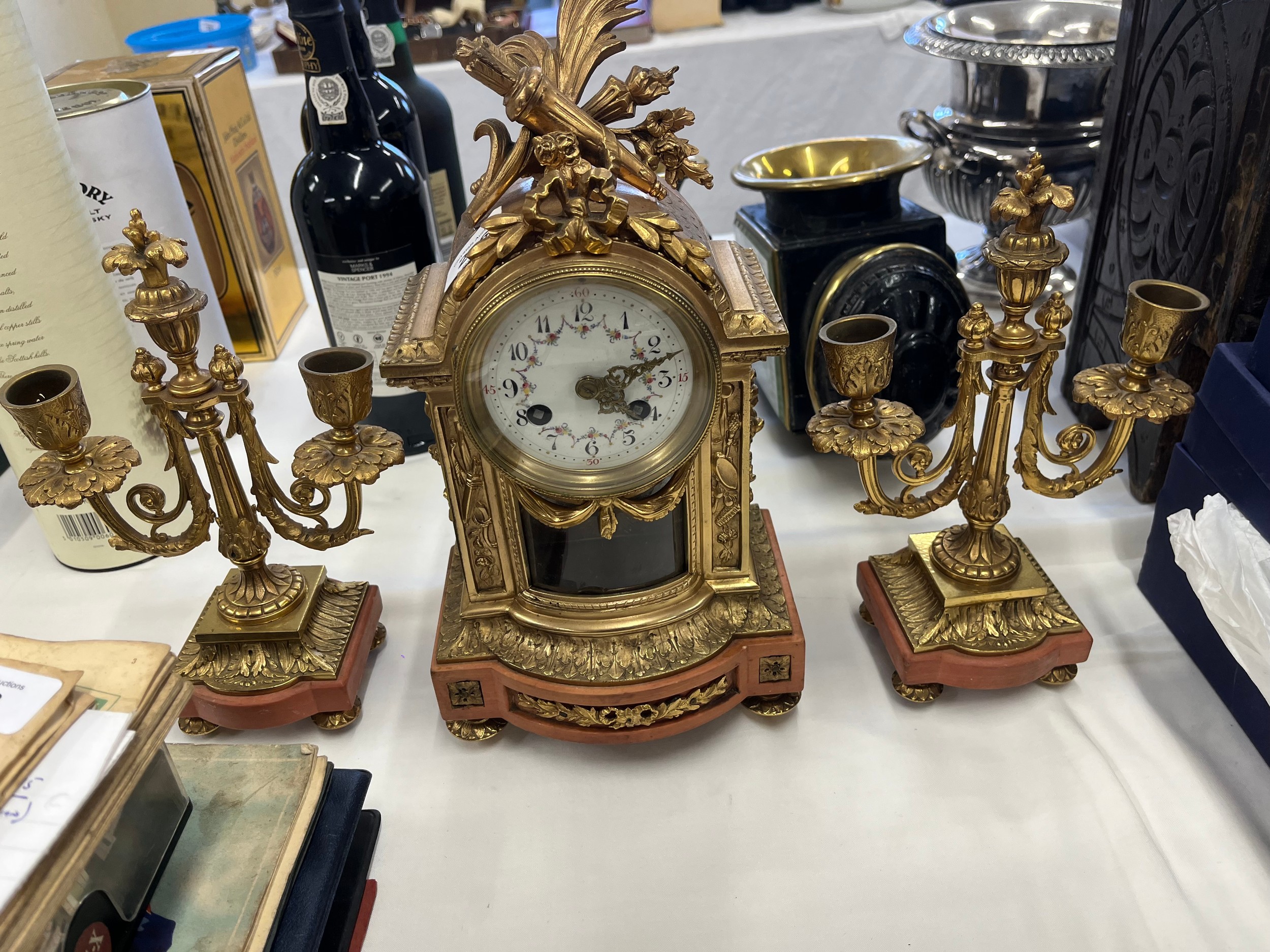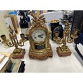 Late 19thC French Three Piece Ormolu and Marble Mantel Clock Garniture With Painted White Enamel Dial Chiming on a bell, Sun Mask Pendulum, Including a Pair of Twin Branch Candelabra, Ht. 11ins