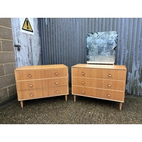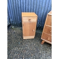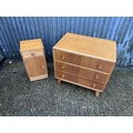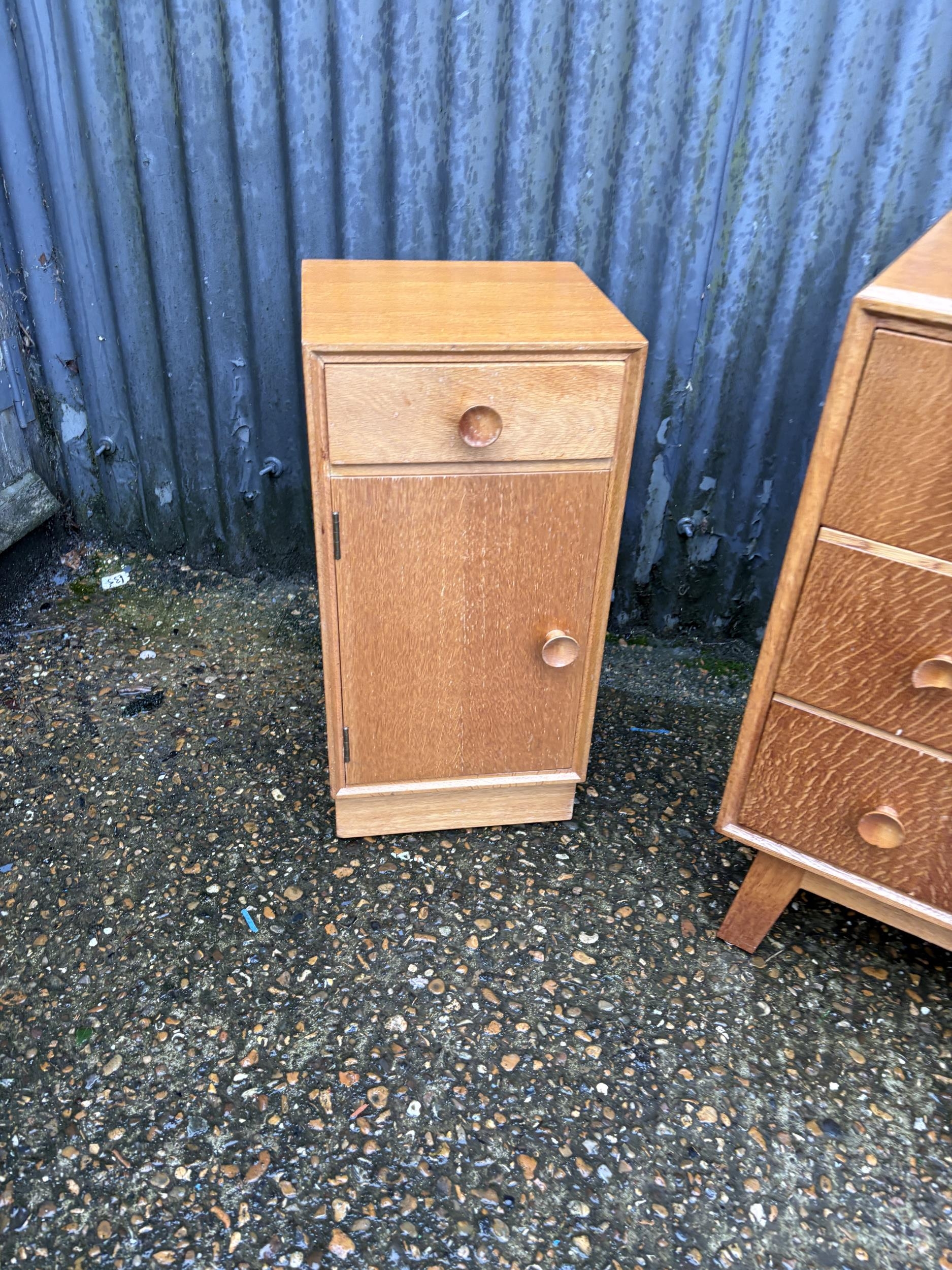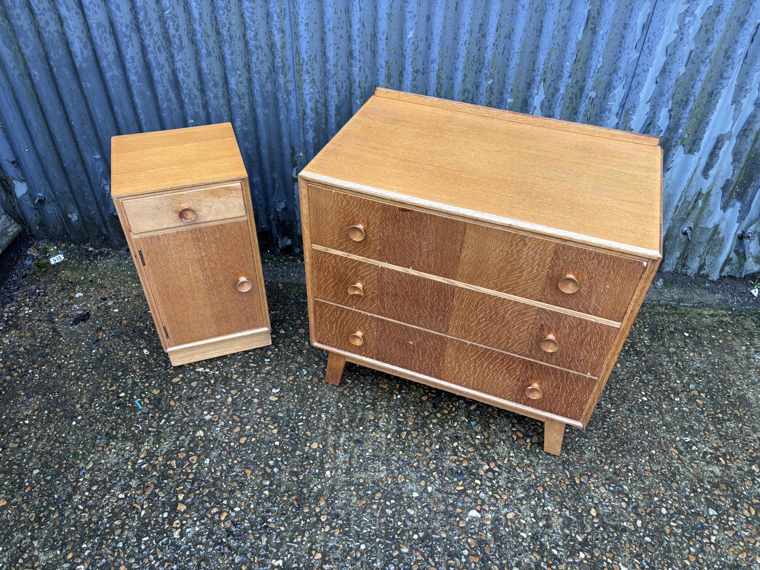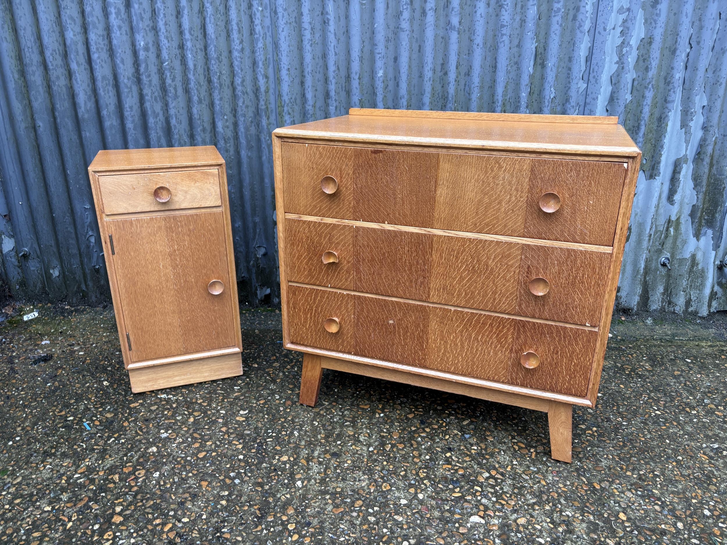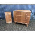 A mid century light oak chest of three drawers together with matching bedside