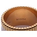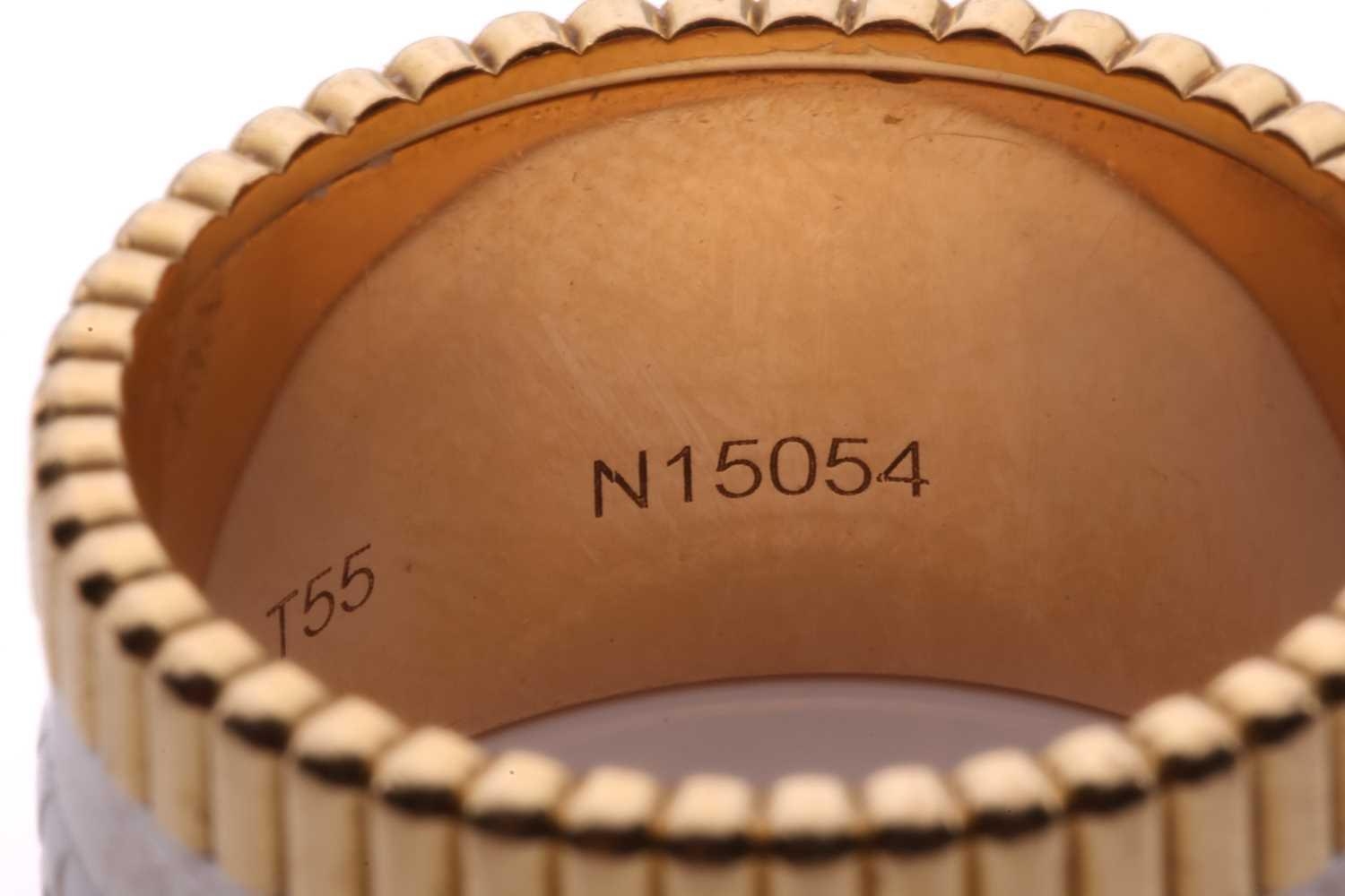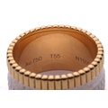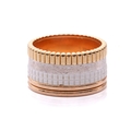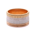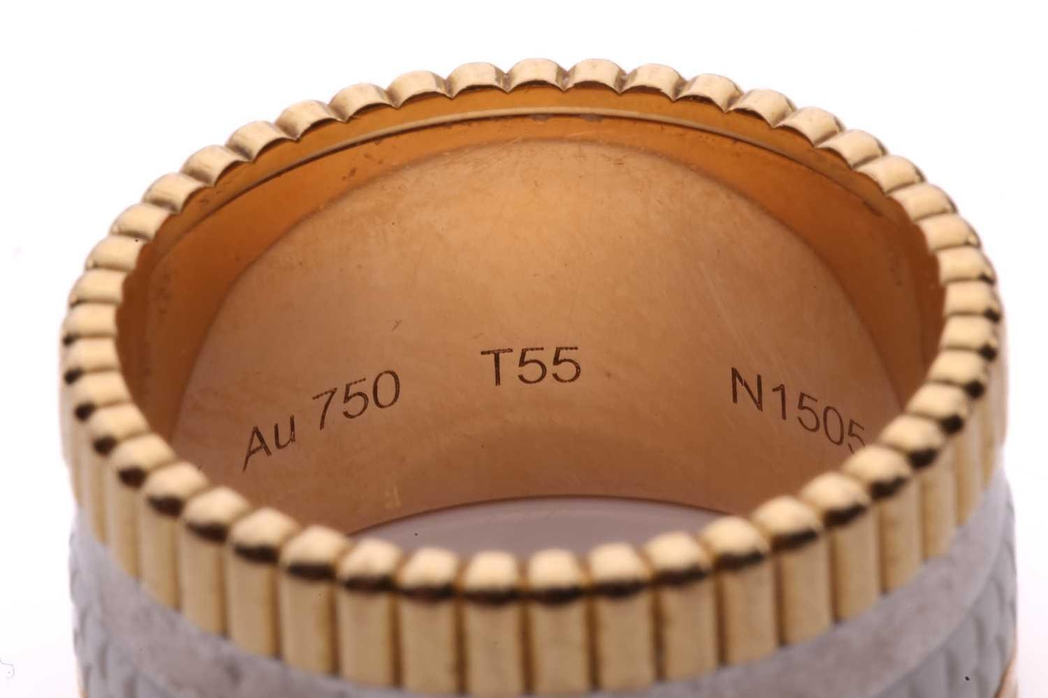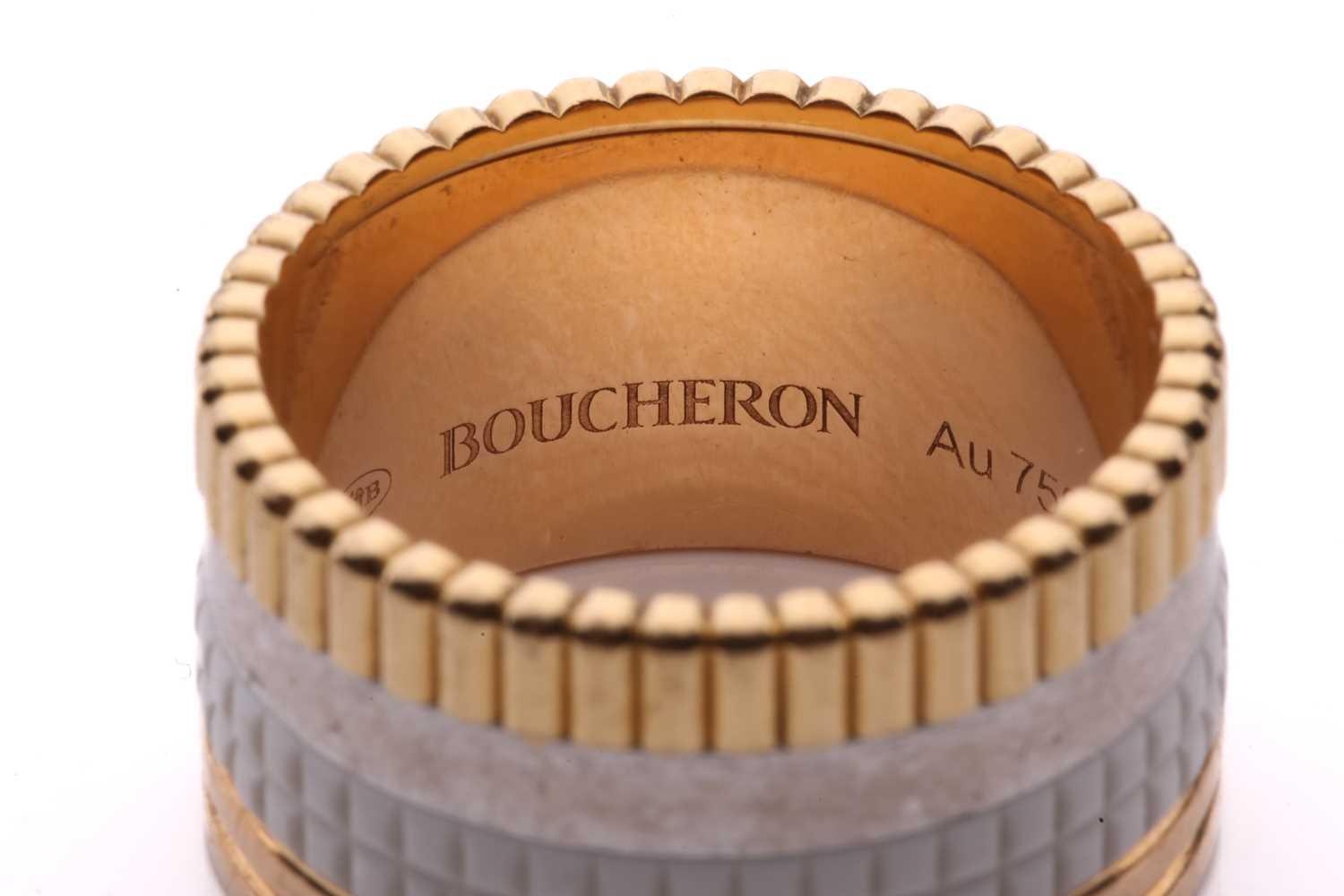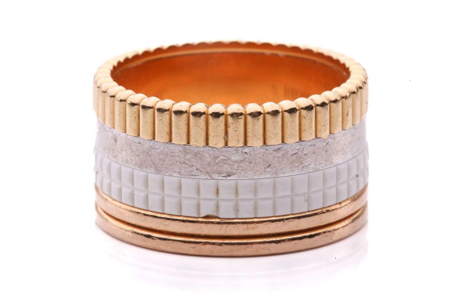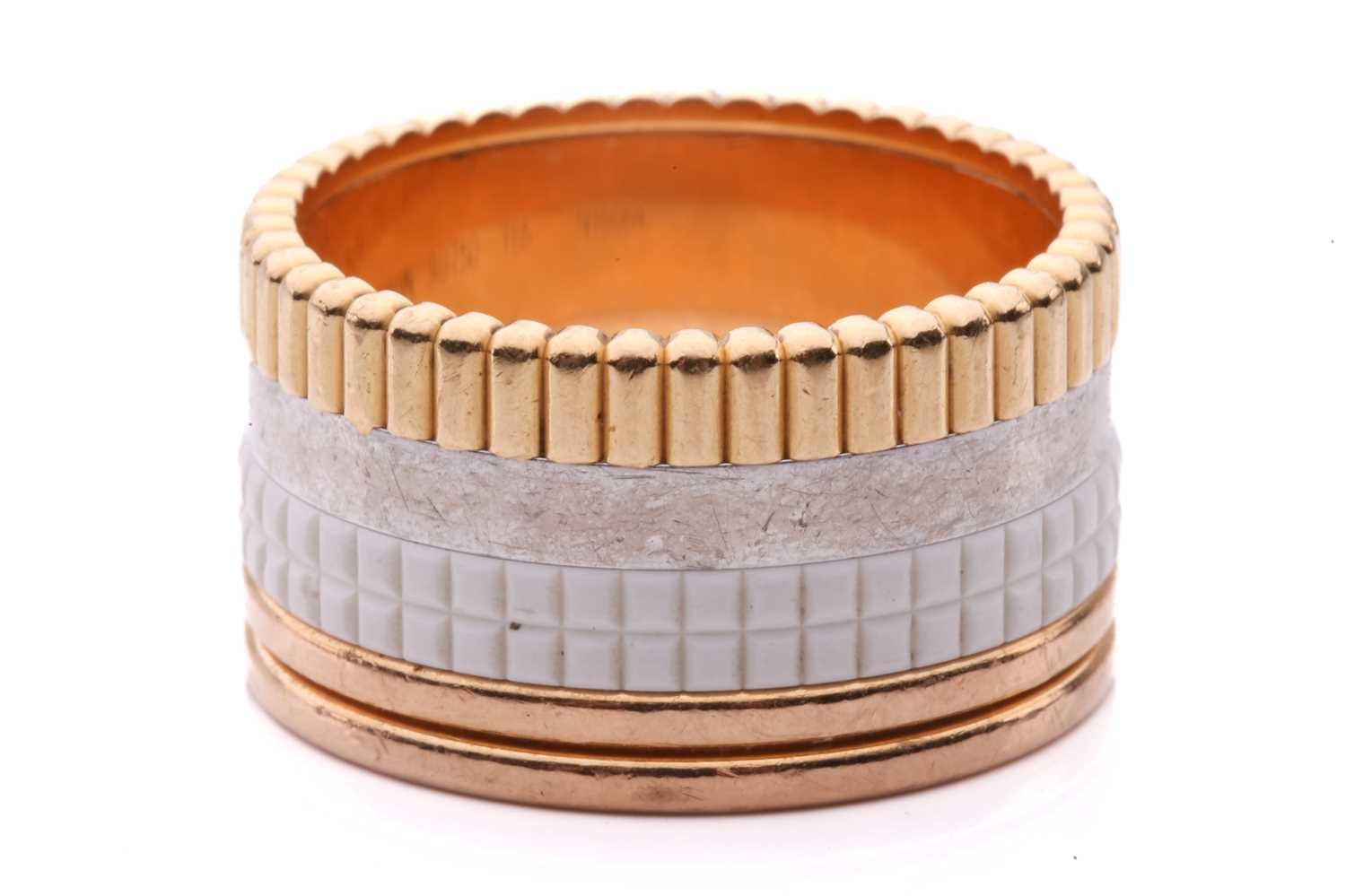 Boucheron - a 'Quatre' white edition large ring in 18ct gold, edged with ribbed yellow gold and threaded pink gold borders, the polished white gold flat band accented with two rows of studded white ceramic, signed with Swiss convention hallmarks '750', size O½, total weight of item 11.1 grams. RRP £4,840