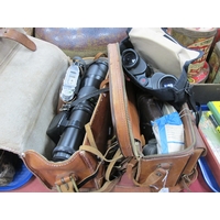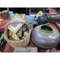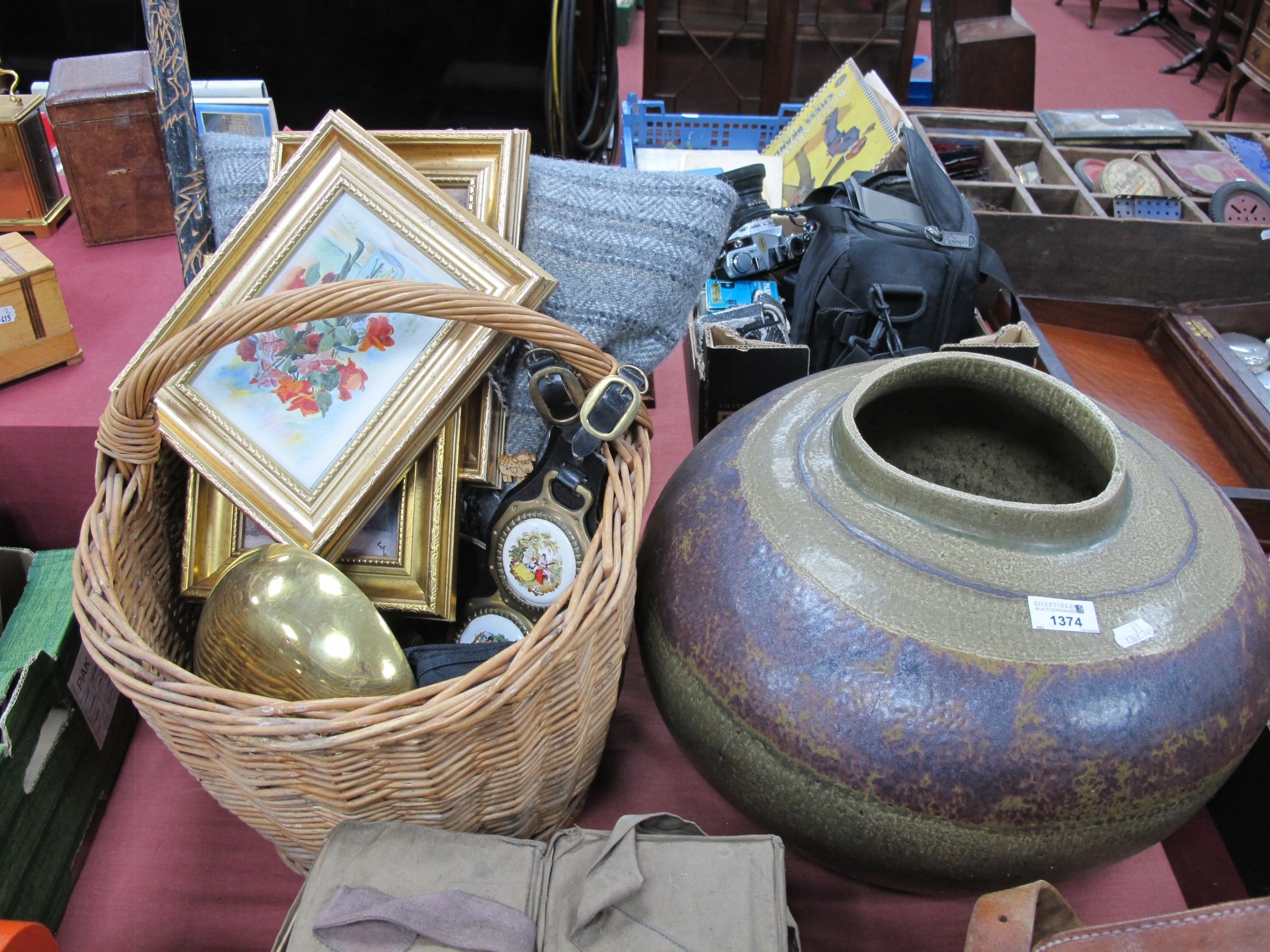 Horse Brasses, prints, walking cane etc, in basket, large studio pottery bulbouse vase (cracked) 42cm wide.
