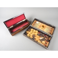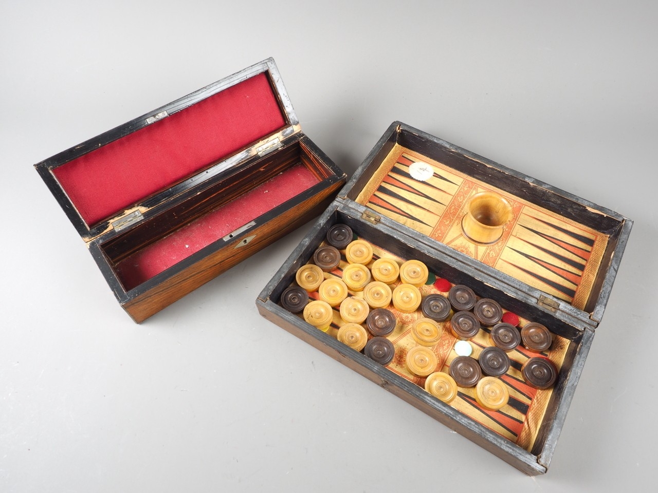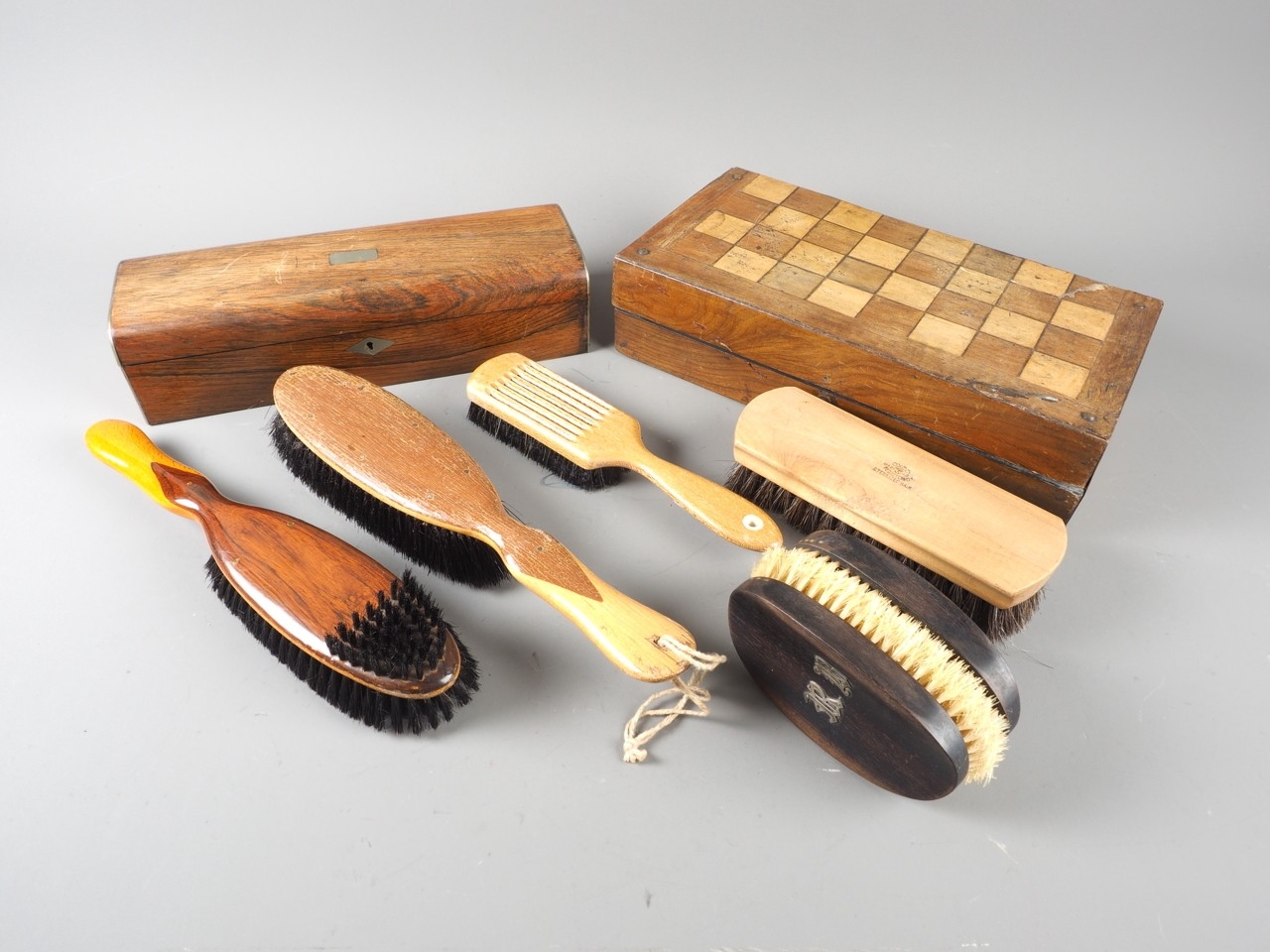 A late 19th century rosewood glove box, 11” wide, a backgammon and draughts board with turned wood draught pieces, a pair of rosewood and white metal mounted clothes brushes, and four other brushes, various