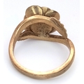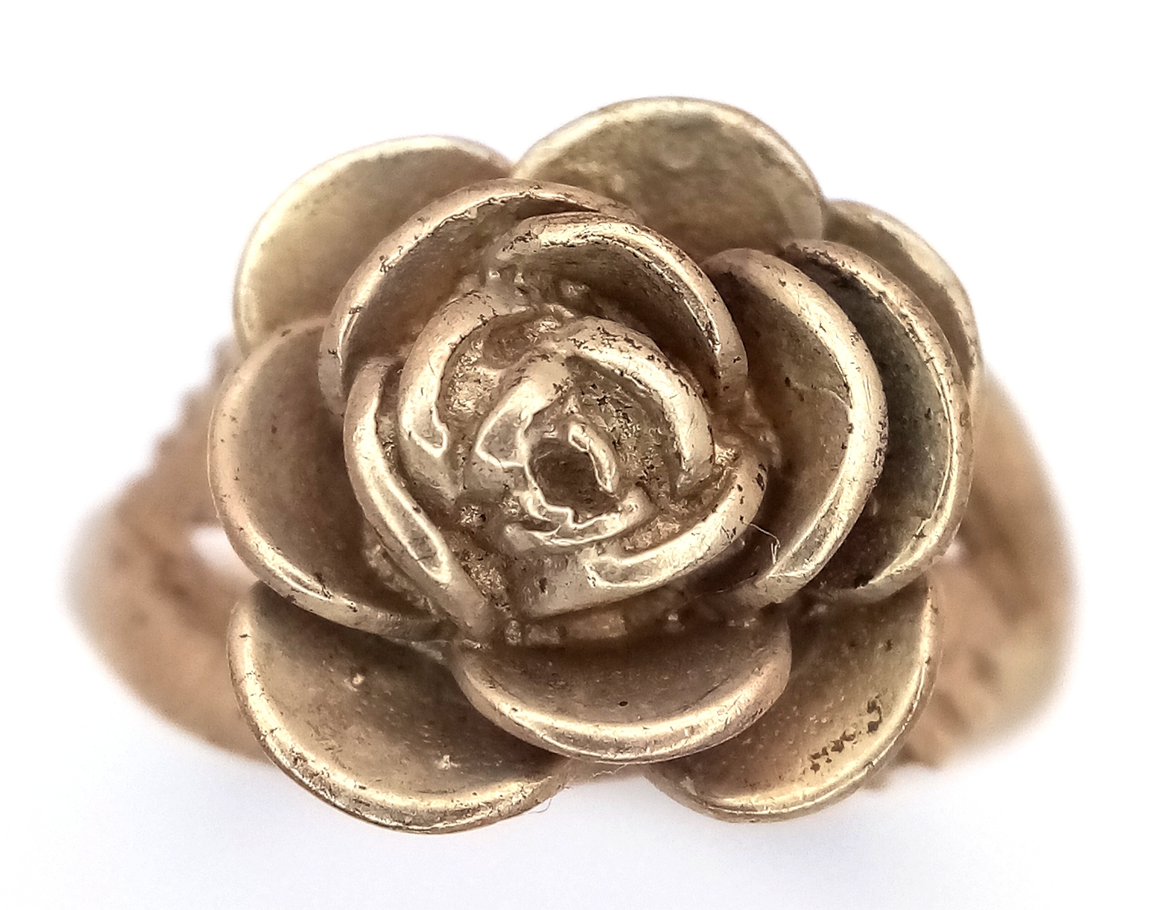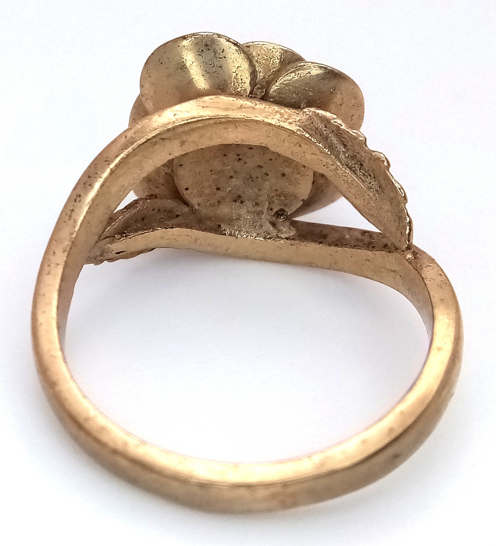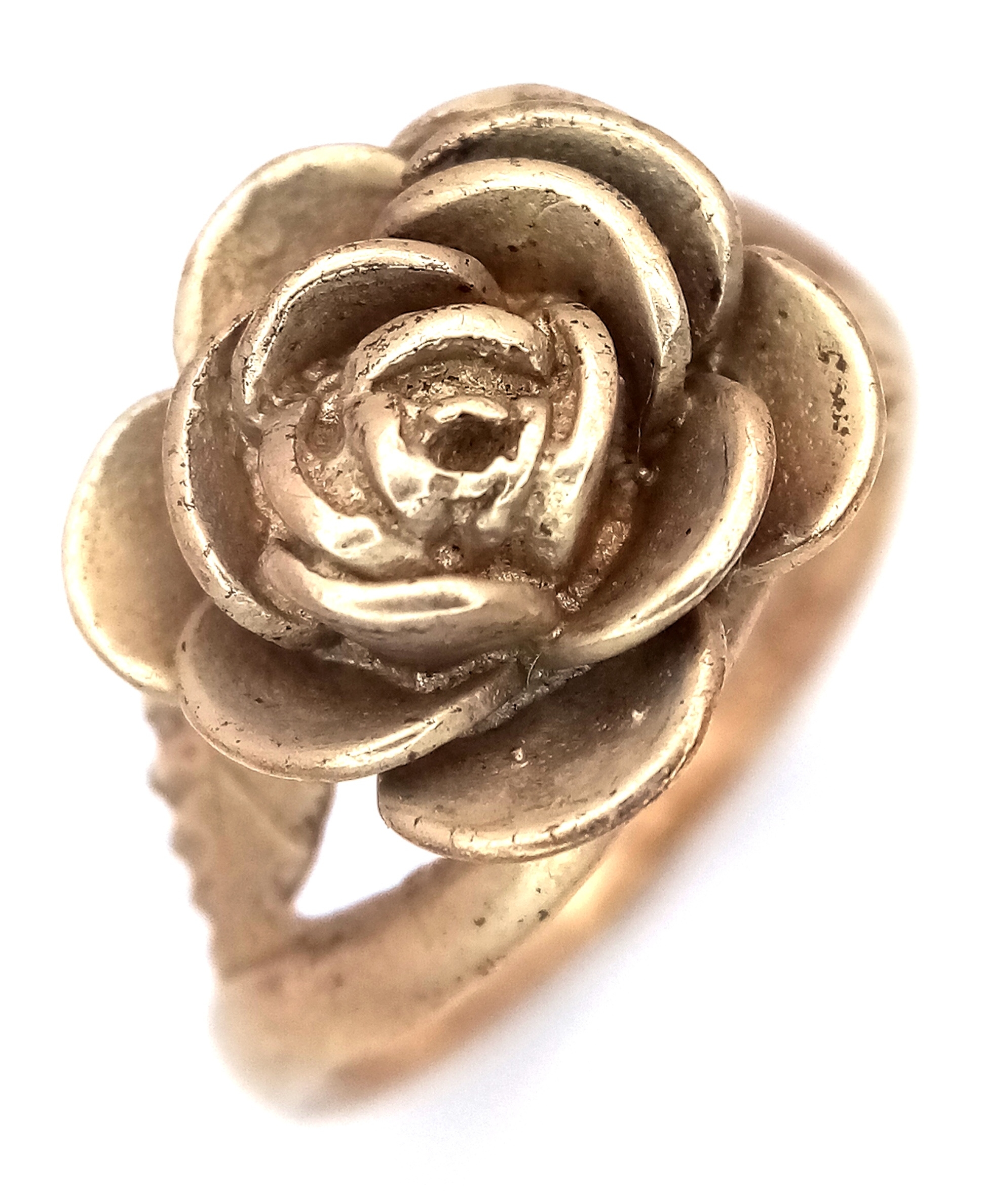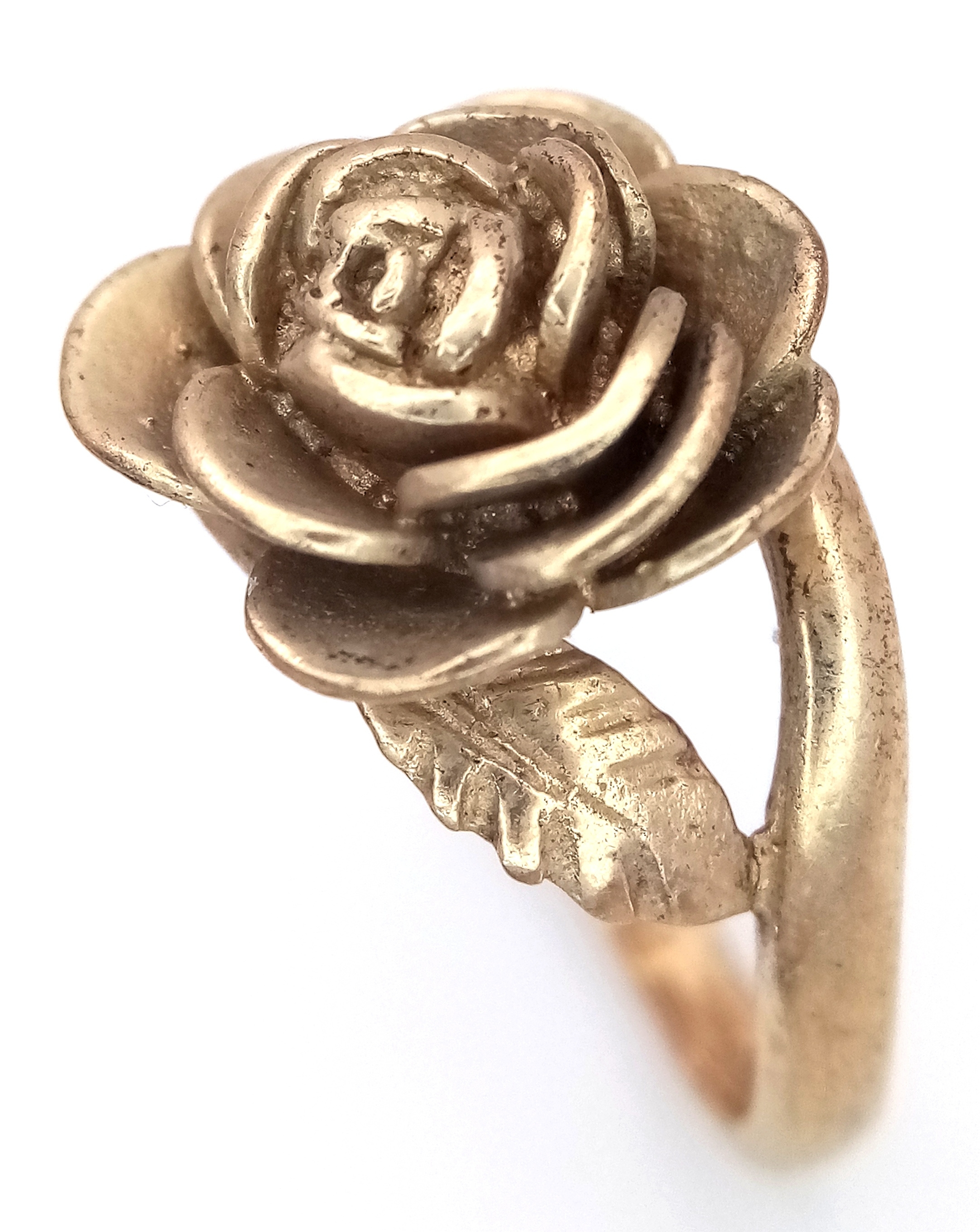 A 9K Yellow Gold Ring with Ornate Rose Decoration. Size M 1/2. 5.95g.
