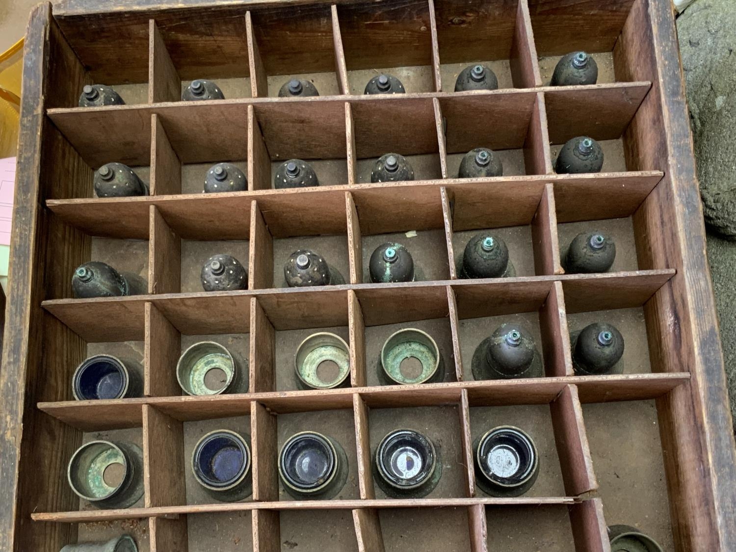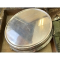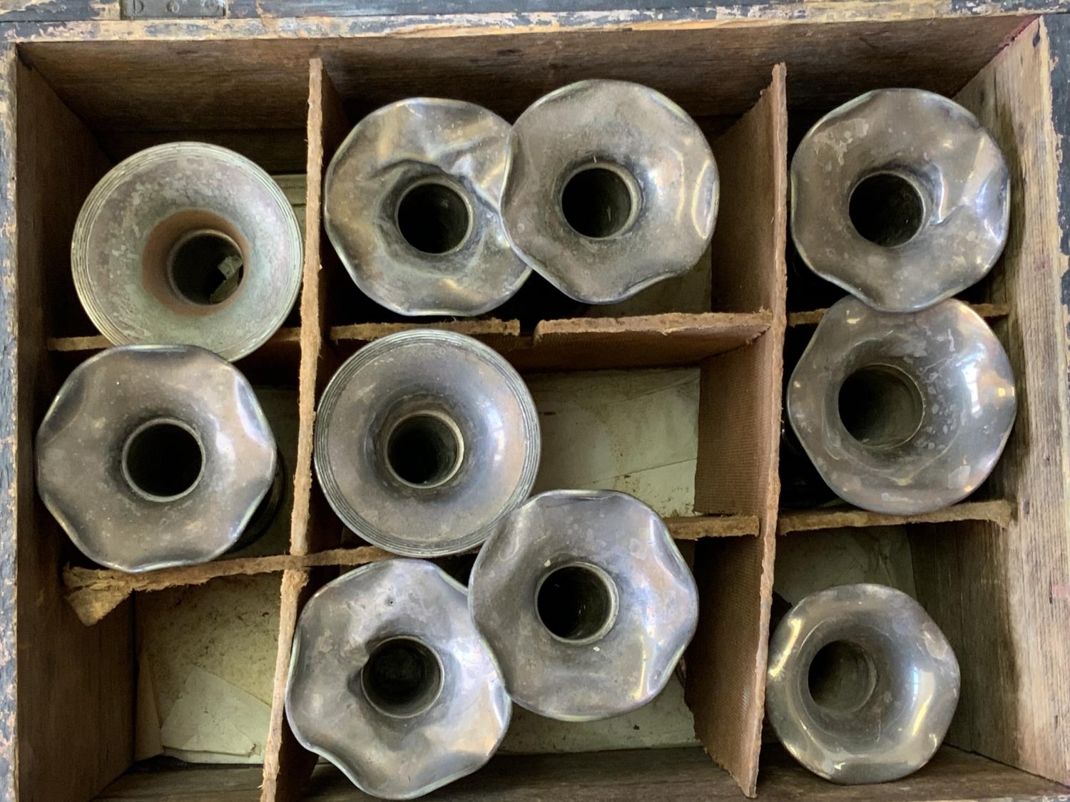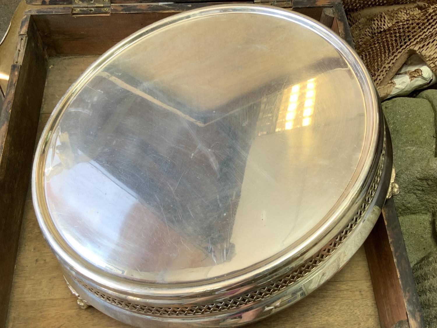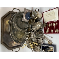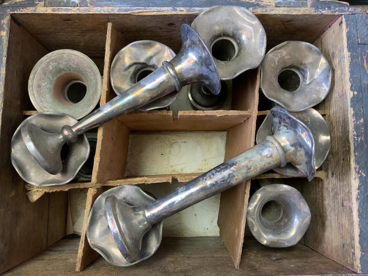 A collection of silver plated epurgnes, cruets, cased silver plated cake stand. (D).