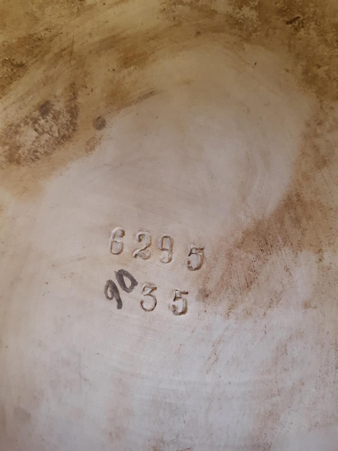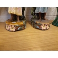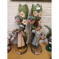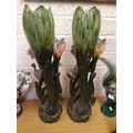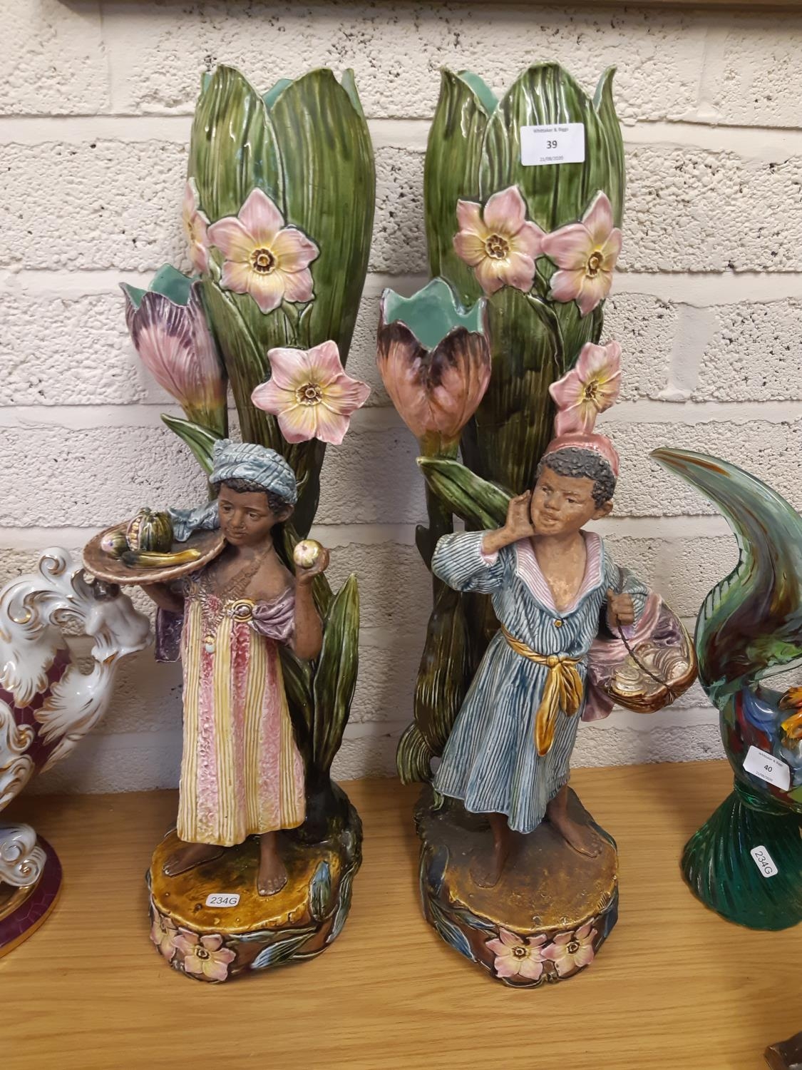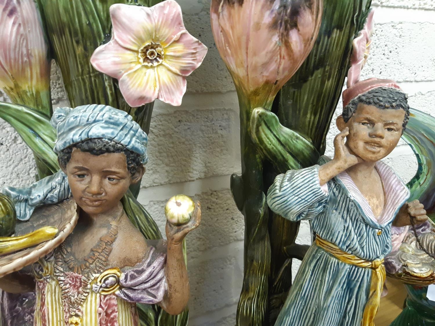 A pair of tall Art Nouveau Majolica floor vases featuring tall flowers and buds, each having a Blackamoor/island boy and girl dressed in period clothes and impressed 6296 to base – measuring approx. 68cm in height