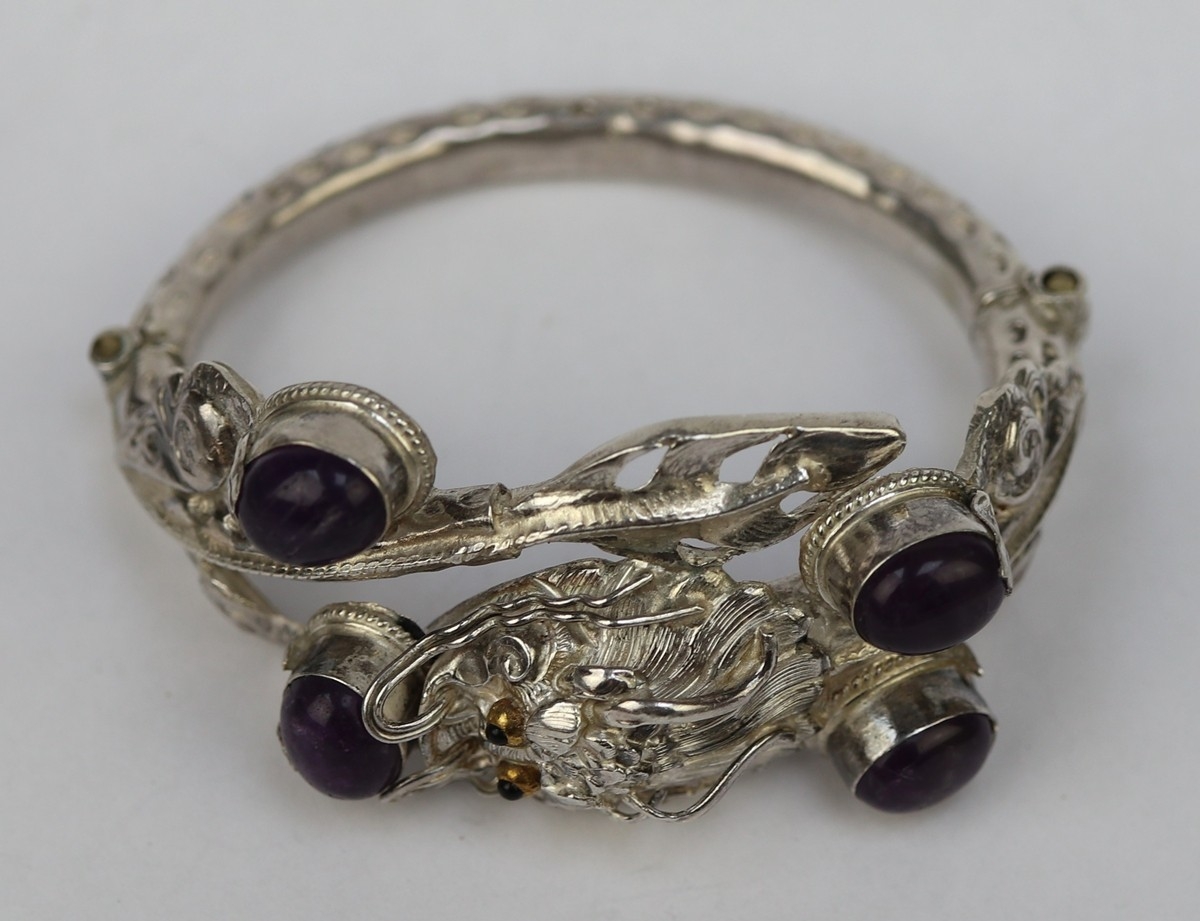 Silver dragon bangle set with amethyst - Approx 37.58g