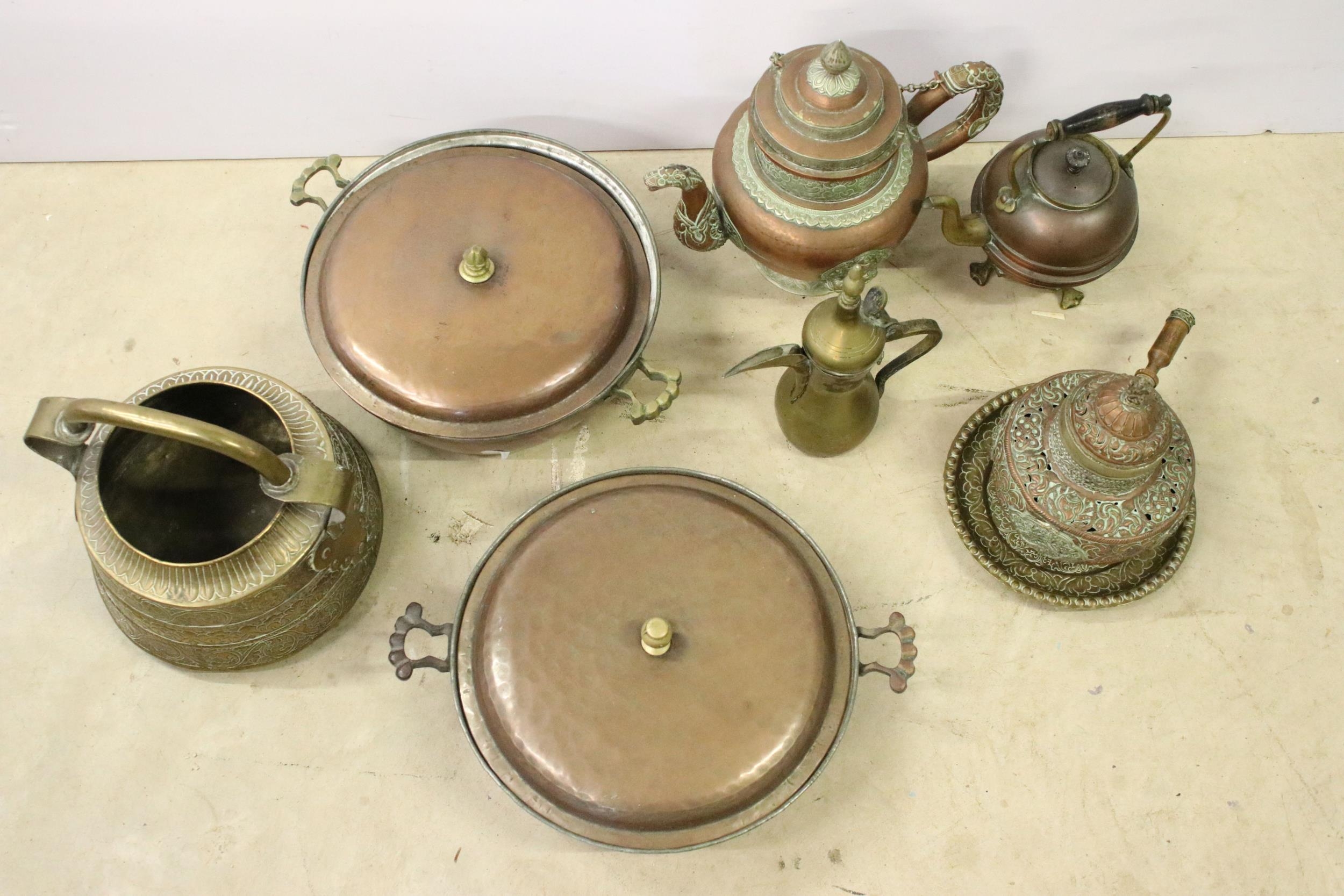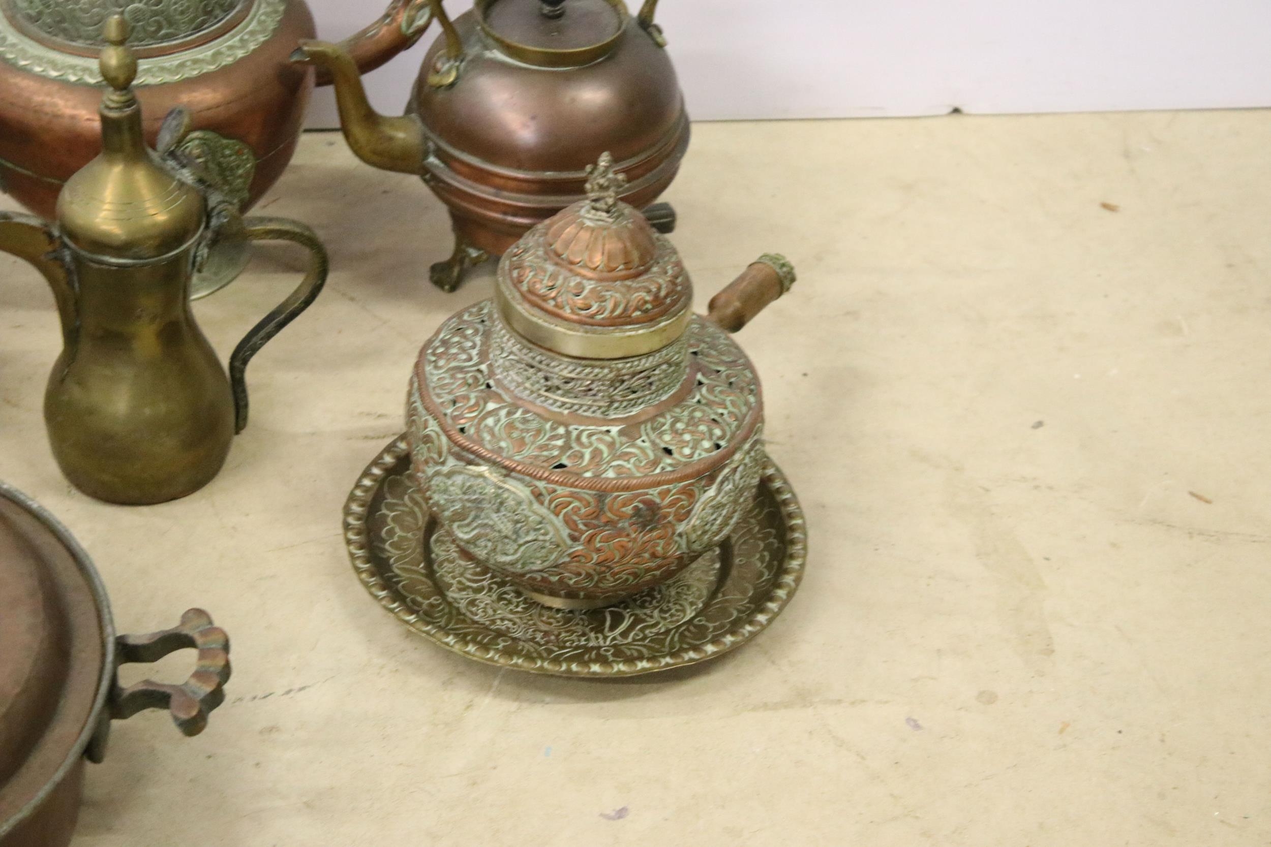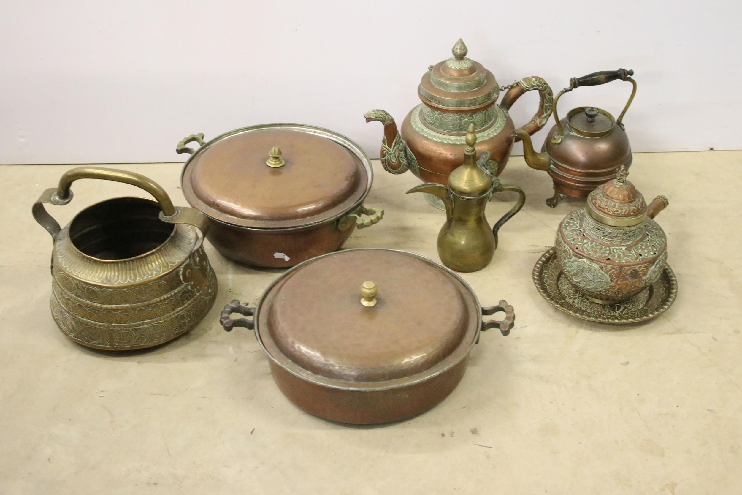 Collection of mixed copper and brassware to include copper Arts & Crafts twin handled pot, 2 x Middle Eastern copper teapot, brass coffee pot, etc