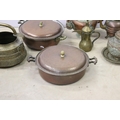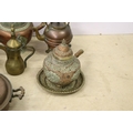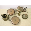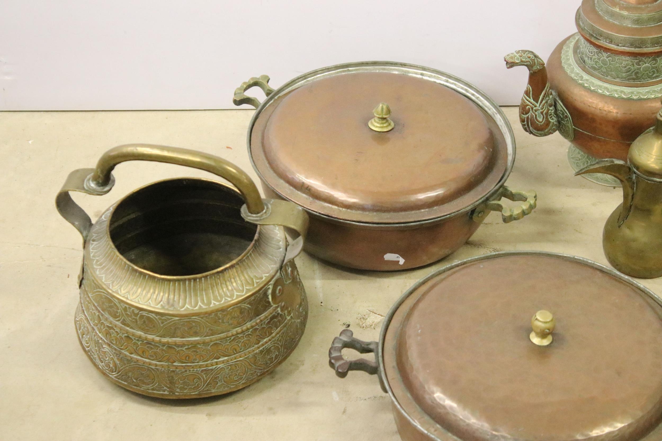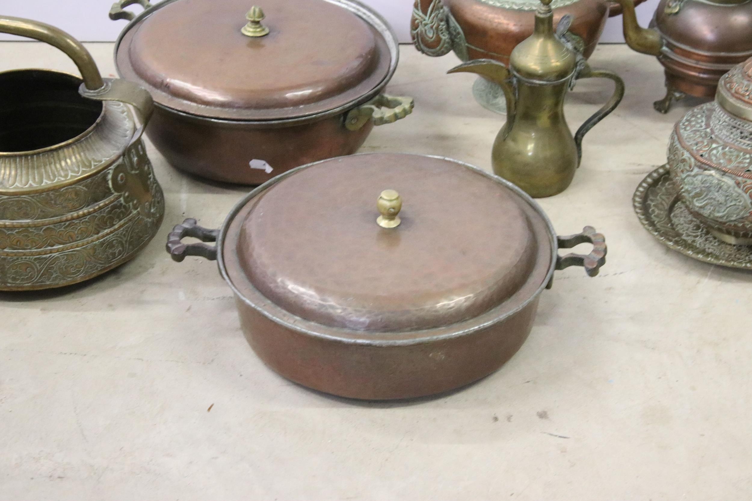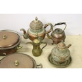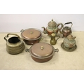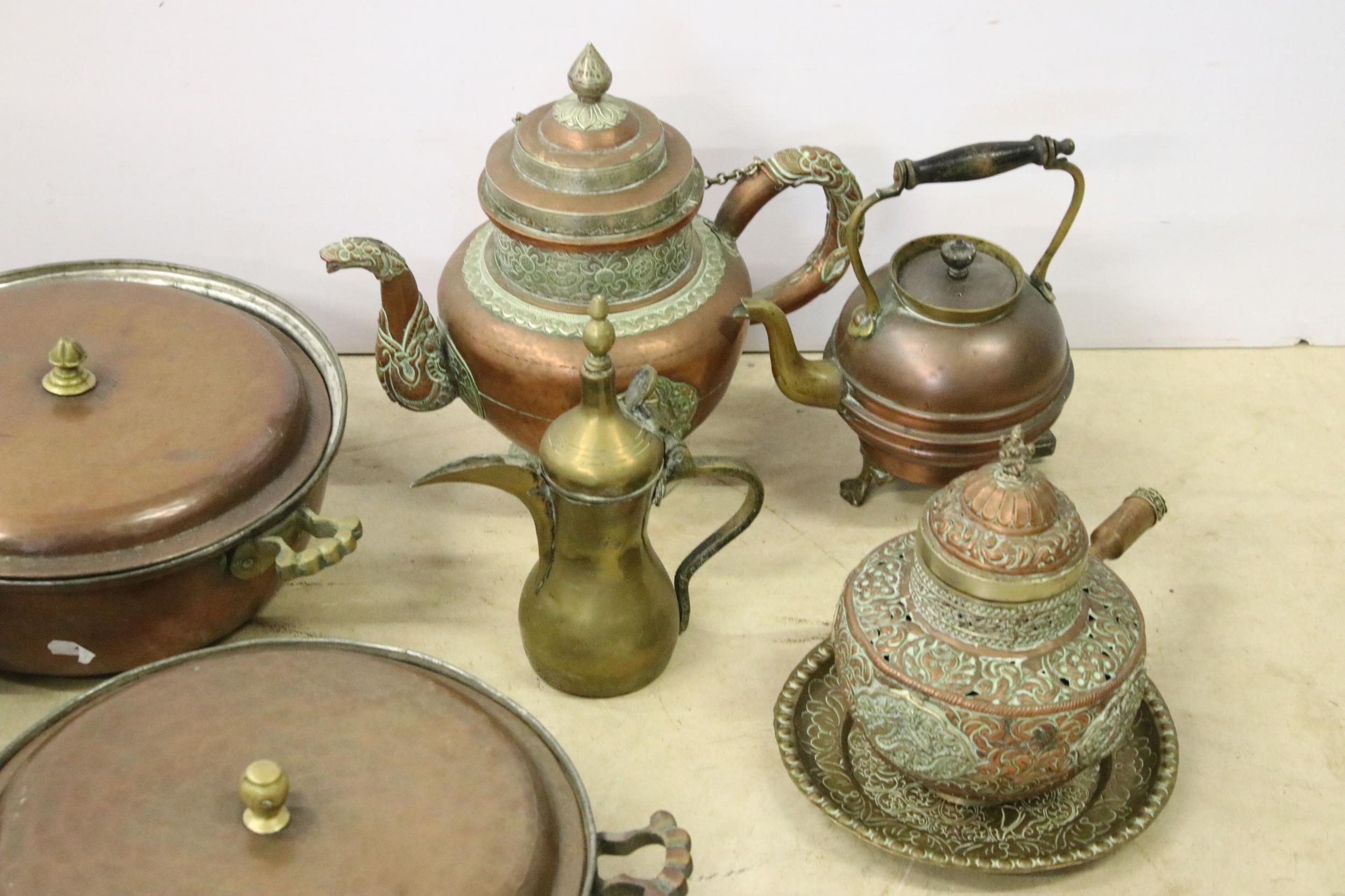 Collection of mixed copper and brassware to include copper Arts & Crafts twin handled pot, 2 x Middle Eastern copper teapot, brass coffee pot, etc