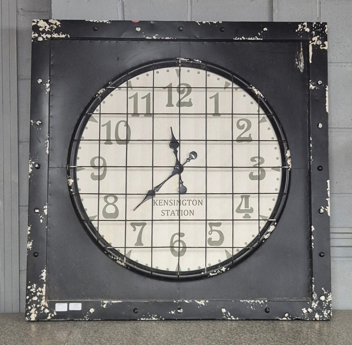 A large industrial style Kensington station square wall clock