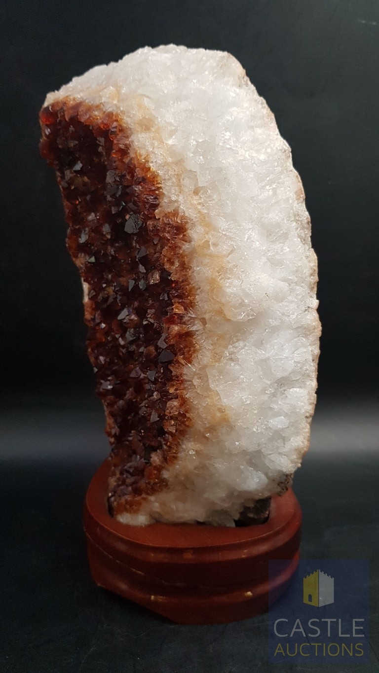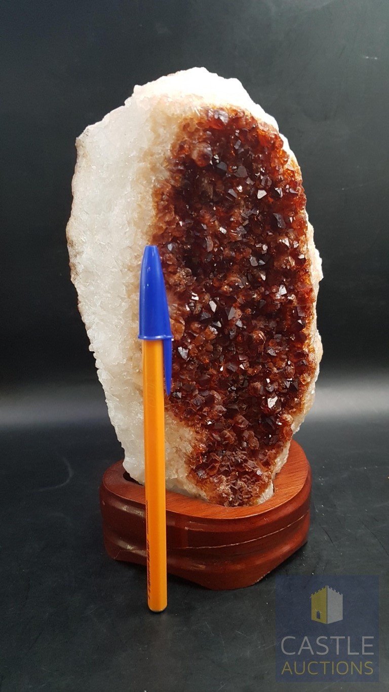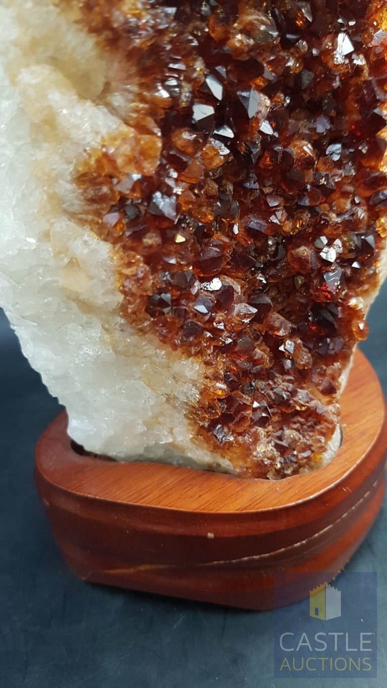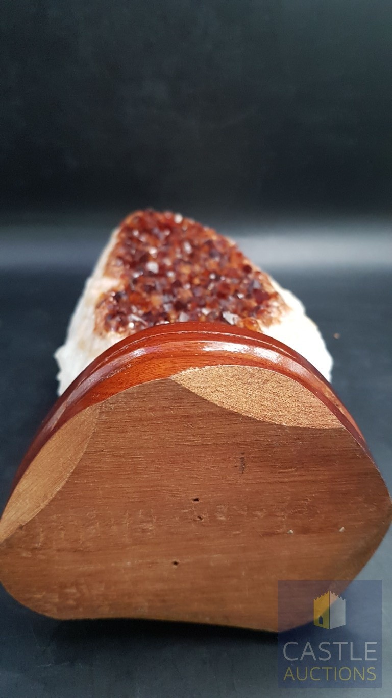 Rare Decorative Collectible Citrine Quartz Crystal on Wooden Base (Approx. 21.5cm x 11.5cm).