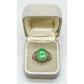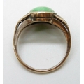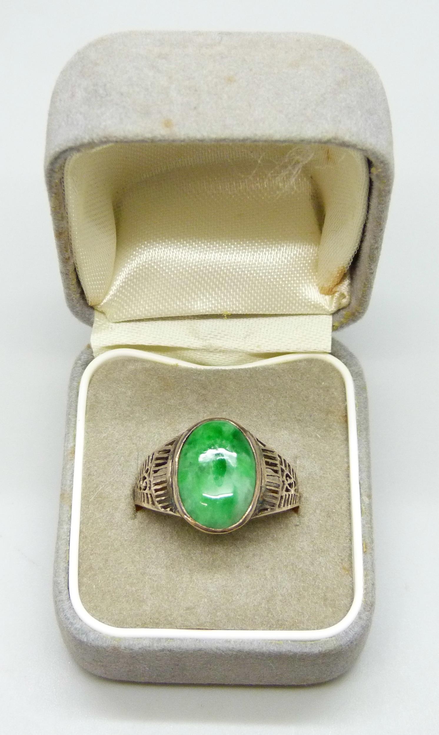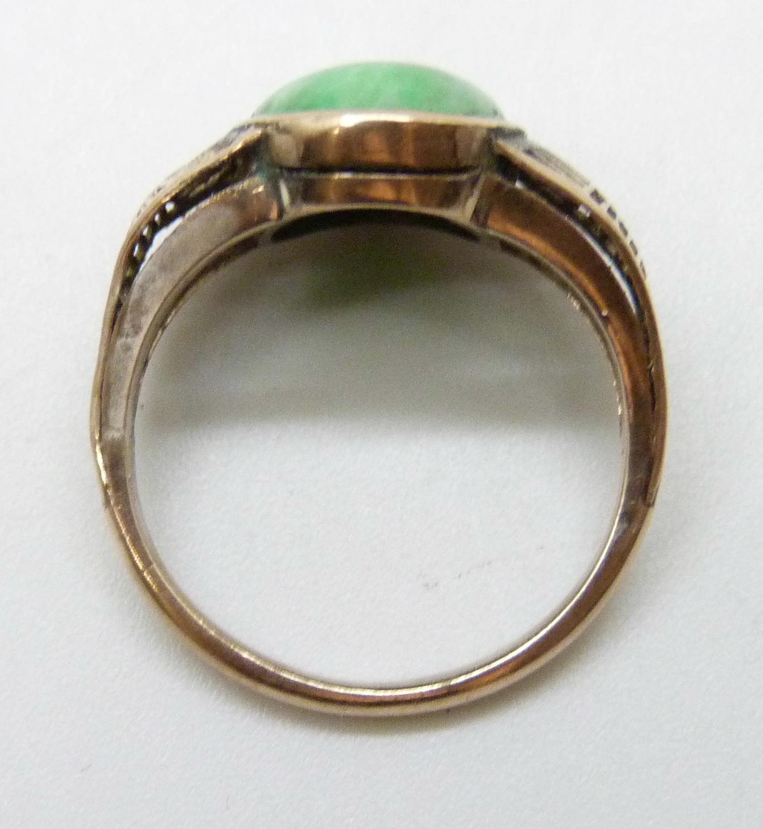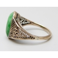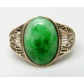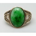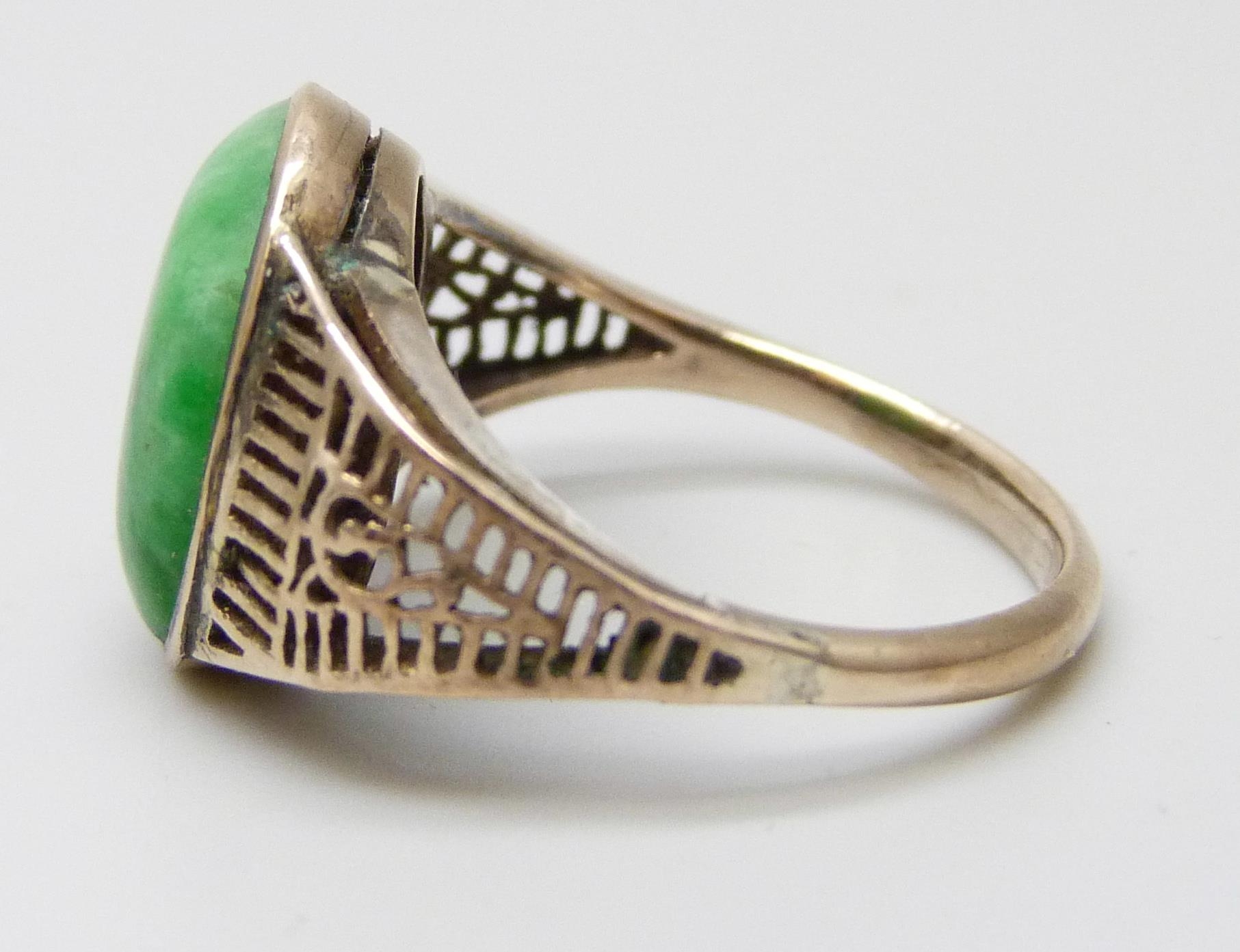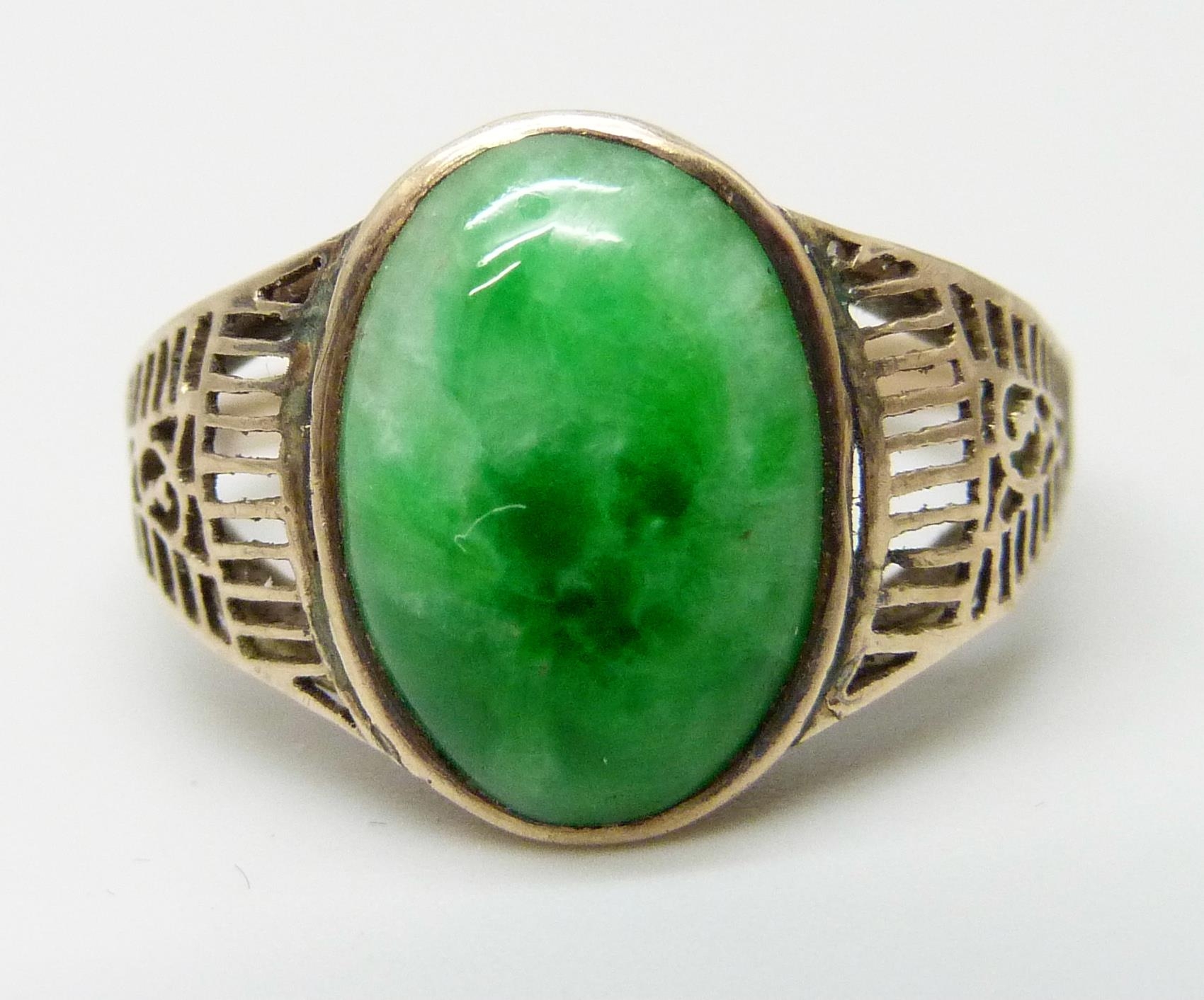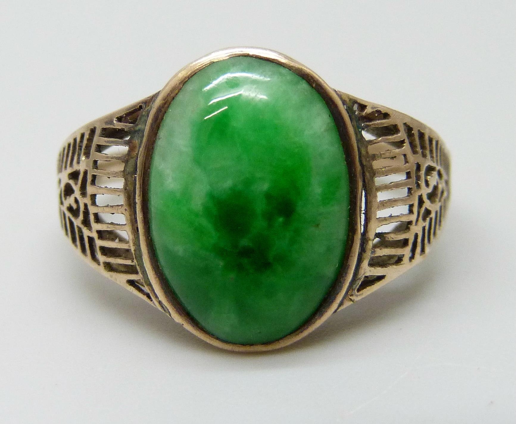 A yellow metal fretwork design ring set with a green stone, possibly nephrite, 3.1g, M