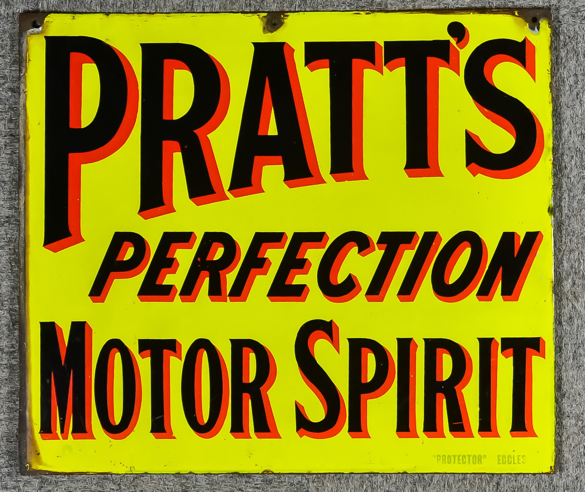 A Double-Sided Enamel Advertising Sign, Late 19th/Early 20th Century, for 'Pratt's Perfection Motor Spirit' marked "'Protector' of Eccles", the yellow ground with black and red lettering, 21ins x 18ins