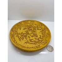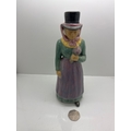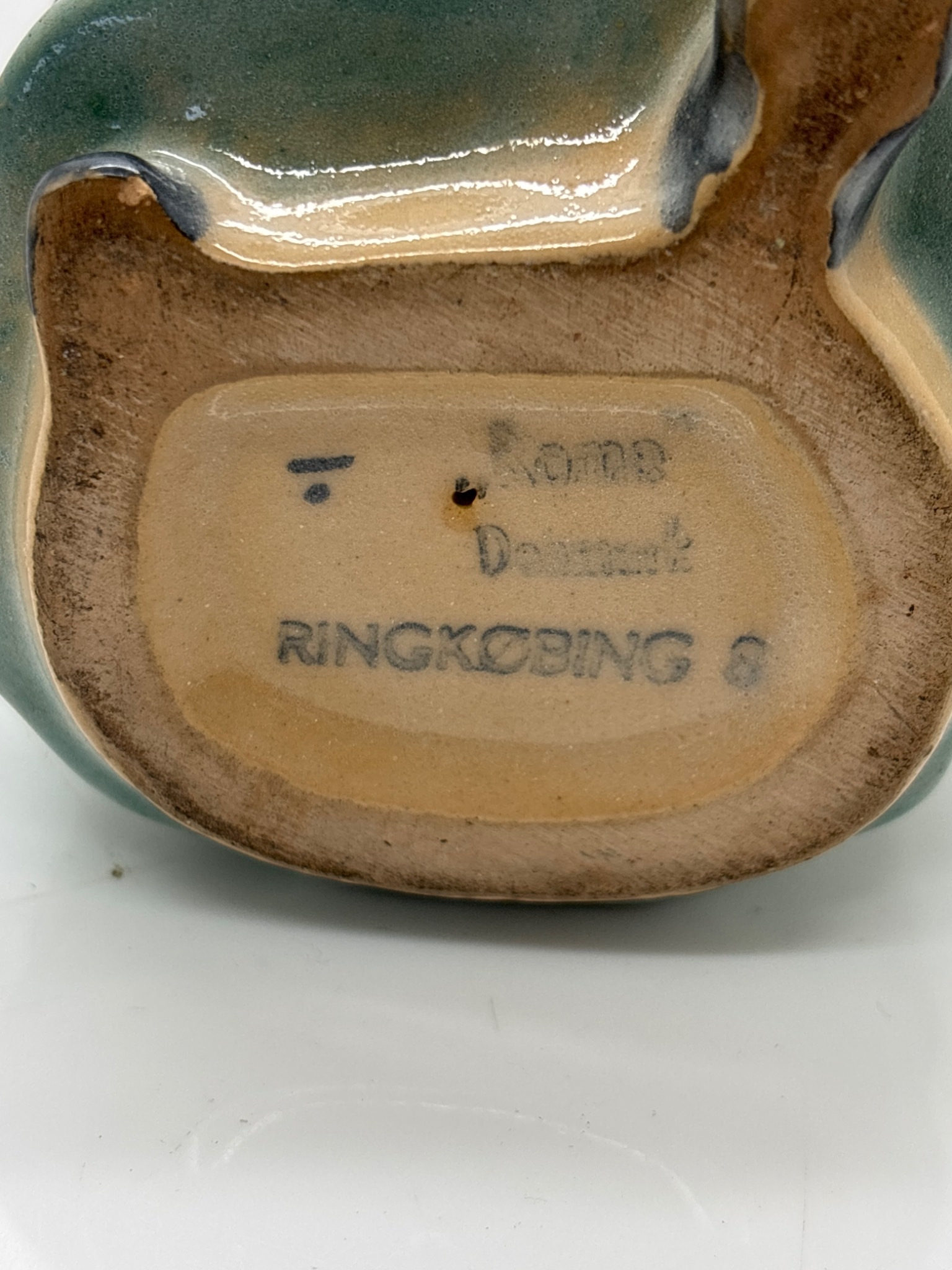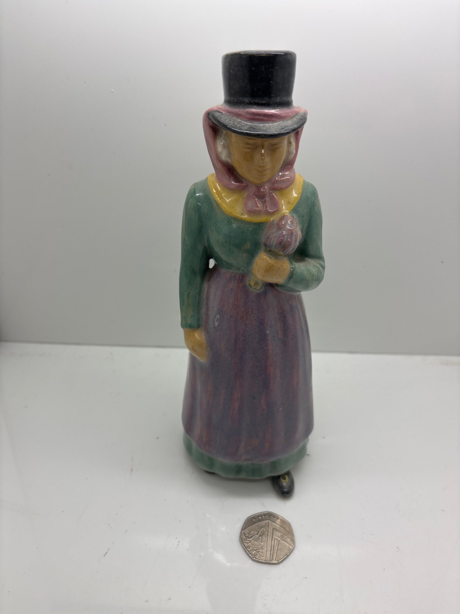 Hand-painted ceramic figurine marked 'Ringkobing 6,' made in Denmark, featuring a woman in traditional attire holding a flower. Condition appears consistent with age, and a coin is shown for scale.