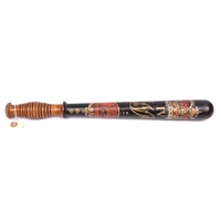 A Victorian Police painted wood truncheon, decorated with crown over VR cypher and “POLICE” within elaborate foliate panel, all on a black background, with original leather loop attached, 15¼” overall. GC £100-125