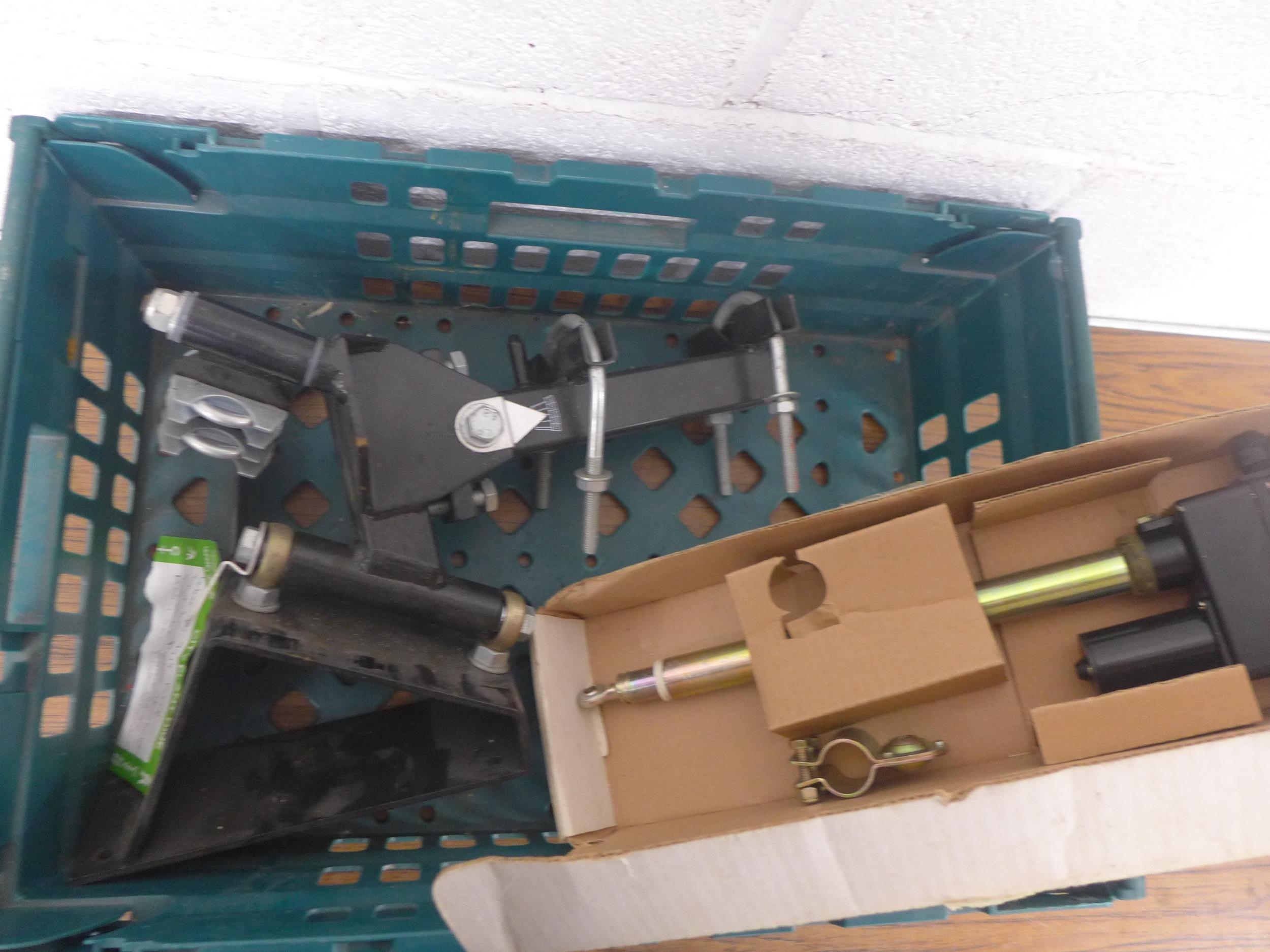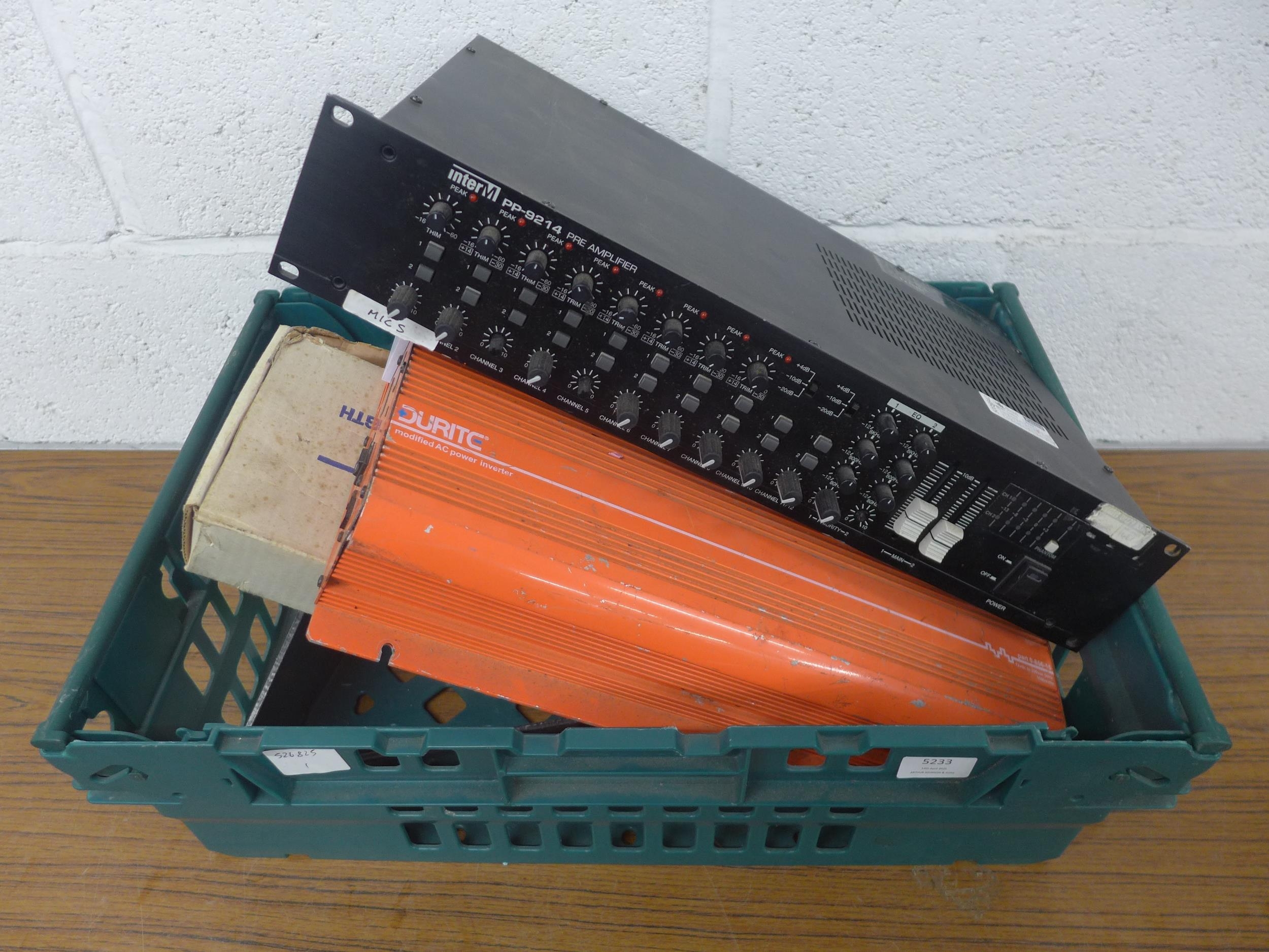 A box of miscellaneous items including an Inter-M PP9214 pre amplifier, a Duritic power inverter, a satellite positioner and an Actuator with bracket