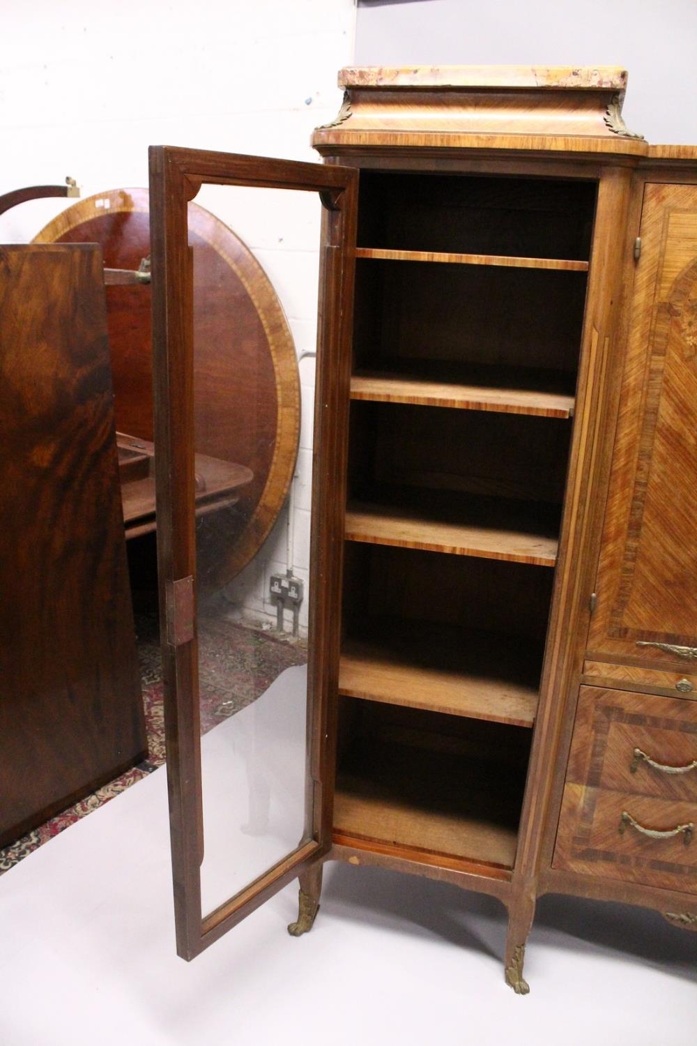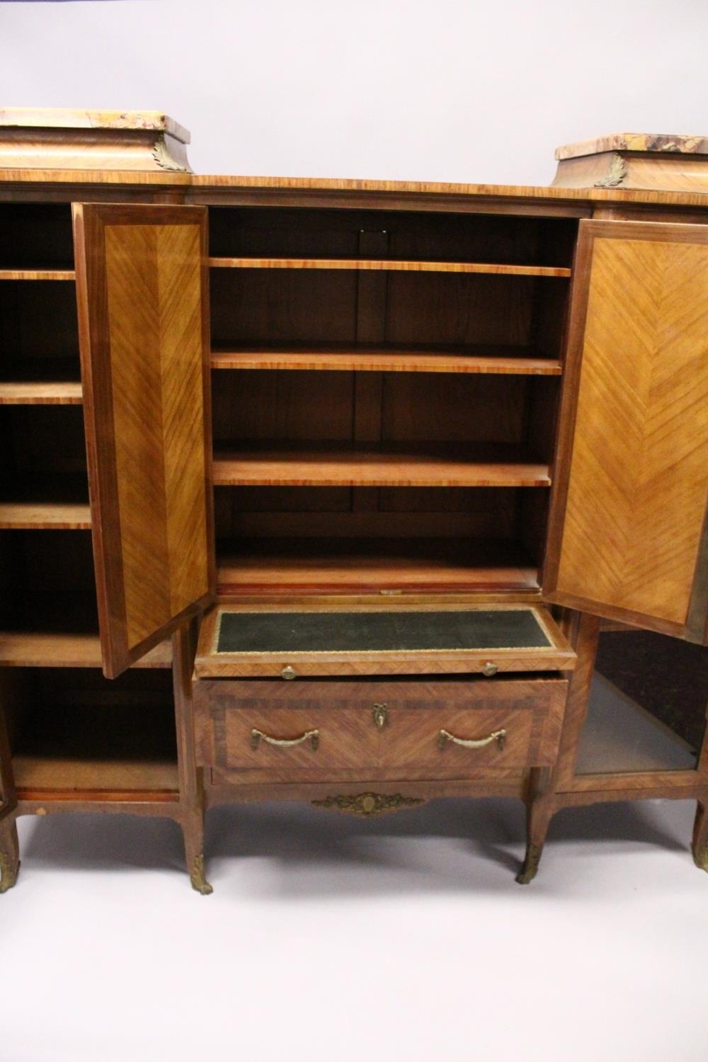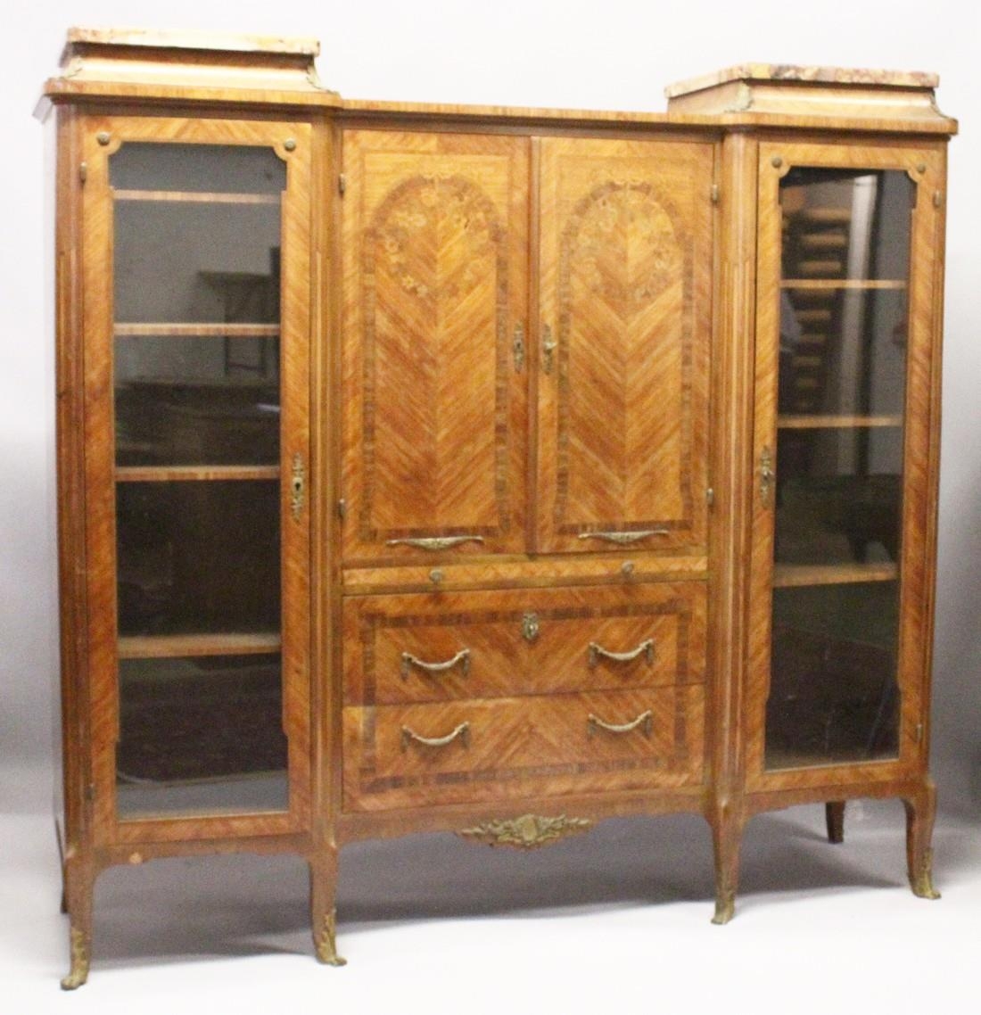 A GOOD LARGE FRENCH KINGWOOD CABINET, formed as a pair of central marquetry panel doors, over a brushing slide, two long drawers, flanked by long glazed doors with marble tops on curving legs, with ormolu sabot.
