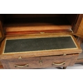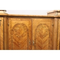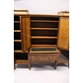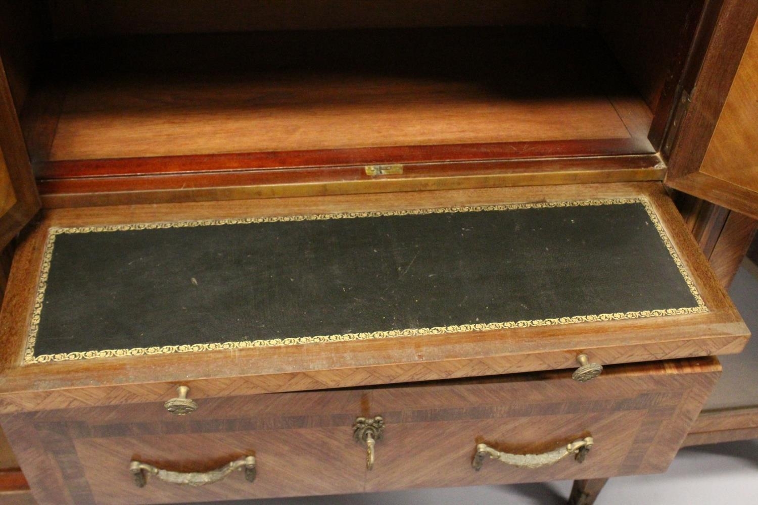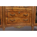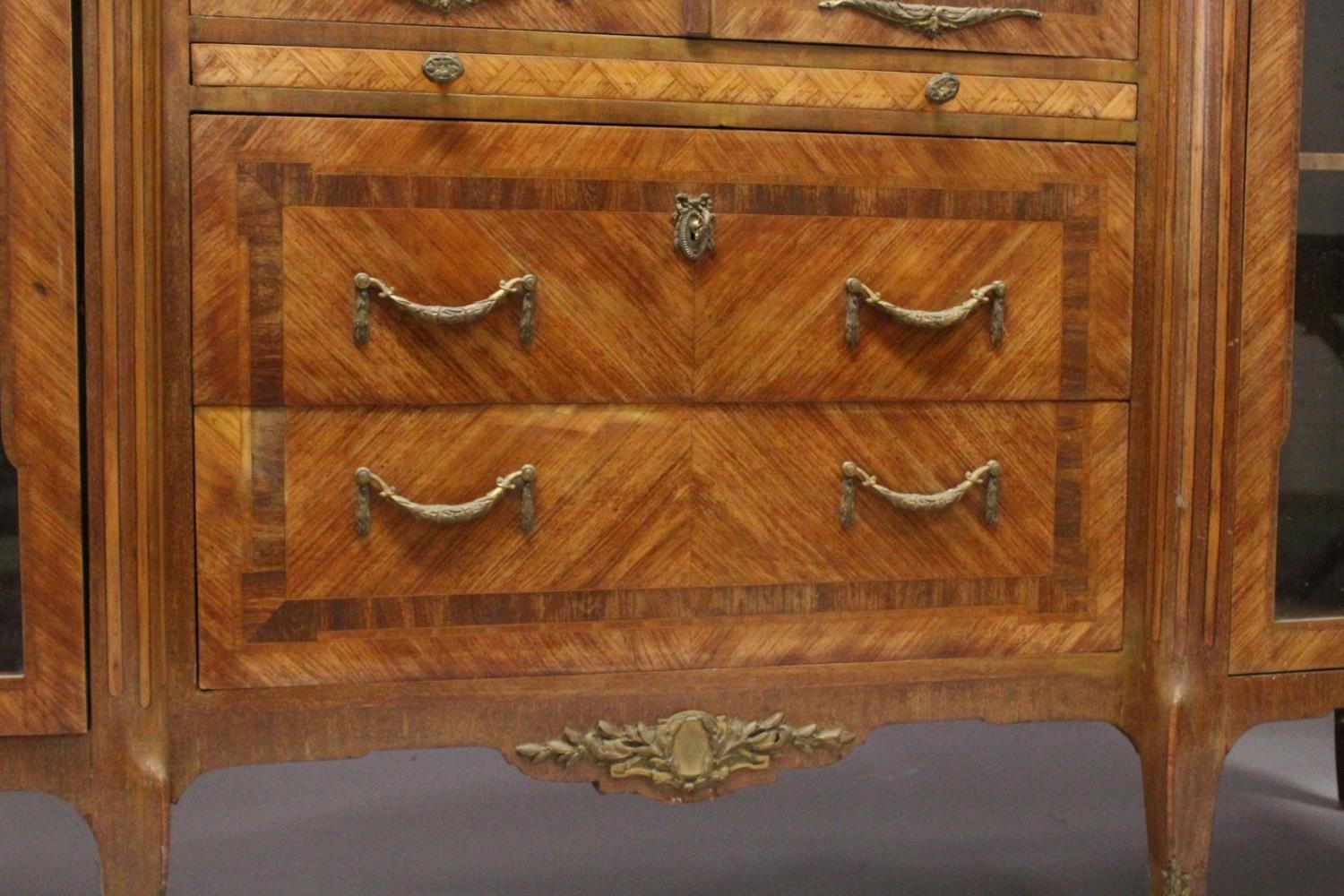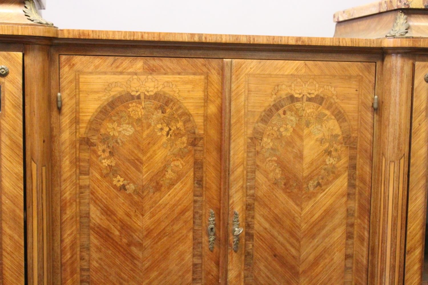 A GOOD LARGE FRENCH KINGWOOD CABINET, formed as a pair of central marquetry panel doors, over a brushing slide, two long drawers, flanked by long glazed doors with marble tops on curving legs, with ormolu sabot.