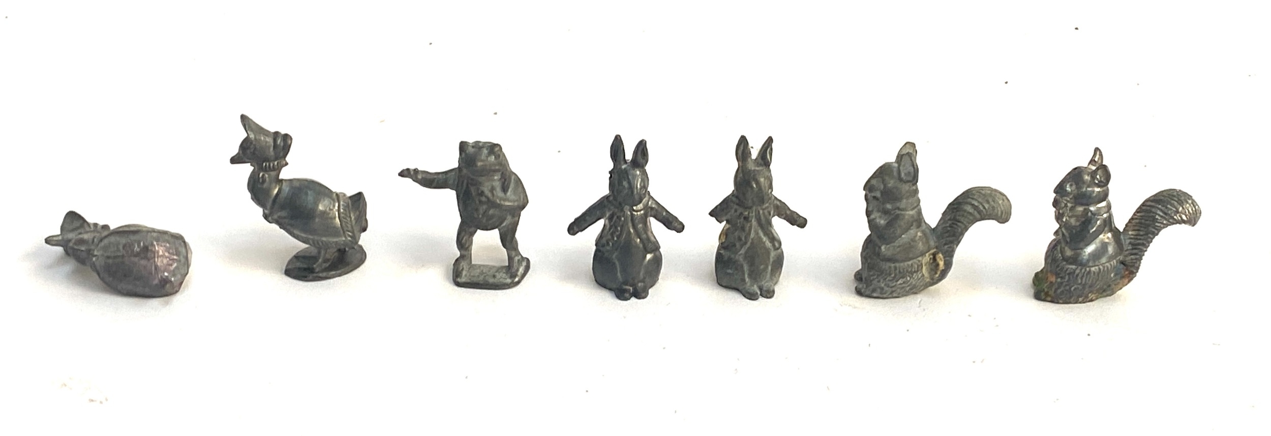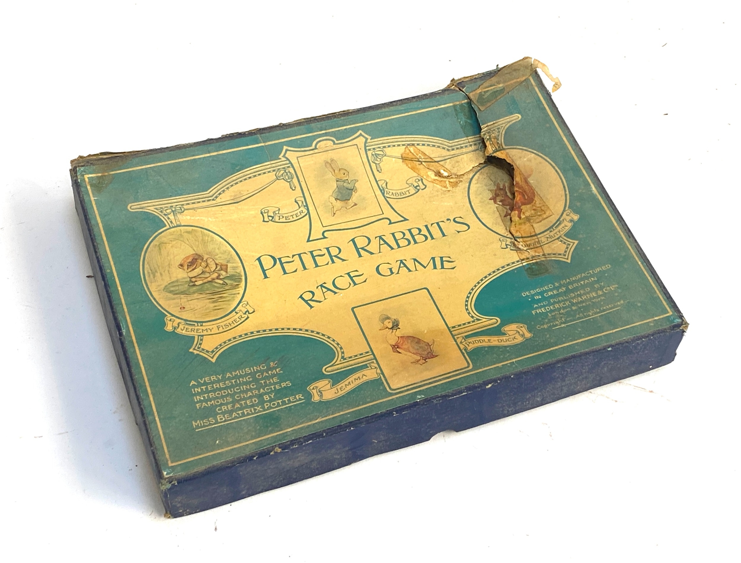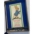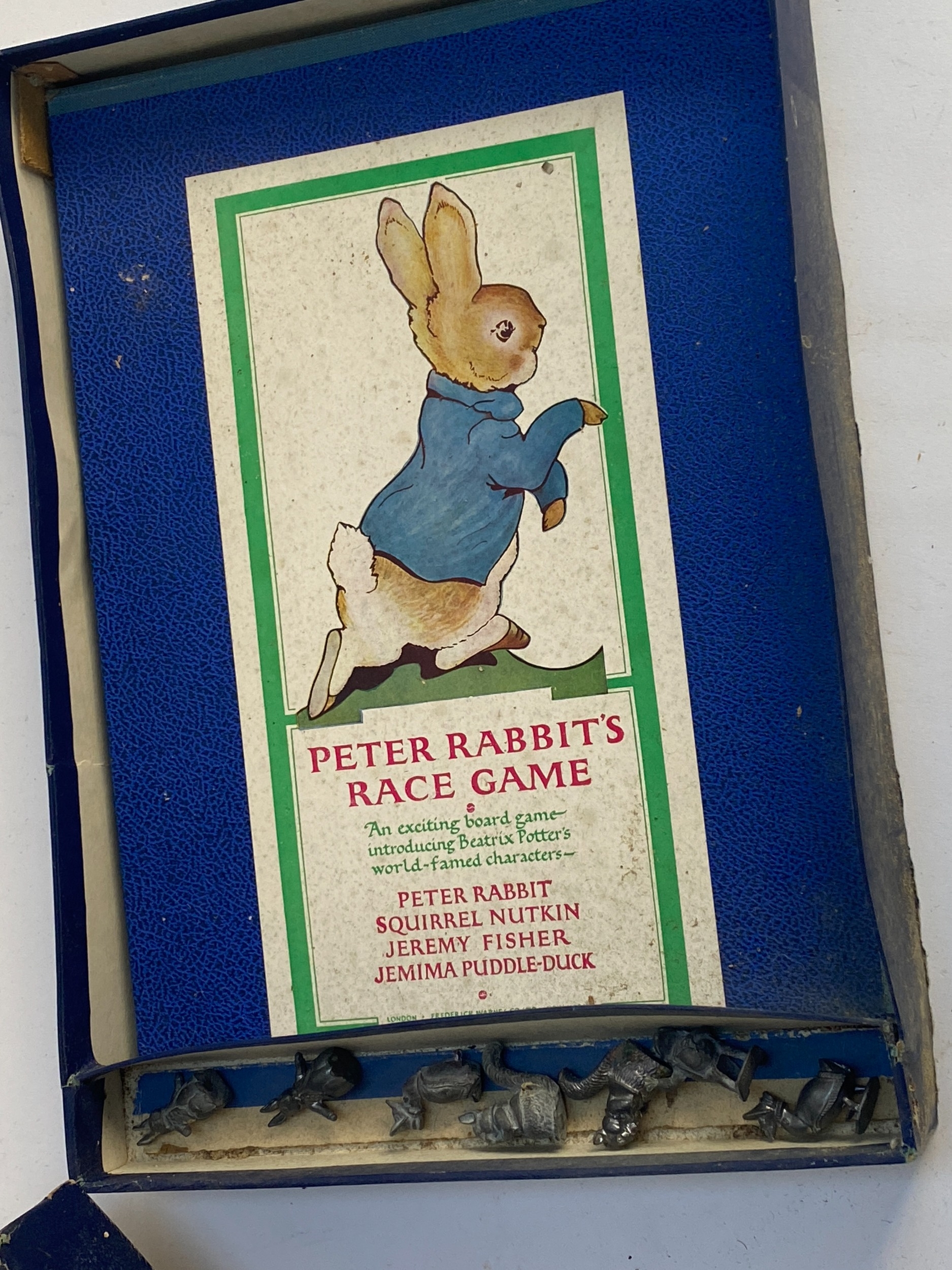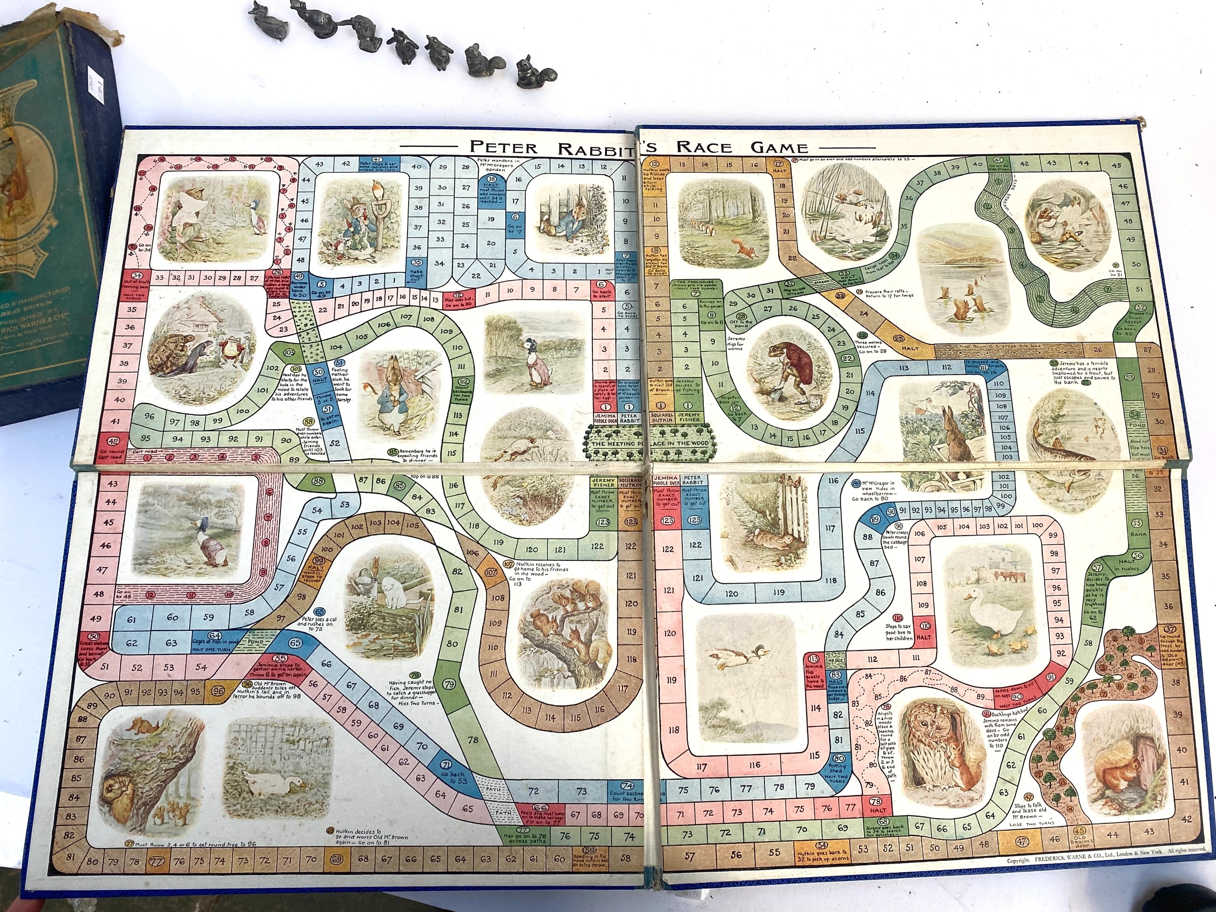 An early 20th century Peter Rabbit's Race Game, boxed, with fold-out board and cast metal character pieces