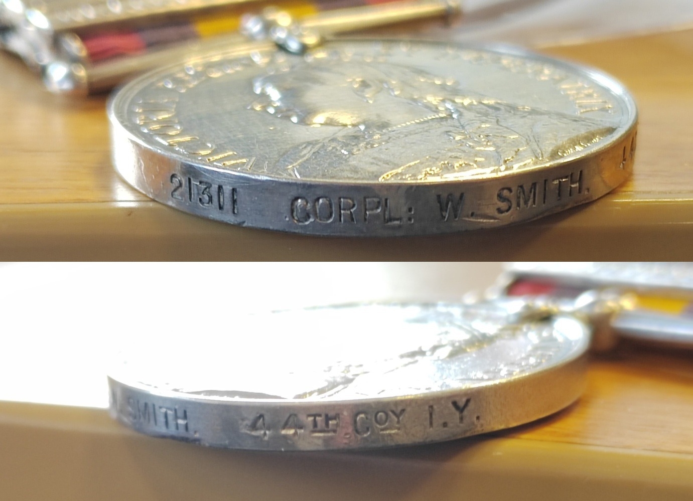 1. QSA with 4 clasp Orange Free State, Transvaal, South Africa 1901, South Africa 1902 to 21311 Corpl: W. Smith. 44th Coy I.Y.