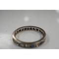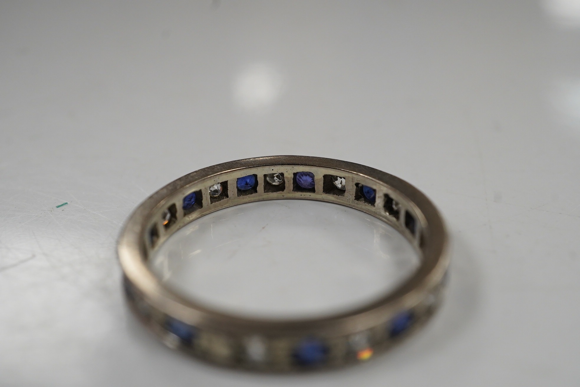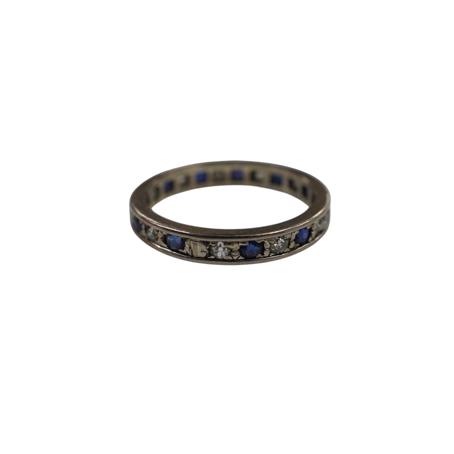 An unmarked white metal, sapphire and diamond set full eternity ring, size U, gross weight 4.6 grams.