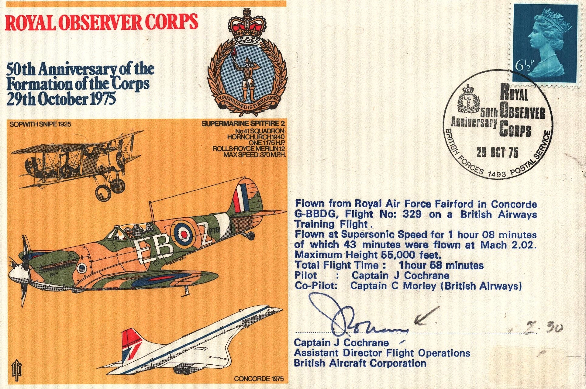 J Cochrane, Pilot signed FDC. Royal Observer Corps. 50th Anniversary of the Formation of the Corps 29th October1975. Single Stamp plus Single post marked 29 OCT 75.