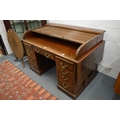 An early 20th century mahogany pedestal desk with tambour top, drop-flap sides.