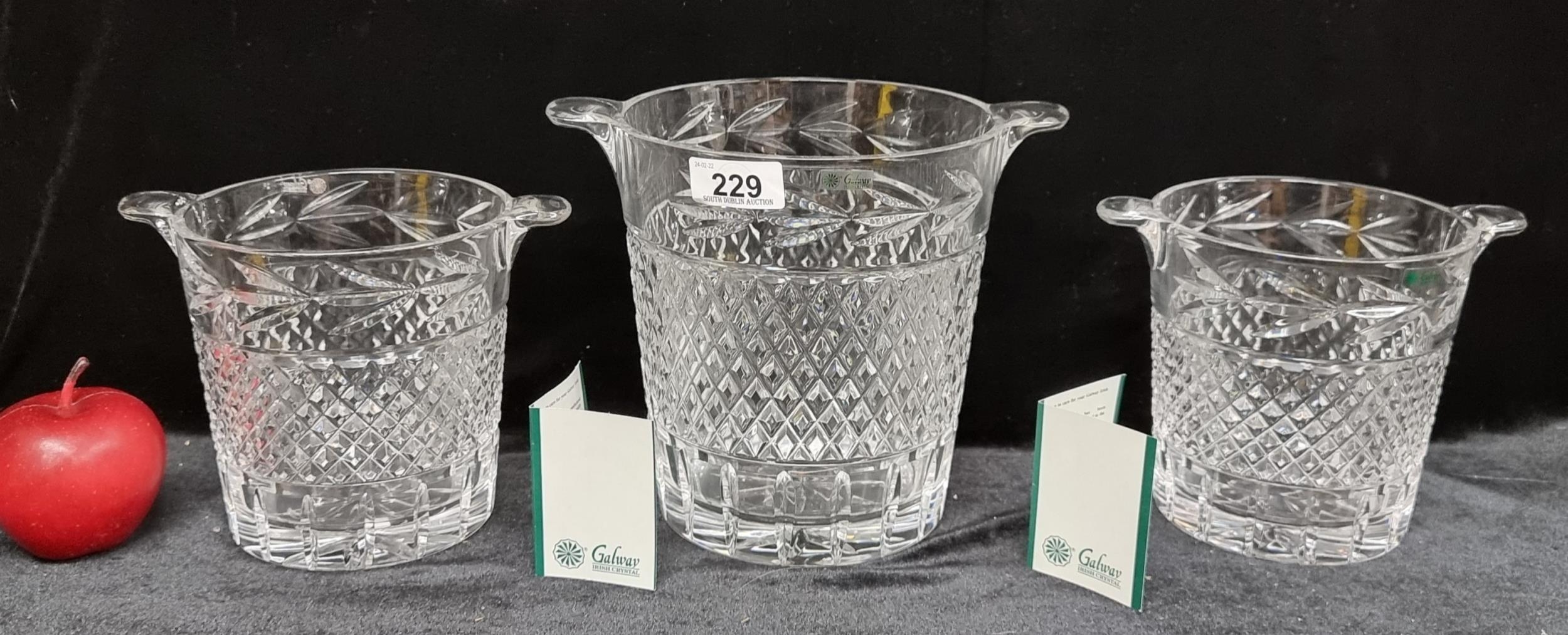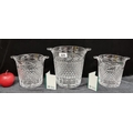 Three Galway Crystal Ice Buckets with a diamond quilt pattern. In good condition. One large example (H19cm) with two smaller ones. (H14cm) In good condition.