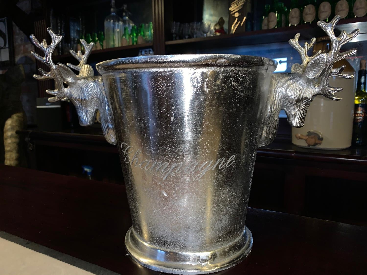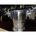 BOXED NEW ANTIQUED RUSTIC NICKEL HEAVY CHAMPAGNE BUCKET WITH STAG HEAD HANDLES