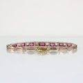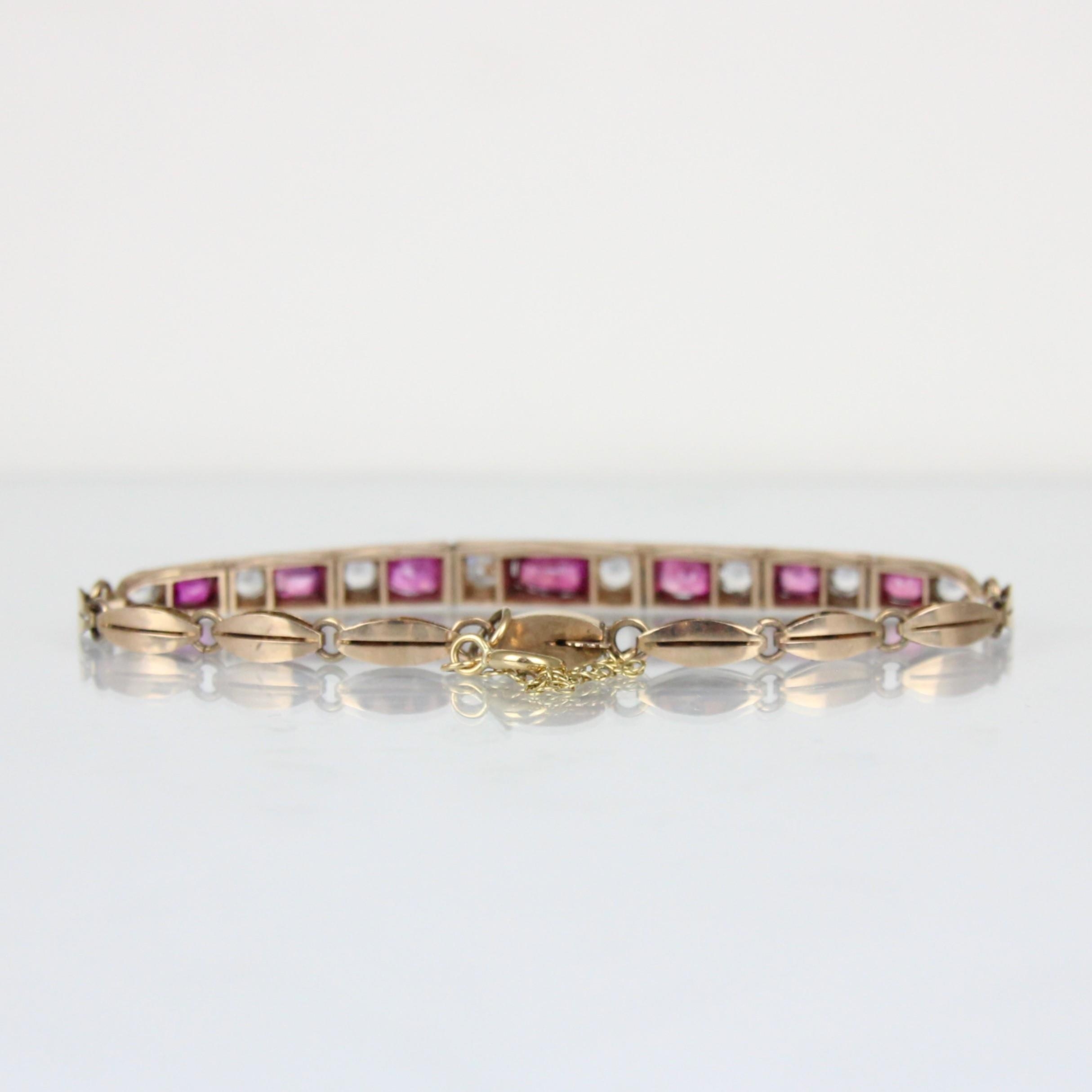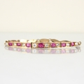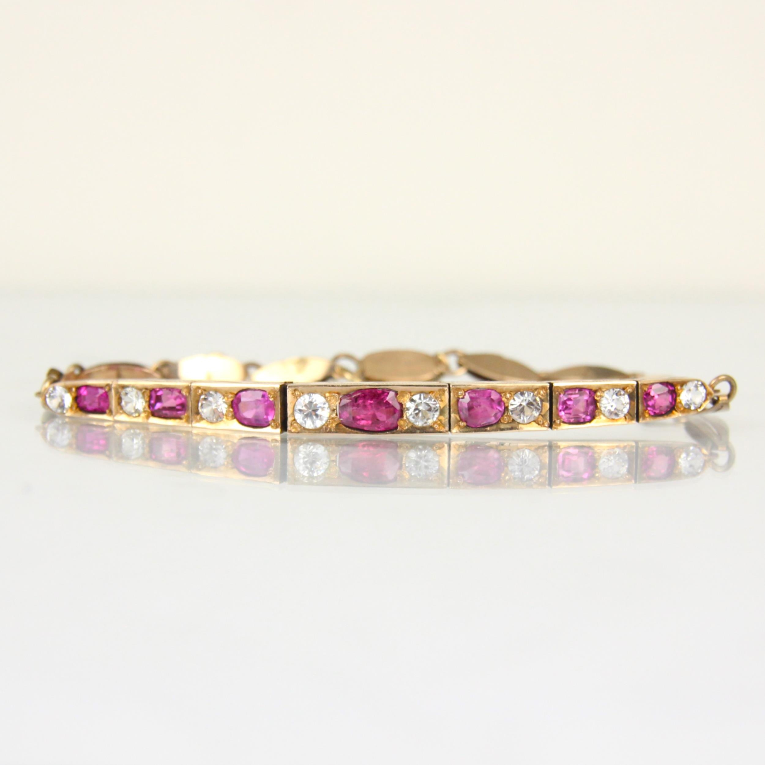 A 20th century untested ruby and white sapphire bracelet, the seven mixed cut untested rubies within a rose coloured metal claw setting edge, with engraved sides, upon a lozenge shaped bracelet with hidden box and tongue fastener, 8gms