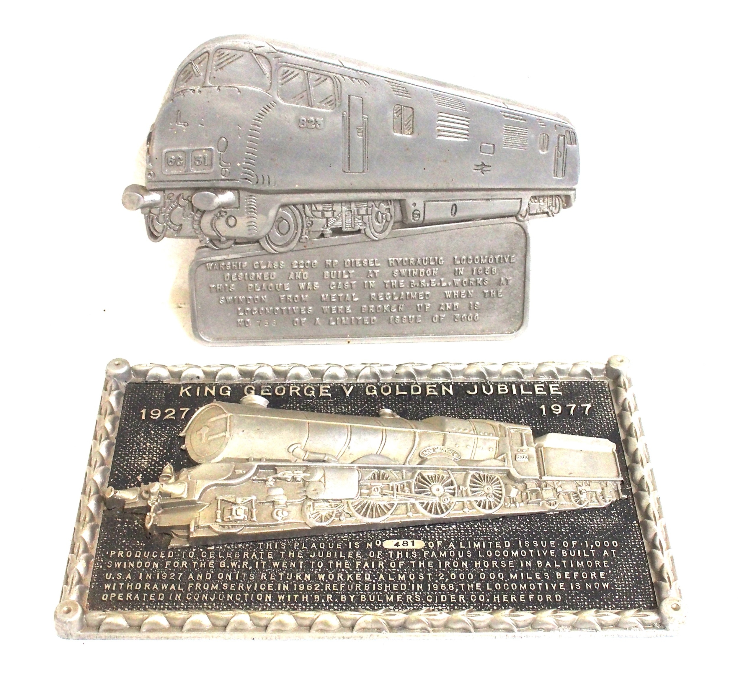 Two Swindon BREL cast alloy plaques - Warship 736/3000 & King George 481/1000, no certificates. (2) (C1X) (Dispatch by Mailboxes/Collect from Banbury Depot)