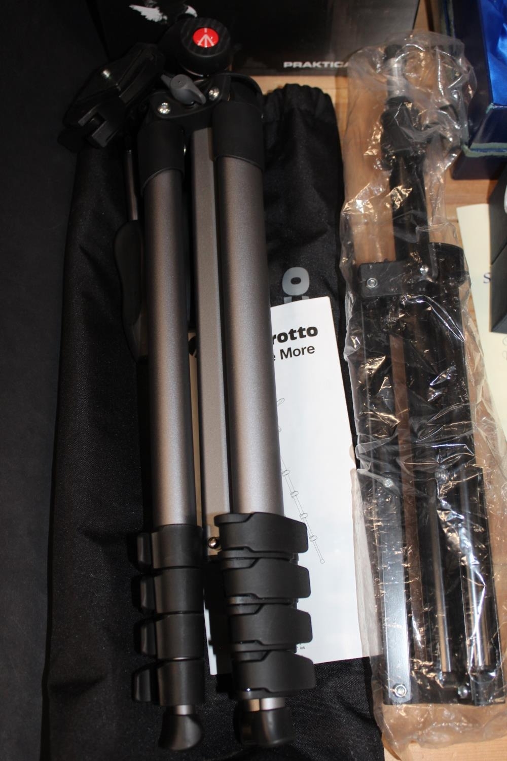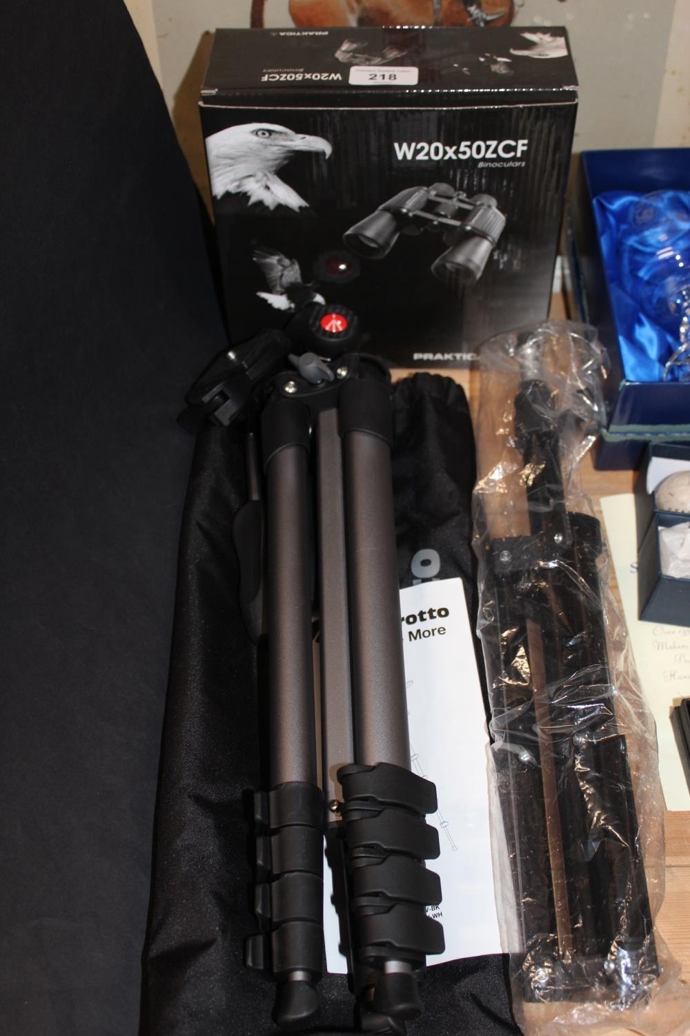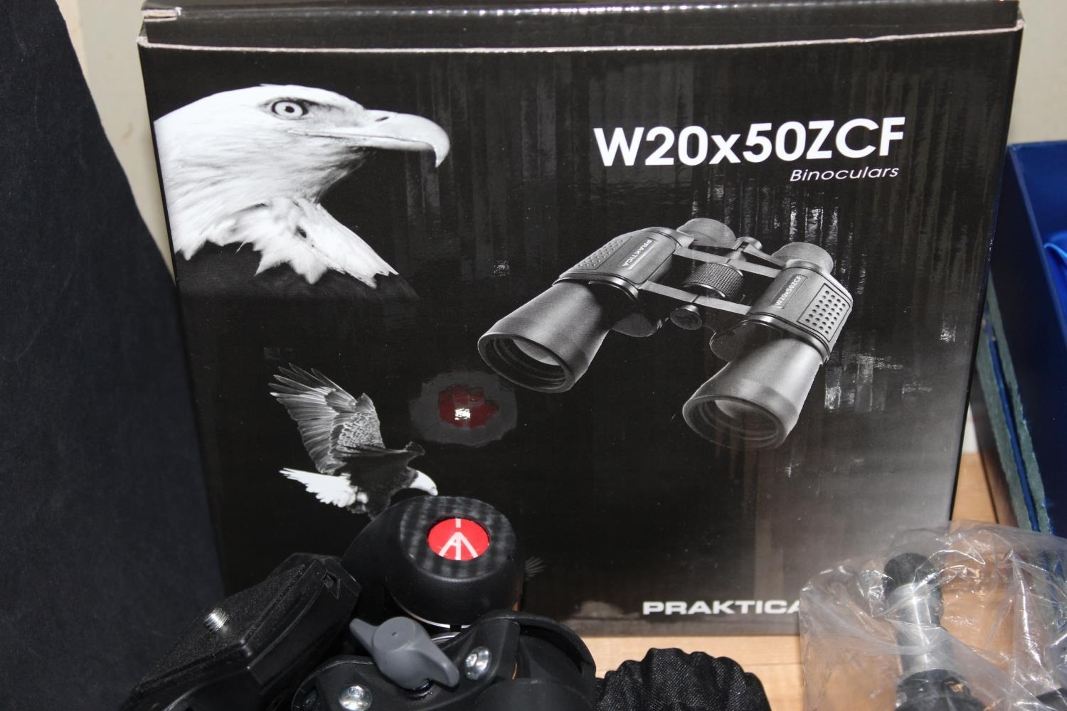Praktica W20x50 ZCF binoculars, boxed, and two tripods.