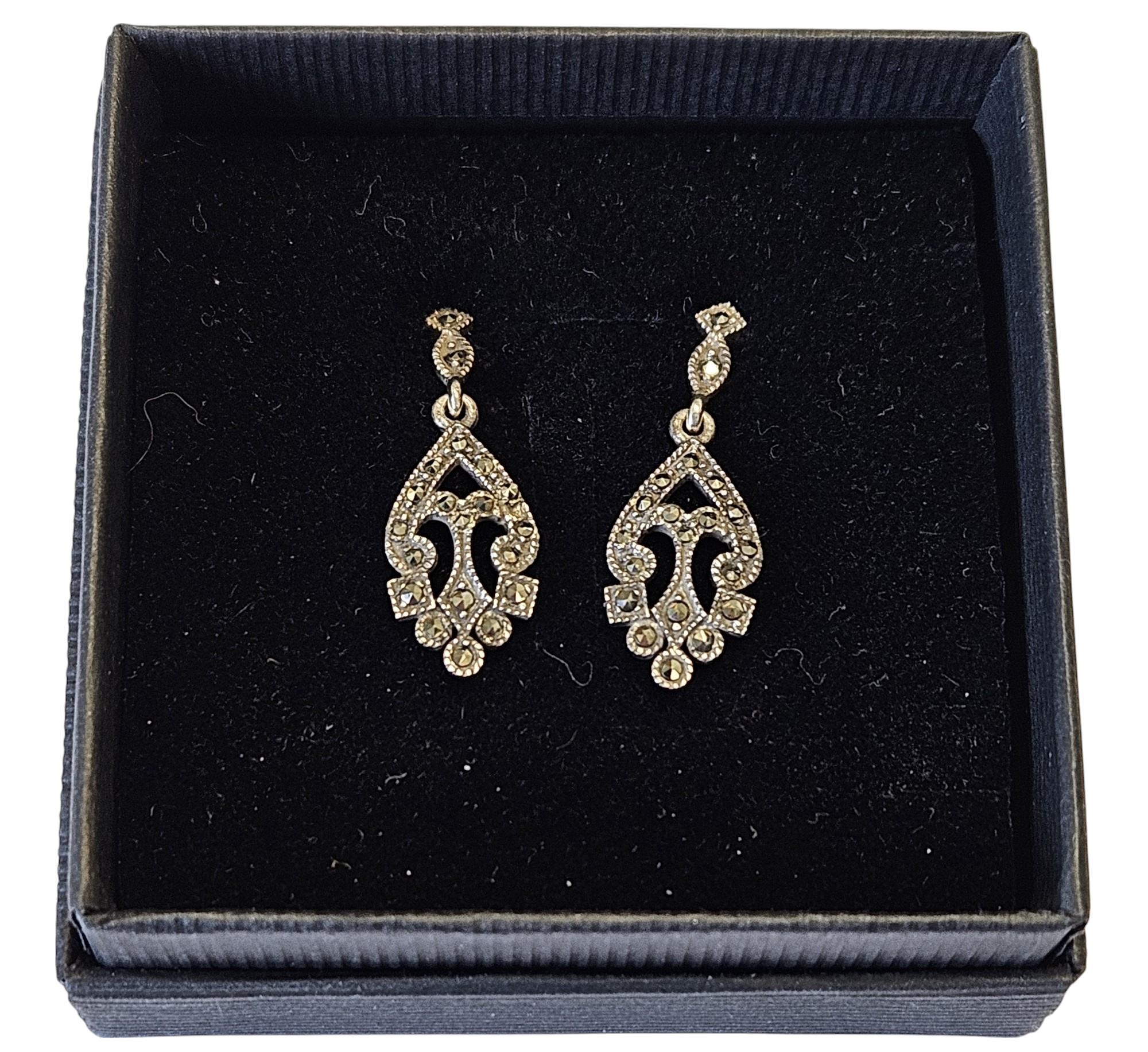 A pair of Silver and Marcasite drop Earrings.