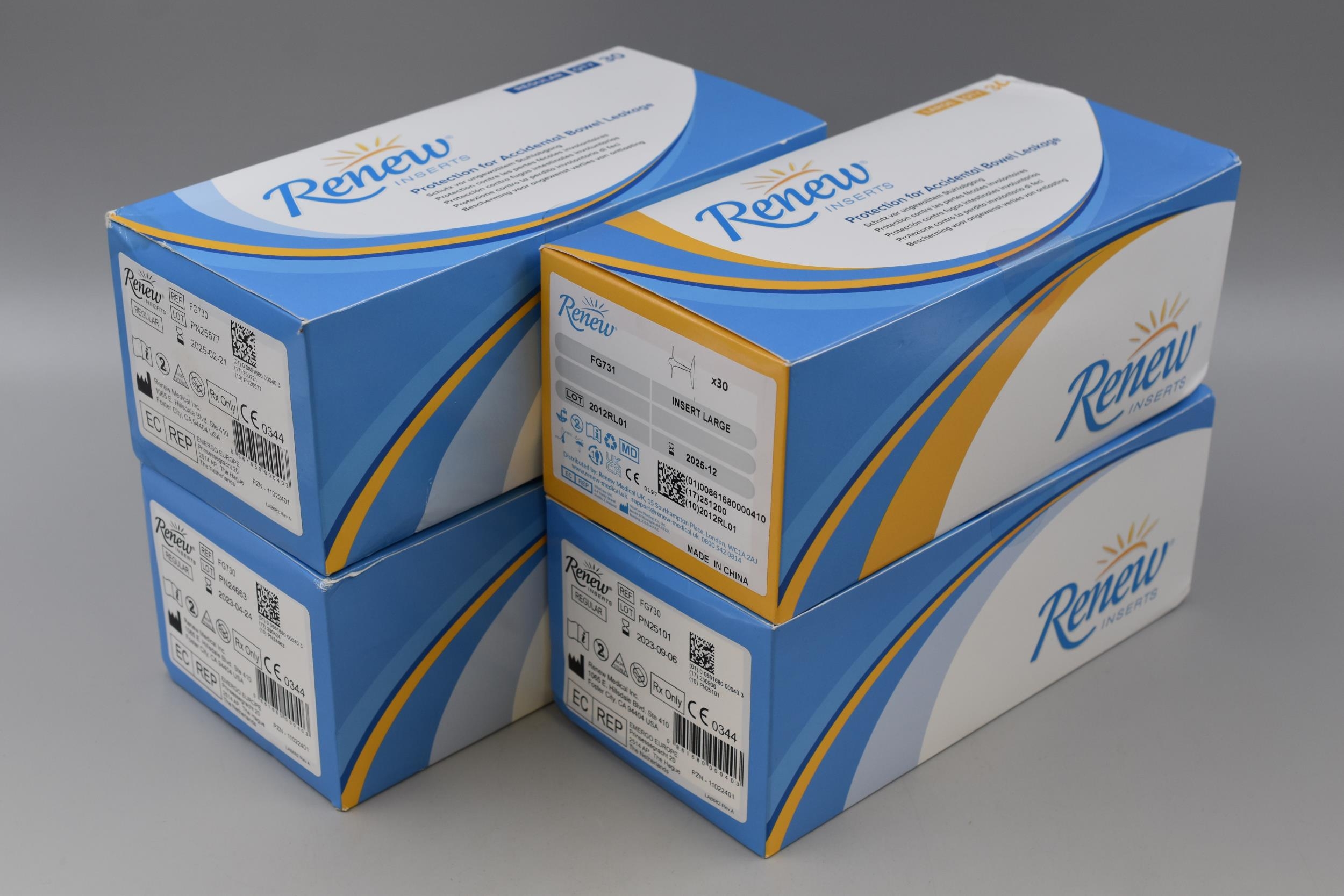 Four Boxes of 30 Renew Inserts for Bowel Leakage (Four Regular / One Large)