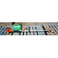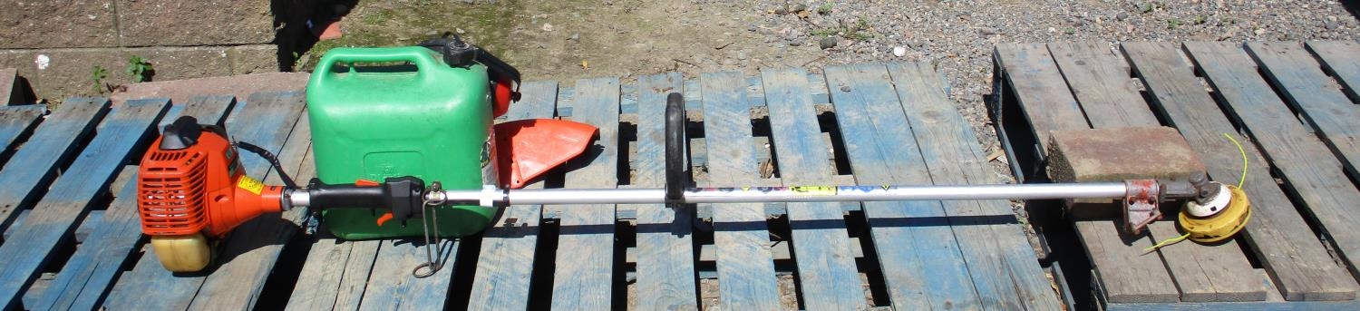 An Echo SRM-2600 petrol pole strimmer together with a fuel tank and a pair of ear defenders