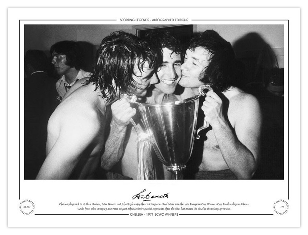 Autographed PETER BONETTI 1971 Limited-Edition : A superbly produced Limited Edition print measuring 16 x 12, depicting Chelsea`s Alan Hudson, PETER BONETTI and John Boyle celebrating with the European Cup Winners Cup in the dressing room following a memorable 2-1 victory over Real Madrid in the 1971 Final in Athens, limited to just 75 editions it has been signed to the lower border in fine black marker.
