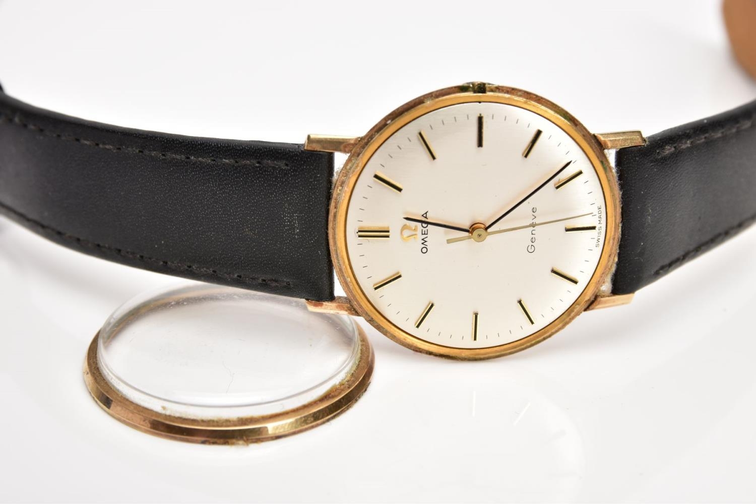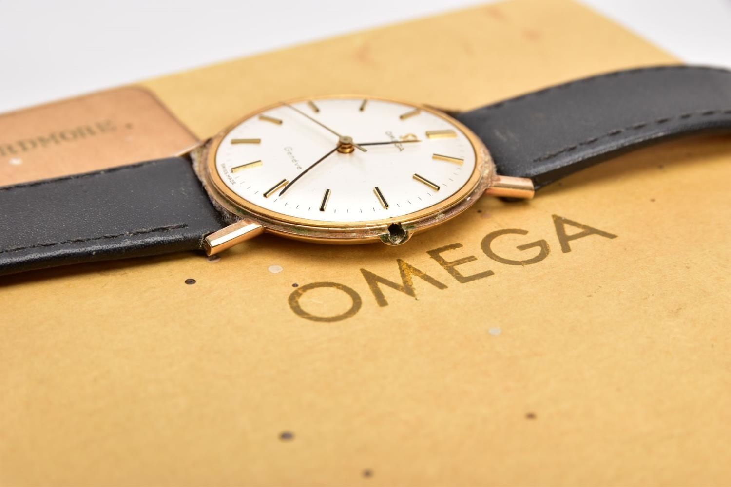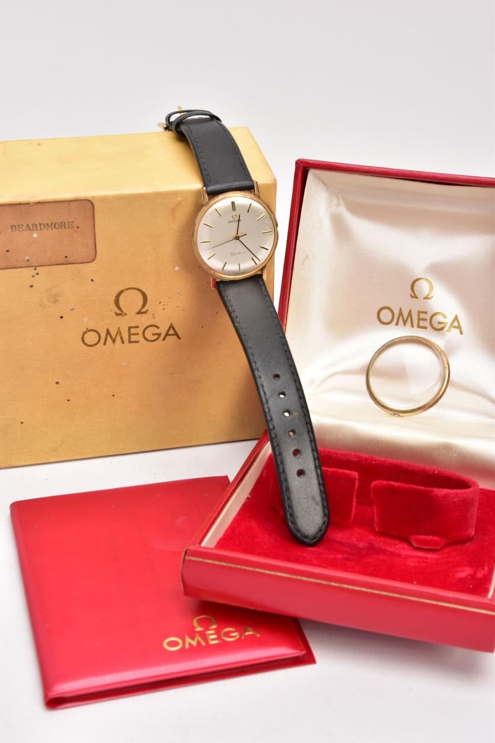 A GENTS 9CT GOLD 'OMEGA GENEVE' WRISTWATCH, (missing crown) round silver dial signed 'Omega Geneve', baton markers, black hands, within a plain polished case, case back engraved 'Presented to H. Beardmore, for 40 years' service, Crittall-Hope Ltd 1969', approximate case width 28.6mm, fitted with a black strap and a yellow metal ardillon buckle, together with an original 'Omega' fitted box, paper work and an outer box (condition report: crown is missing so unable to see if the watch winds, general light wear all round, some surface scratches to the glass, overall condition good)