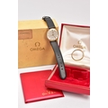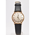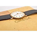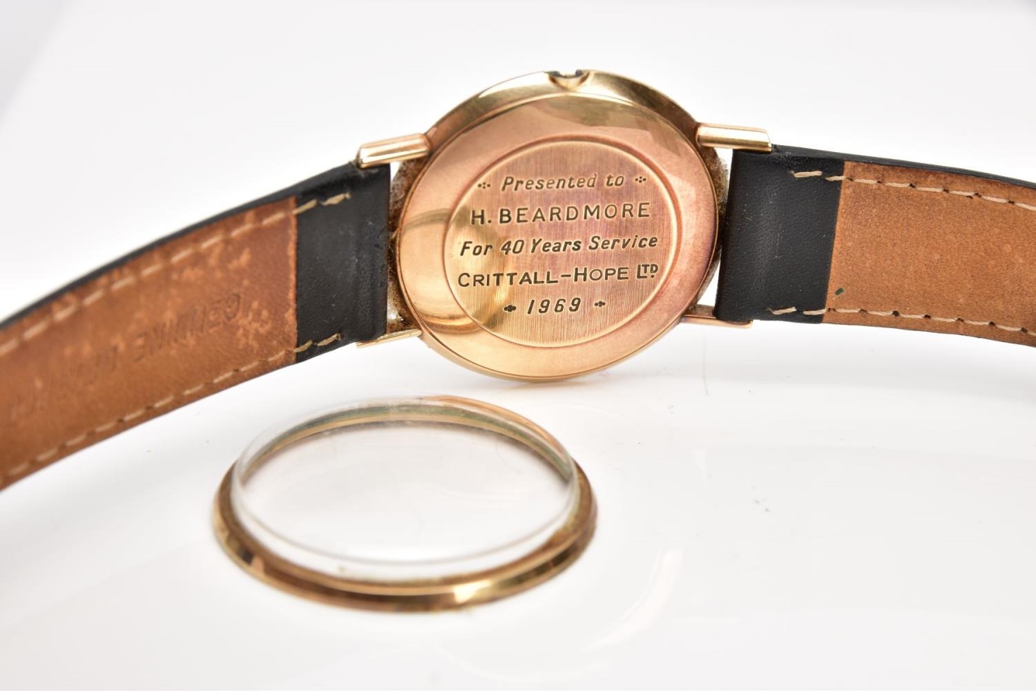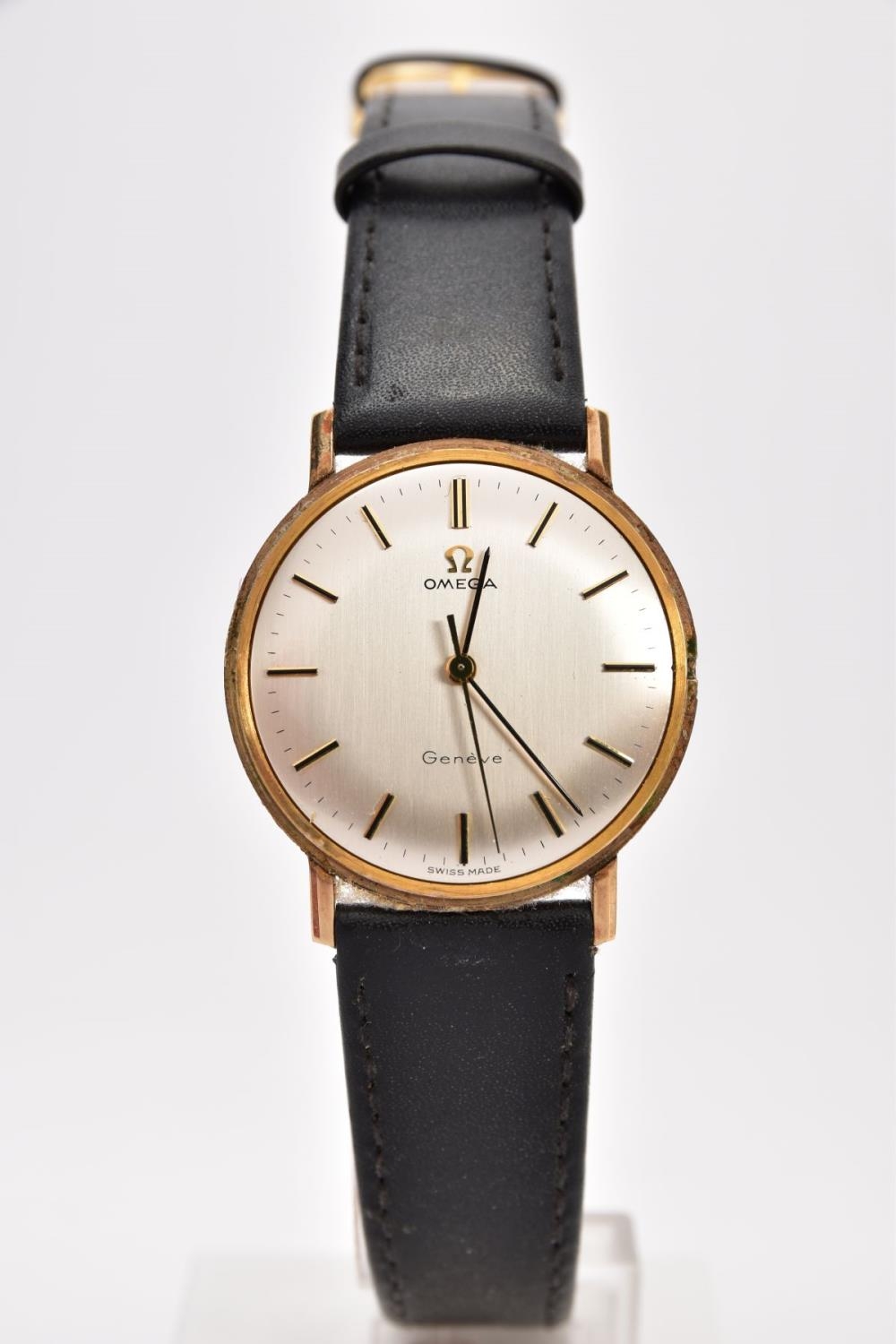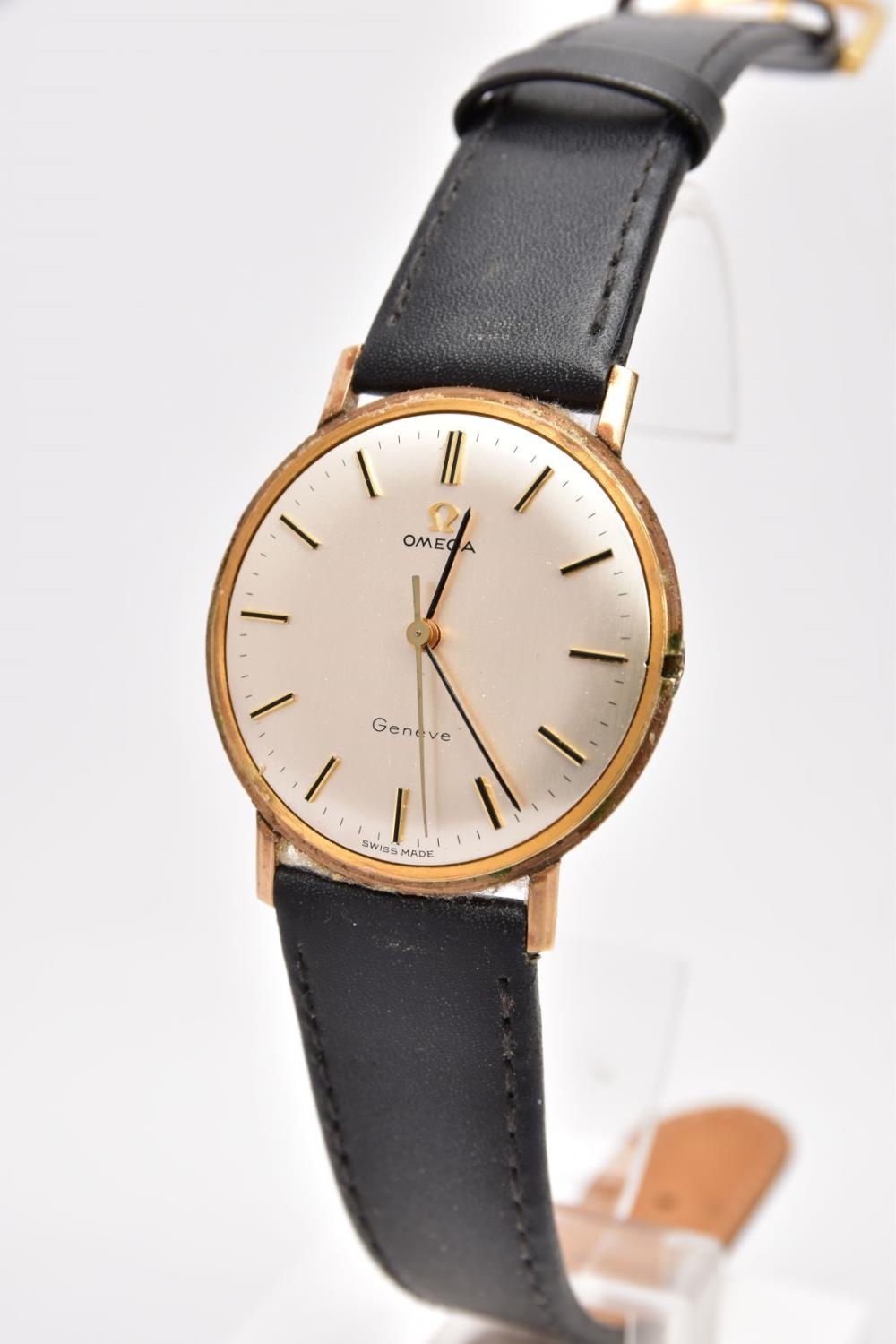 A GENTS 9CT GOLD 'OMEGA GENEVE' WRISTWATCH, (missing crown) round silver dial signed 'Omega Geneve', baton markers, black hands, within a plain polished case, case back engraved 'Presented to H. Beardmore, for 40 years' service, Crittall-Hope Ltd 1969', approximate case width 28.6mm, fitted with a black strap and a yellow metal ardillon buckle, together with an original 'Omega' fitted box, paper work and an outer box (condition report: crown is missing so unable to see if the watch winds, general light wear all round, some surface scratches to the glass, overall condition good)