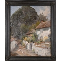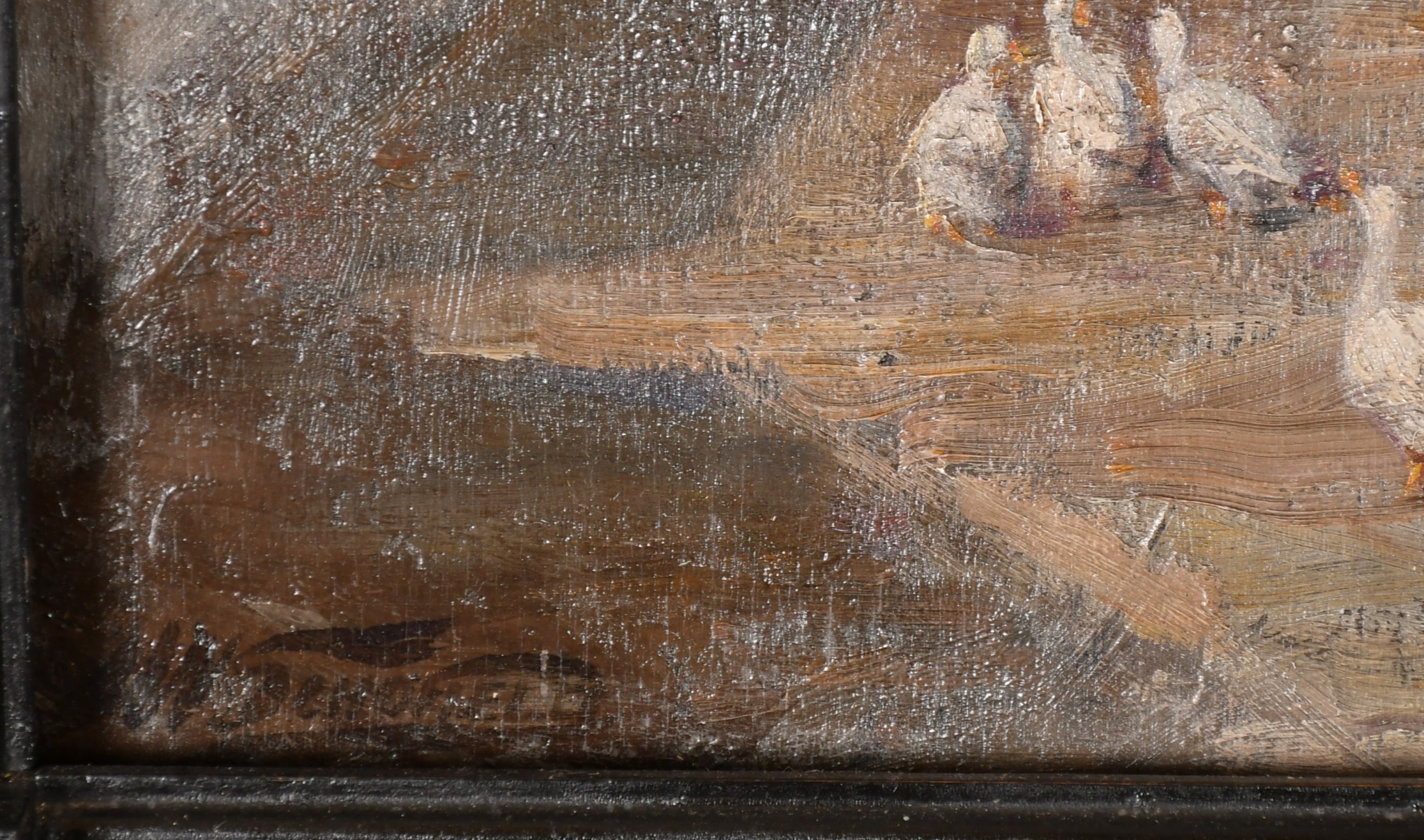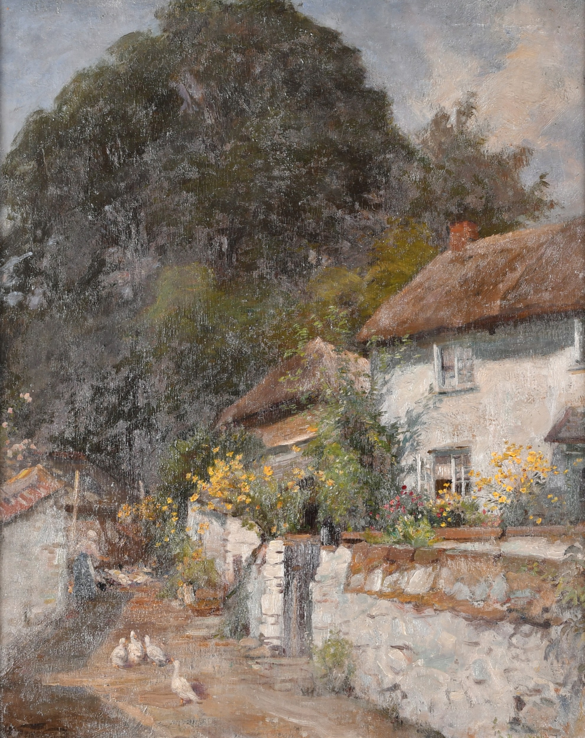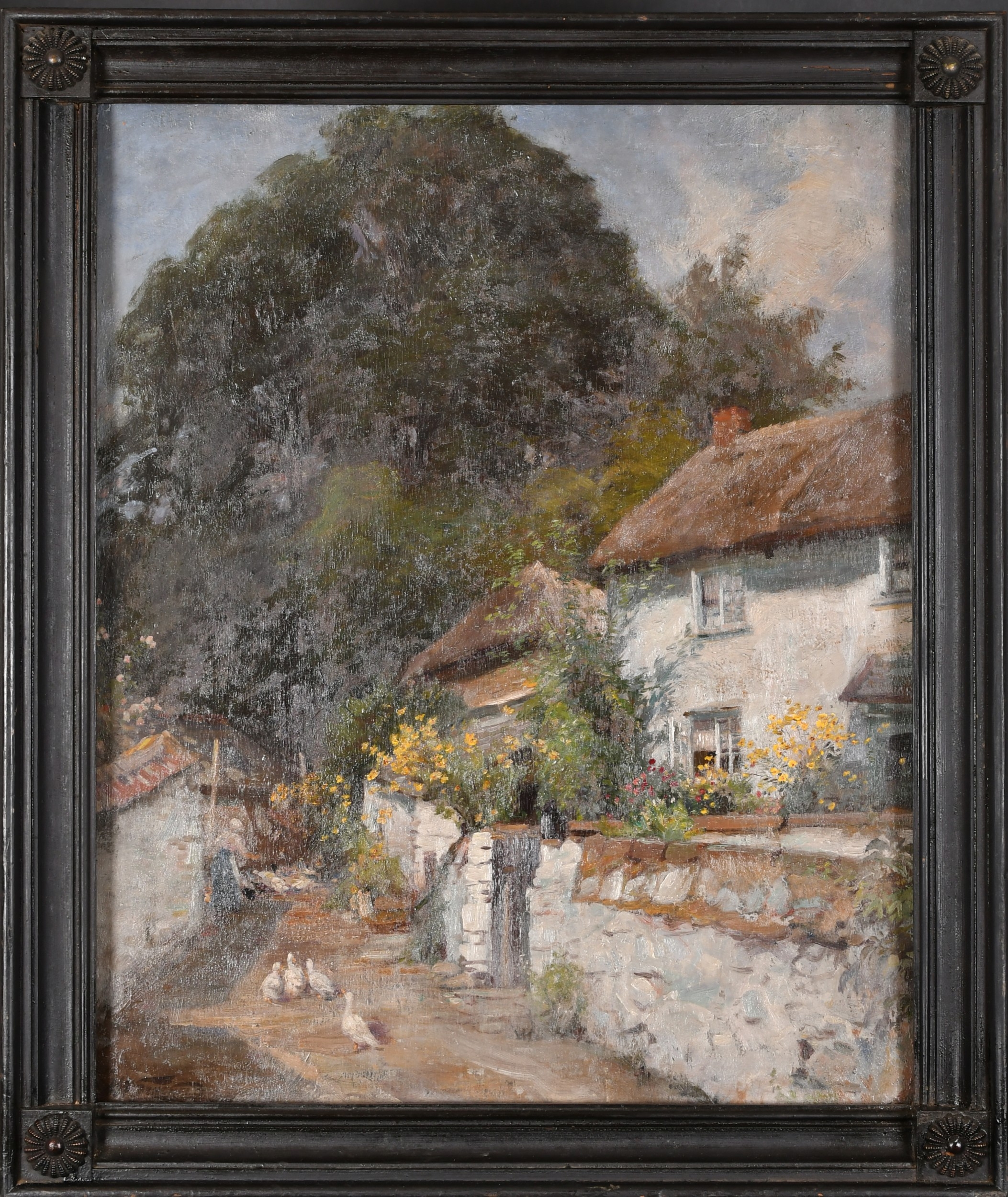 John William Schofield (1865-1944) British. Ducks by a Thatched Cottage, Oil on panel, Signed, 26" x 21.25" (66 x 54cm)