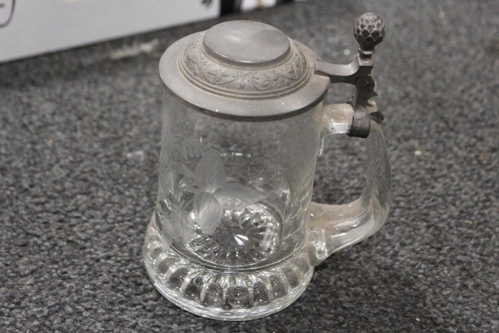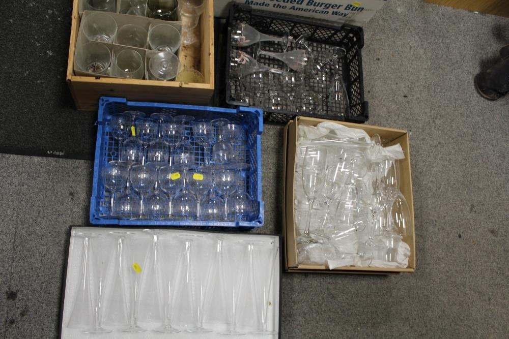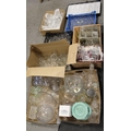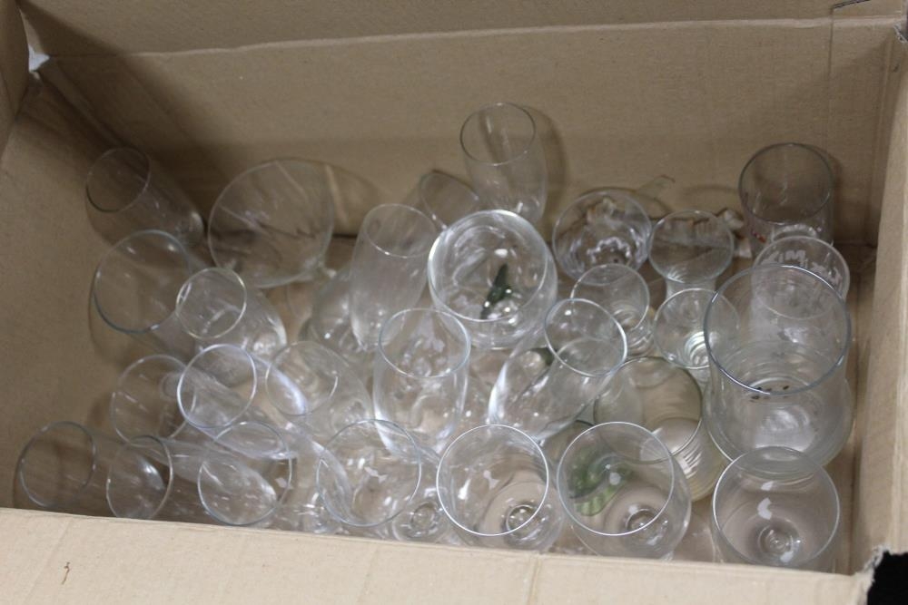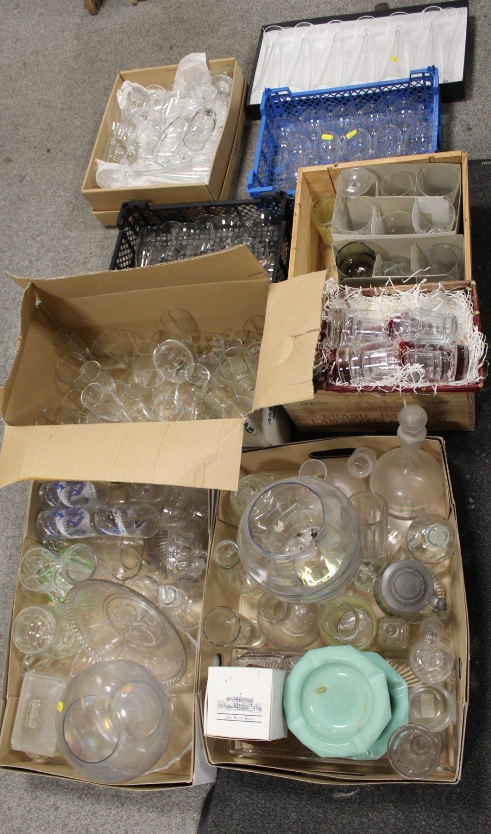 A LARGE QUANTITY OF ASSORTED DRINKING GLASSES ETC., to include a pewter tolled etched glass tankard, hand painted examples etc. (8 boxes in total)