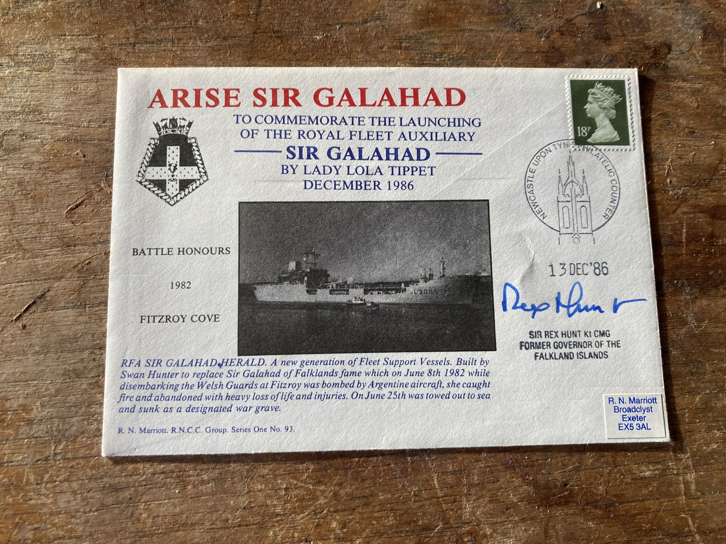Falklands War Royal Navy "Arise Sir Galahad" cover to commem the launching of the Royal Fleet Auxiliary Sir Galahad by Lady Lola Tippet Dec 1986 signed Sir Rex Hunt Former Gov of the Falkland Islands Naval FDC. Single Vendor collection. Good condition. We combine postage on multiple winning lots and can ship worldwide. UK postage from £5.99, EU from £7.99, Rest of World from £9.99.